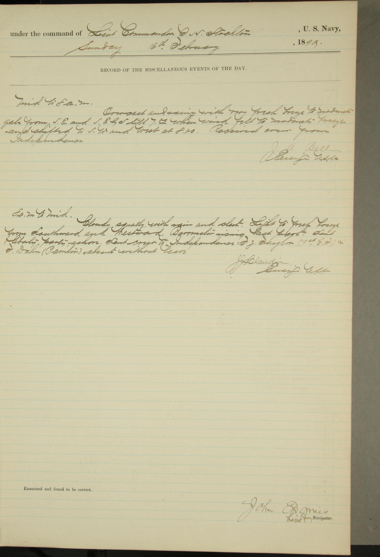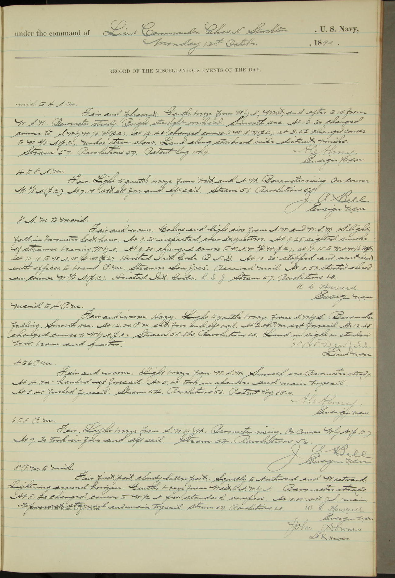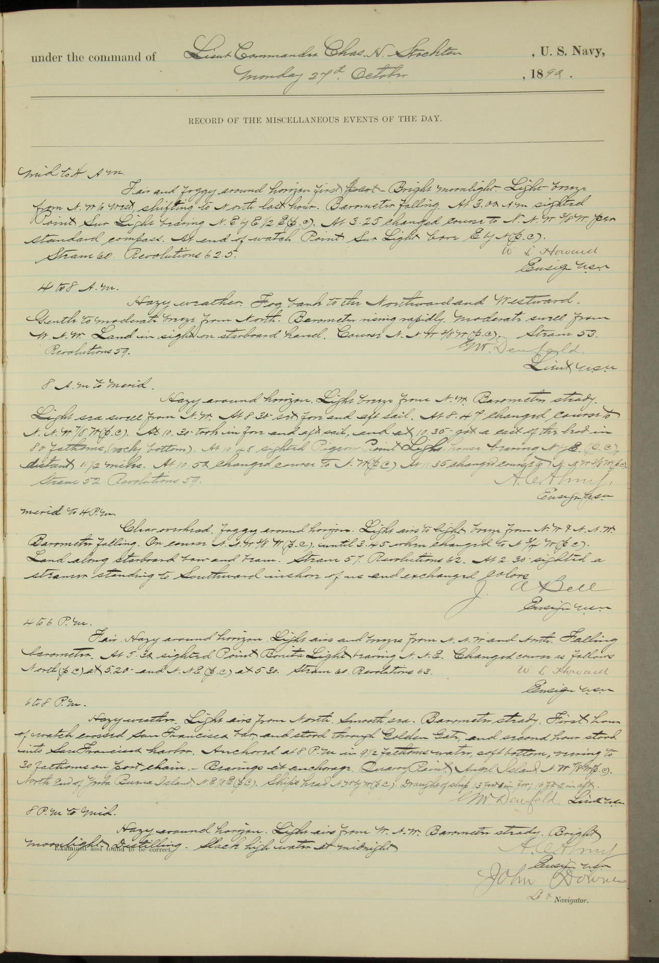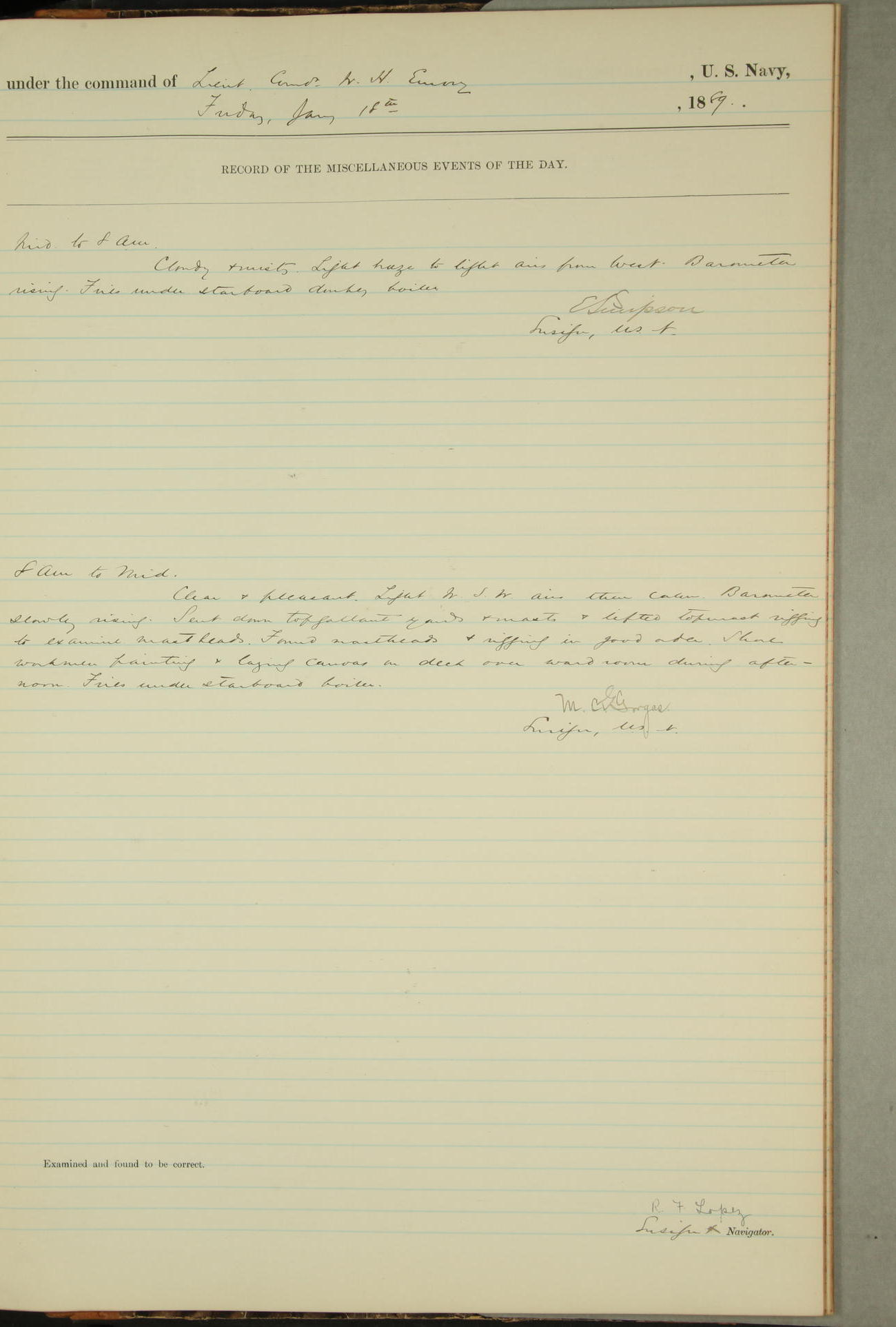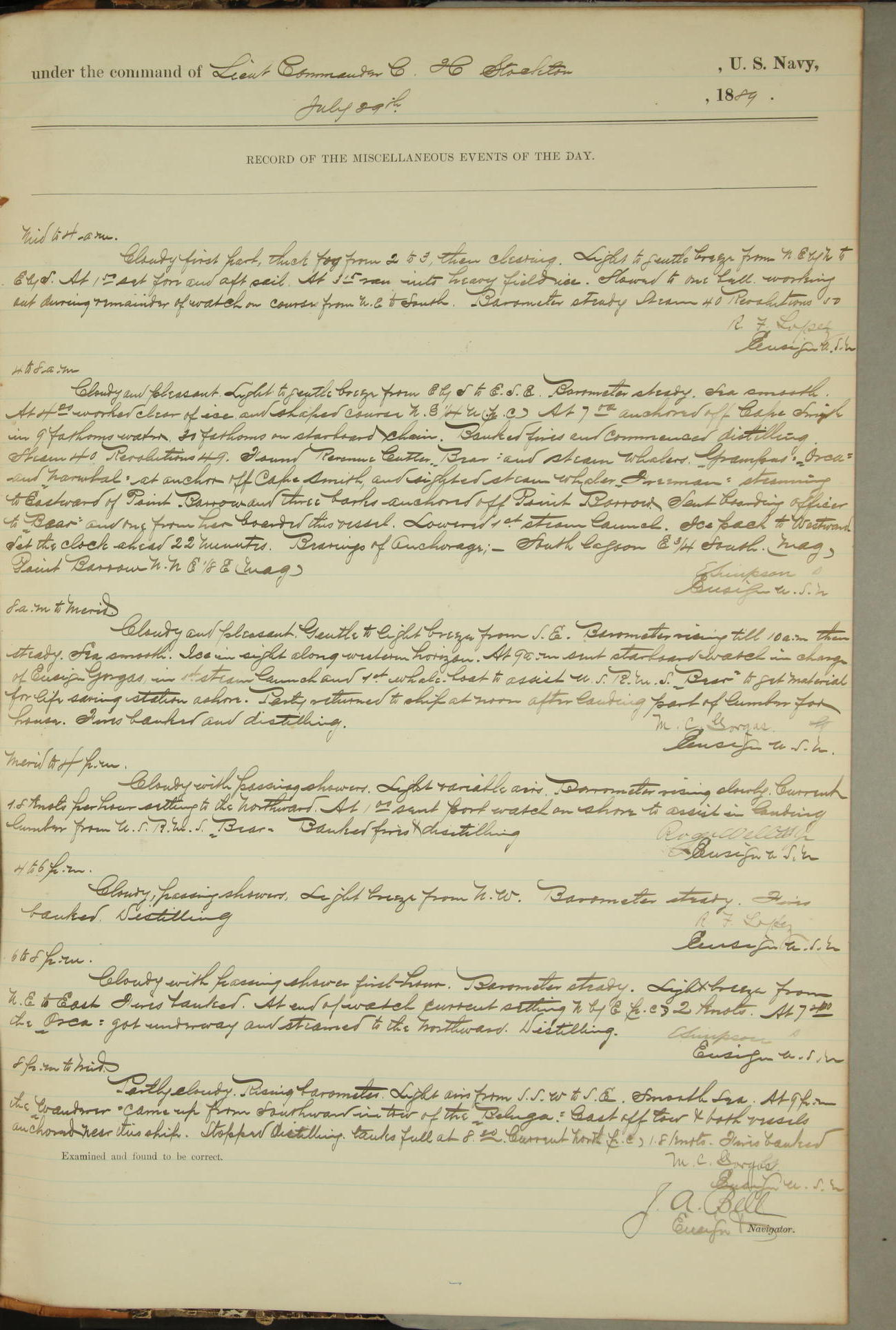 JA Dearborn - At 10am a Summary Court composed of Ensigns Simpson, Gorgas & Dewey as members with Asst Paymaster Lovell as Recorder convened for the tial of JA Dearborn (CH). The court adjourned at 11.20 to await the action of the Comd'g Officer.