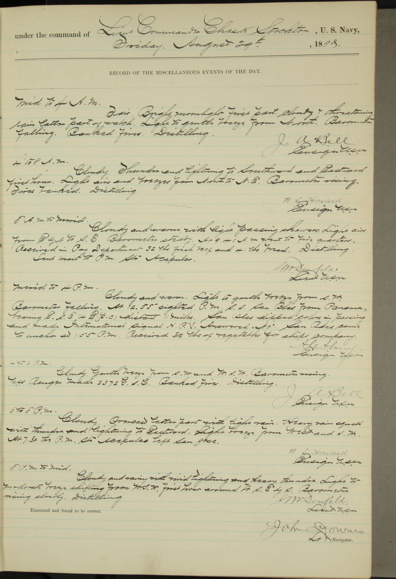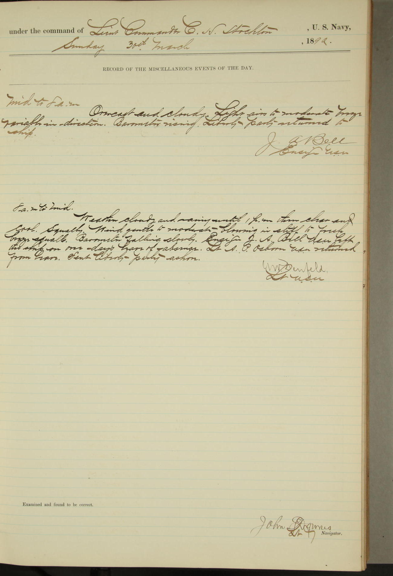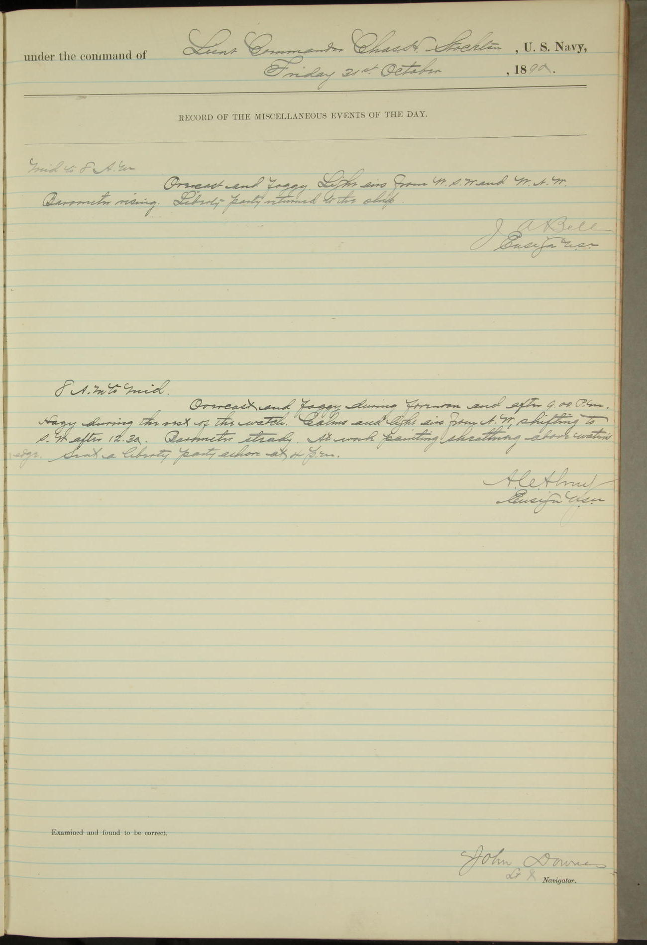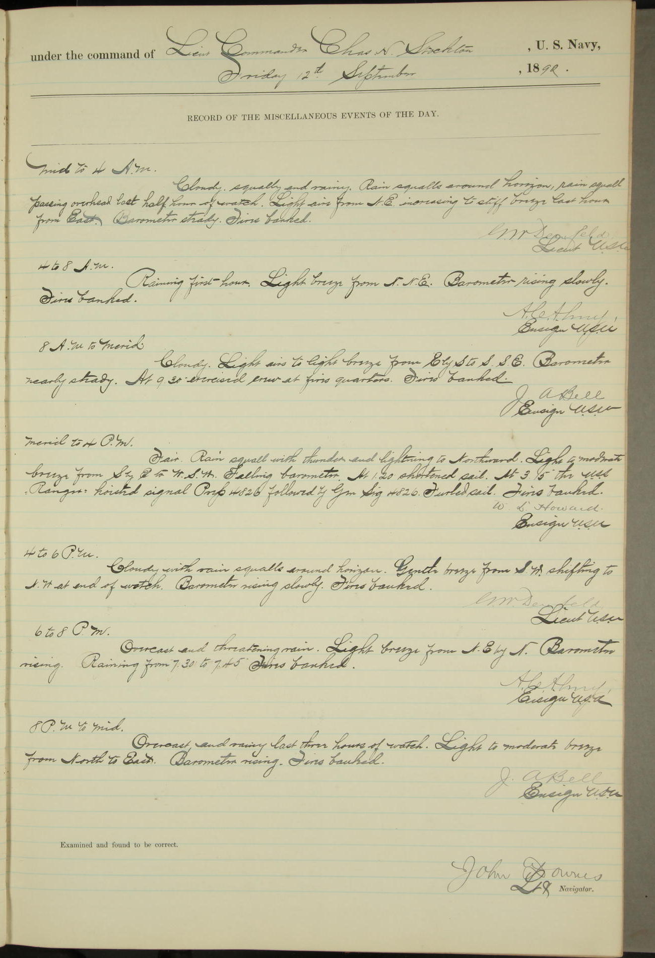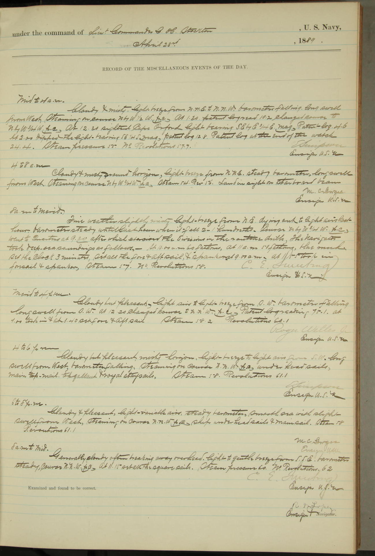JA Dearborn - At 10am a Summary Court composed of Ensigns Simpson, Gorgas & Dewey as members with Asst Paymaster Lovell as Recorder convened for the tial of JA Dearborn (CH). The court adjourned at 11.20 to await the action of the Comd'g Officer.