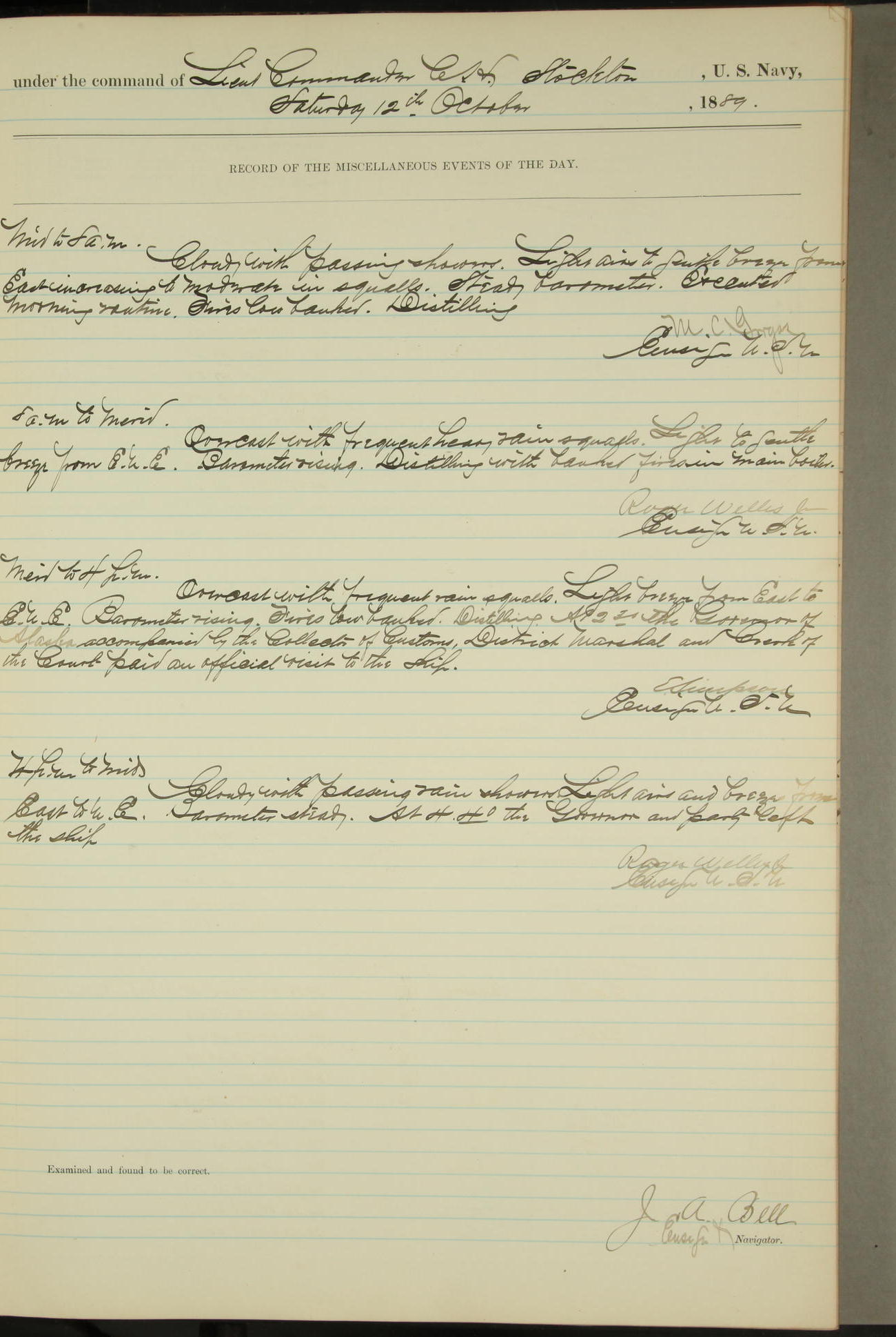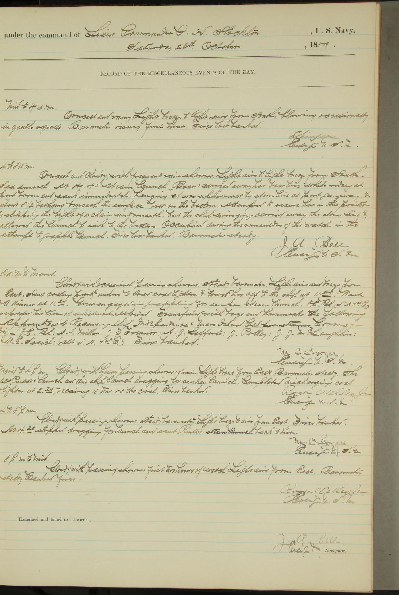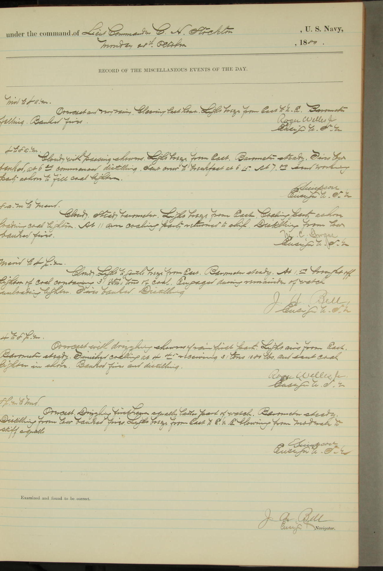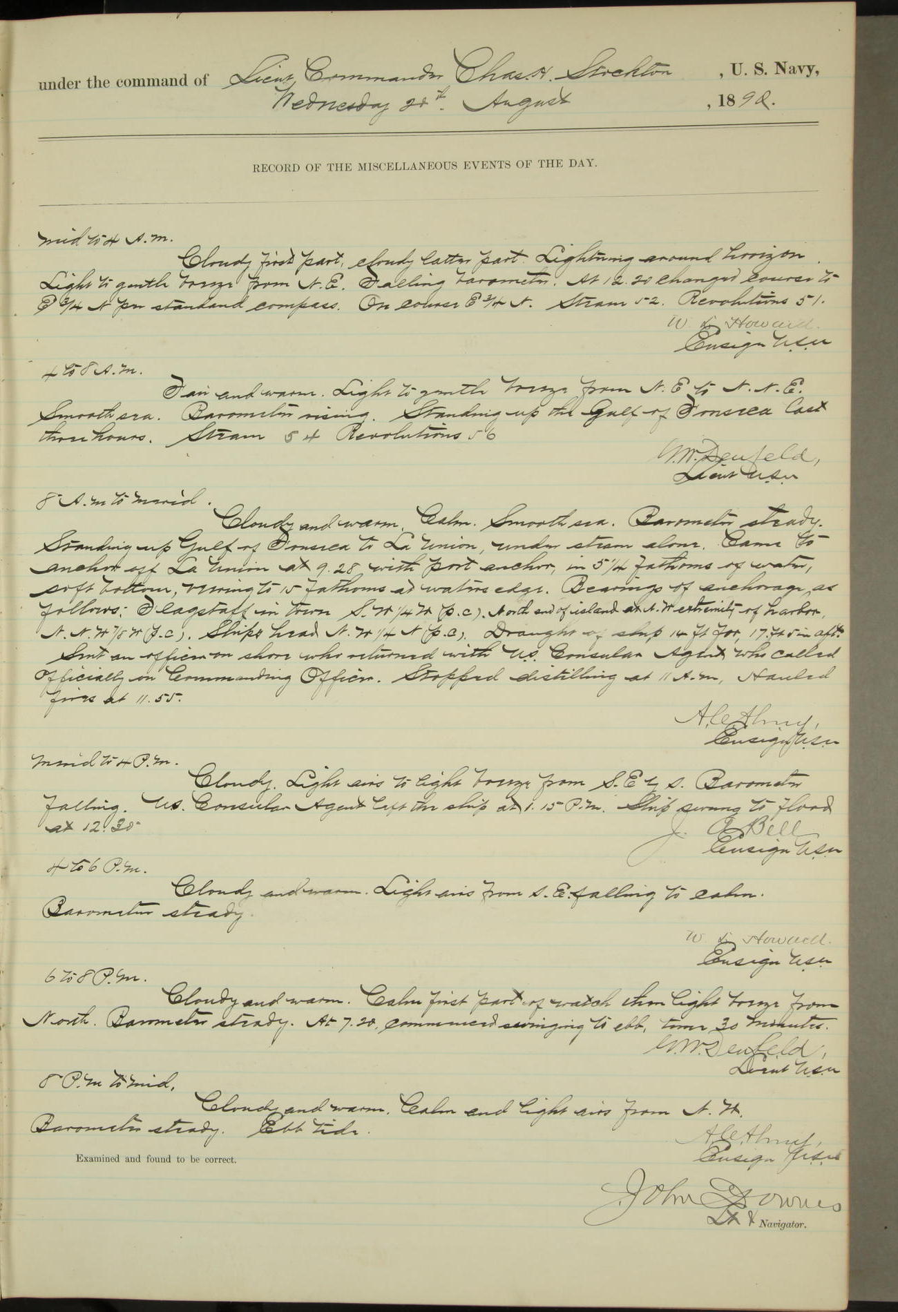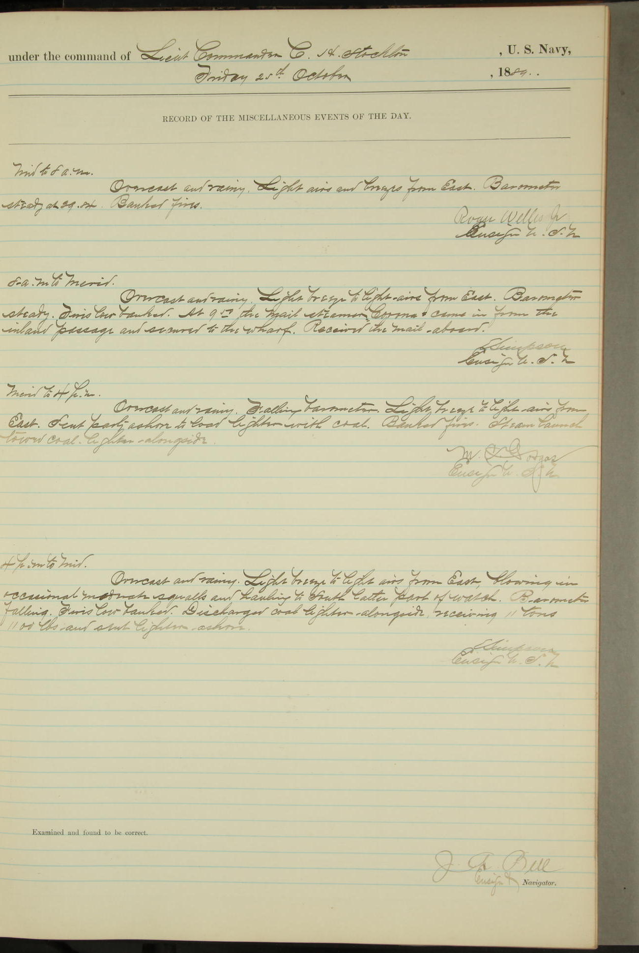 JA Dearborn - At 10am a Summary Court composed of Ensigns Simpson, Gorgas & Dewey as members with Asst Paymaster Lovell as Recorder convened for the tial of JA Dearborn (CH). The court adjourned at 11.20 to await the action of the Comd'g Officer.