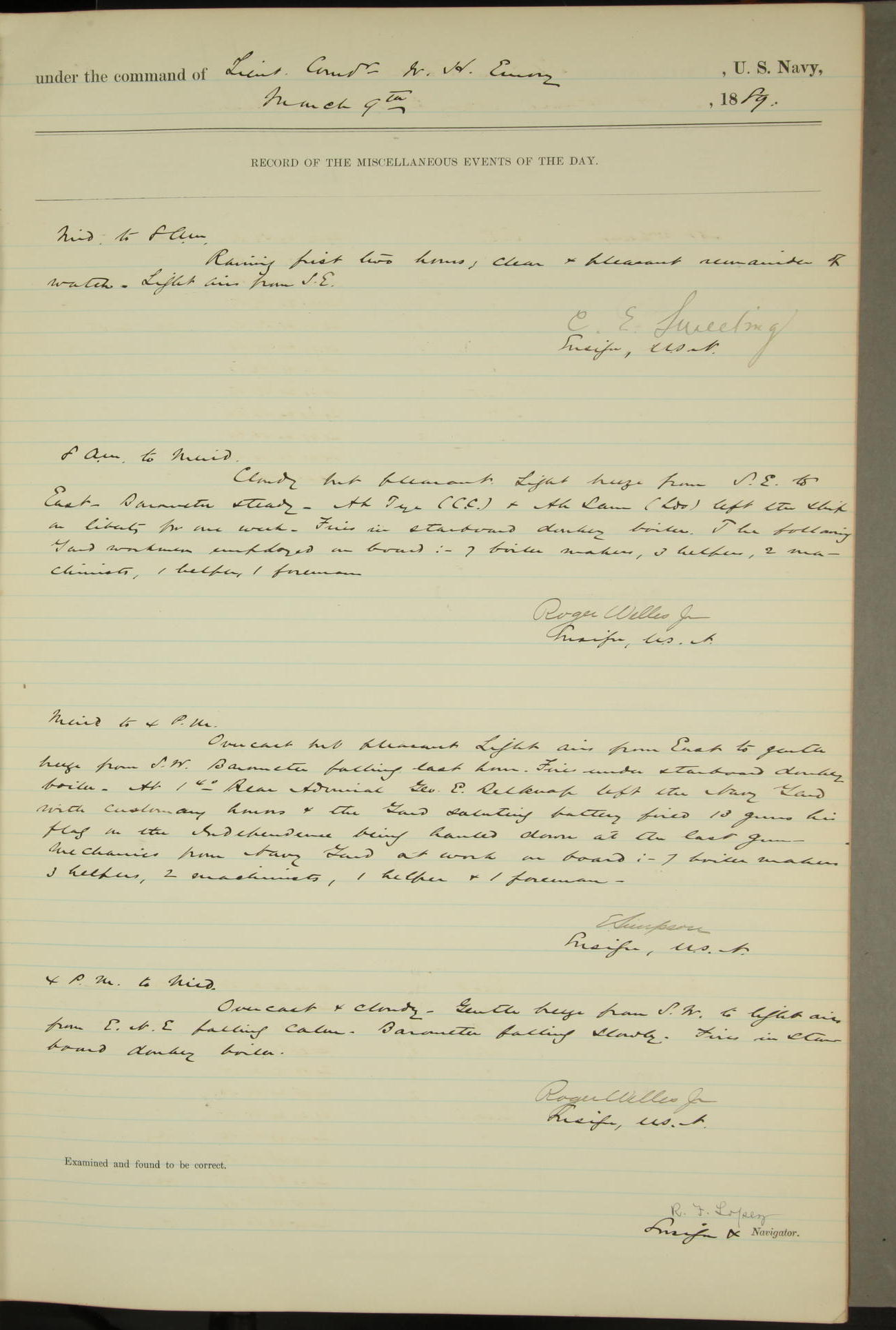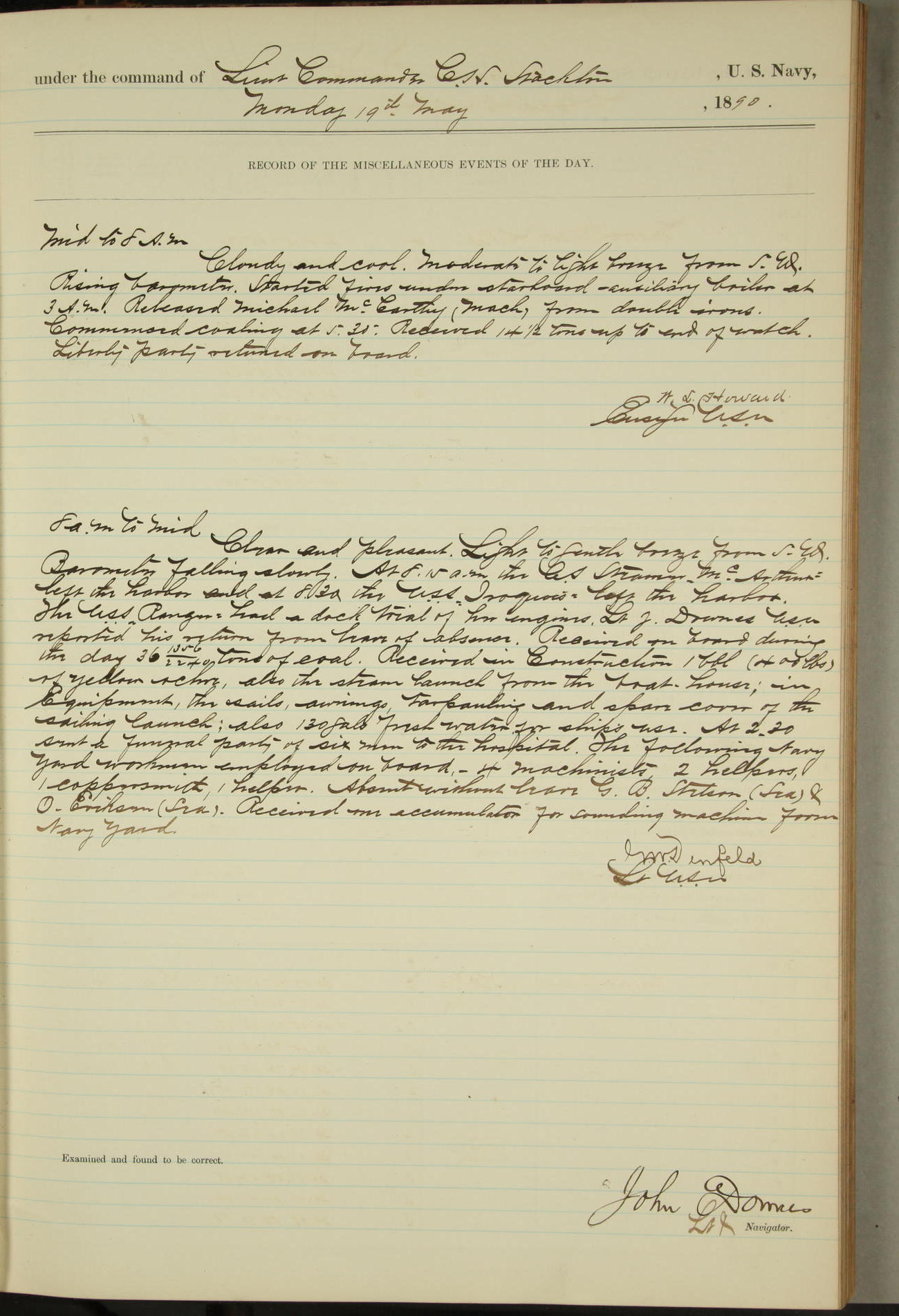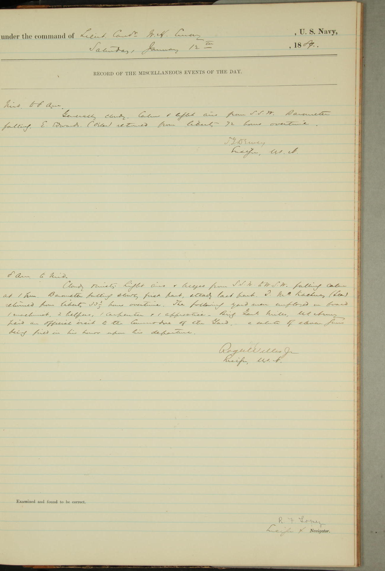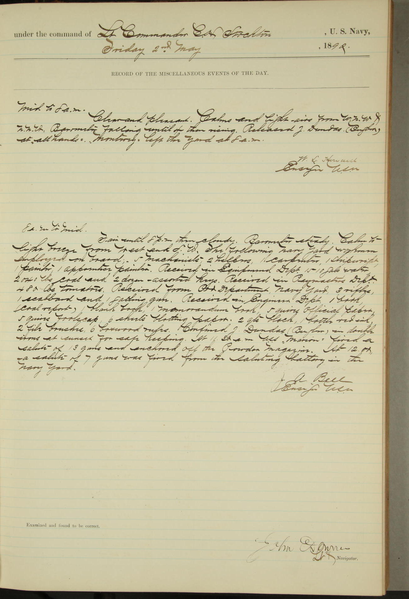 T. McKachury (Sea) returned from liberty 33 2/3 hours overtime. The following yard men employed on board 1 machinist, 2 helpers, 1 carpenter & 1 apprentice. Brig. Genl. Miles, US Army paid an official visit to the Commodore of the Yard, a salute of eleven guns being fired in his honor upon his departure.