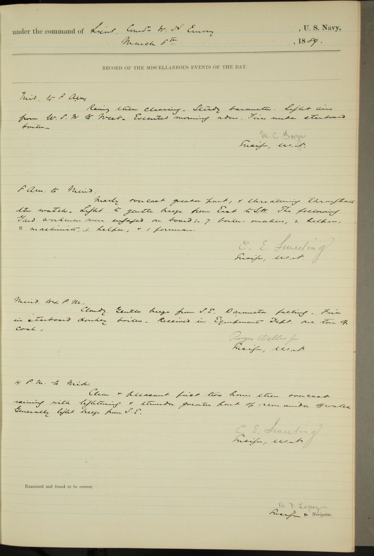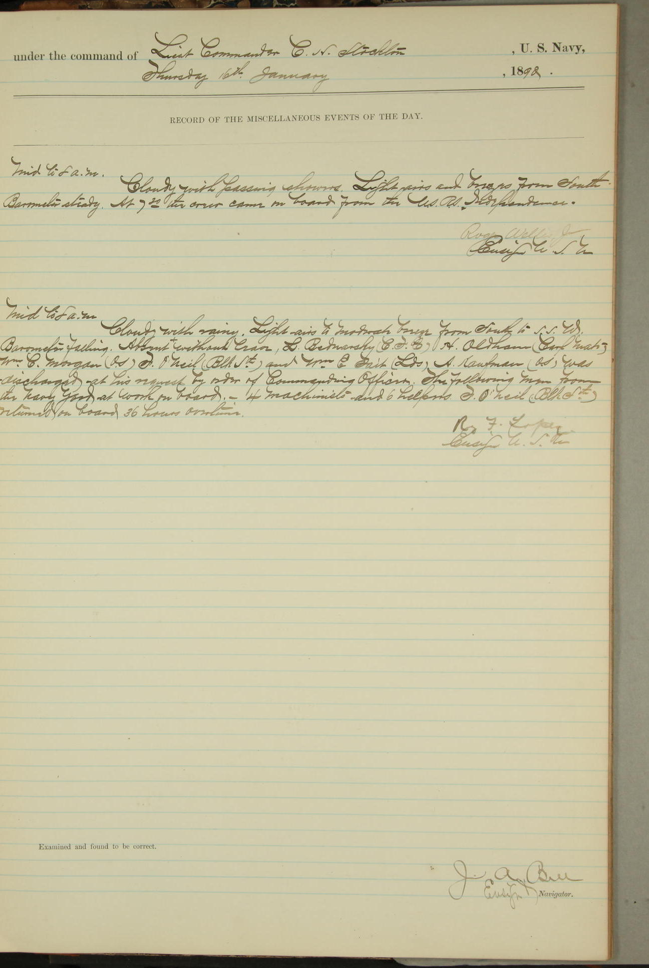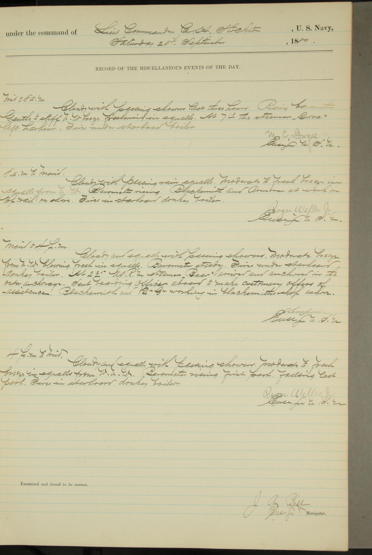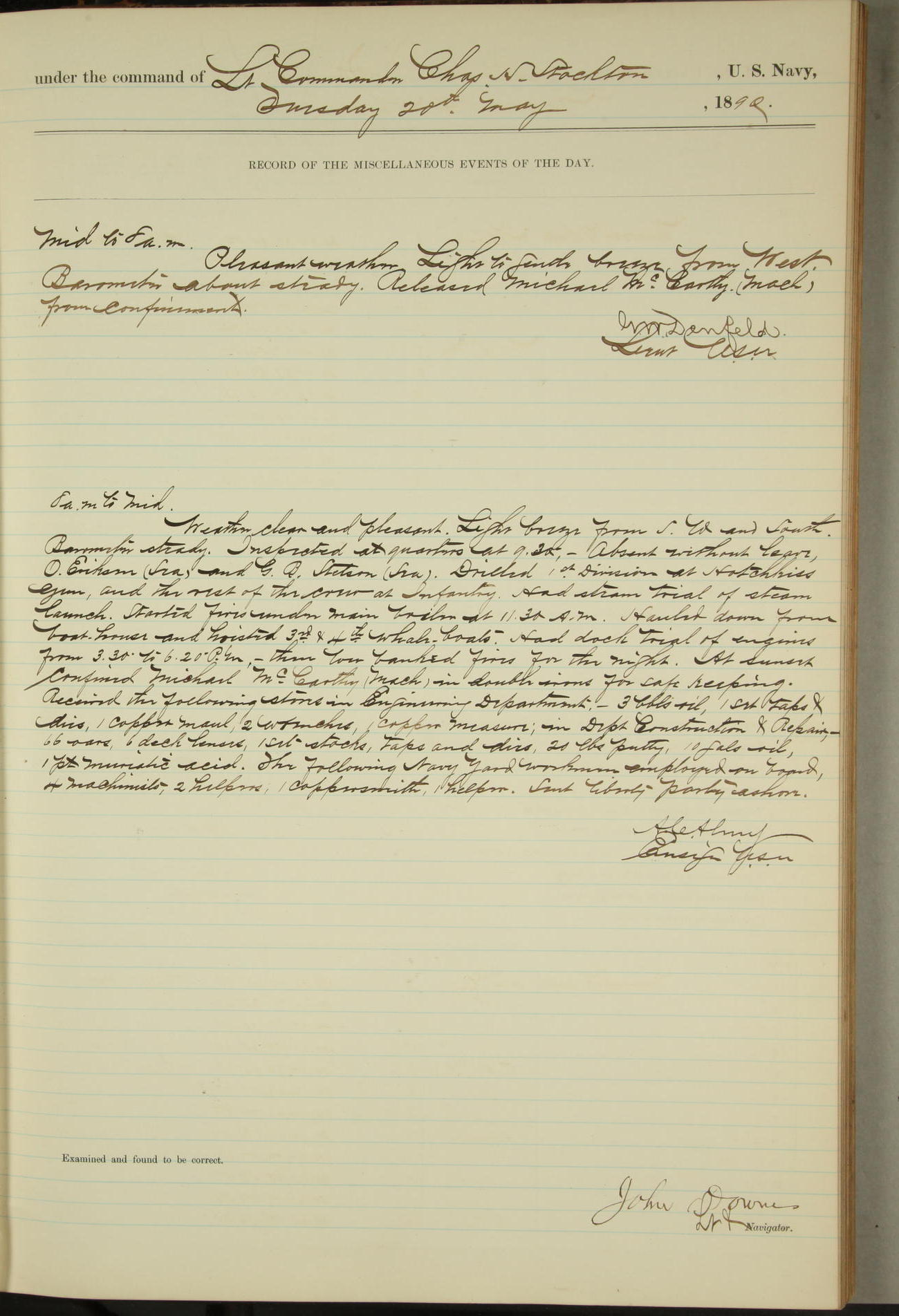 T. McKachury (Sea) returned from liberty 33 2/3 hours overtime. The following yard men employed on board 1 machinist, 2 helpers, 1 carpenter & 1 apprentice. Brig. Genl. Miles, US Army paid an official visit to the Commodore of the Yard, a salute of eleven guns being fired in his honor upon his departure.
