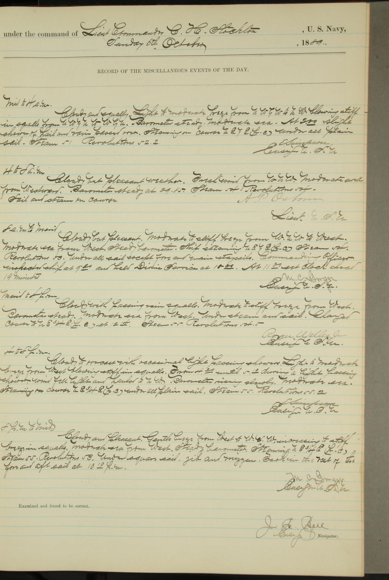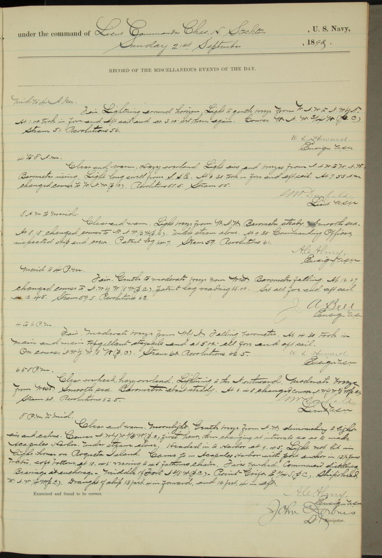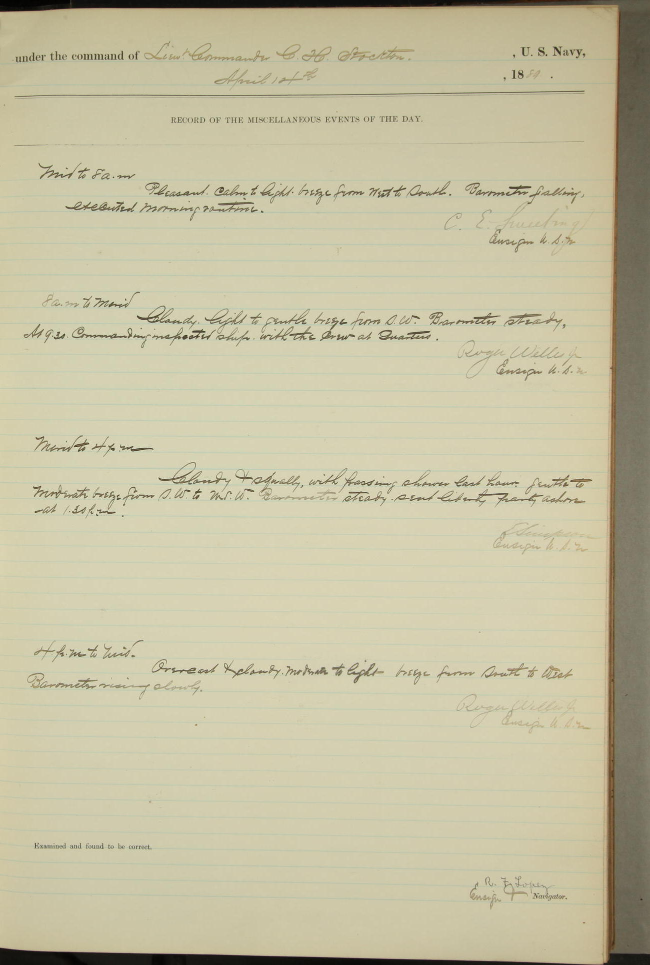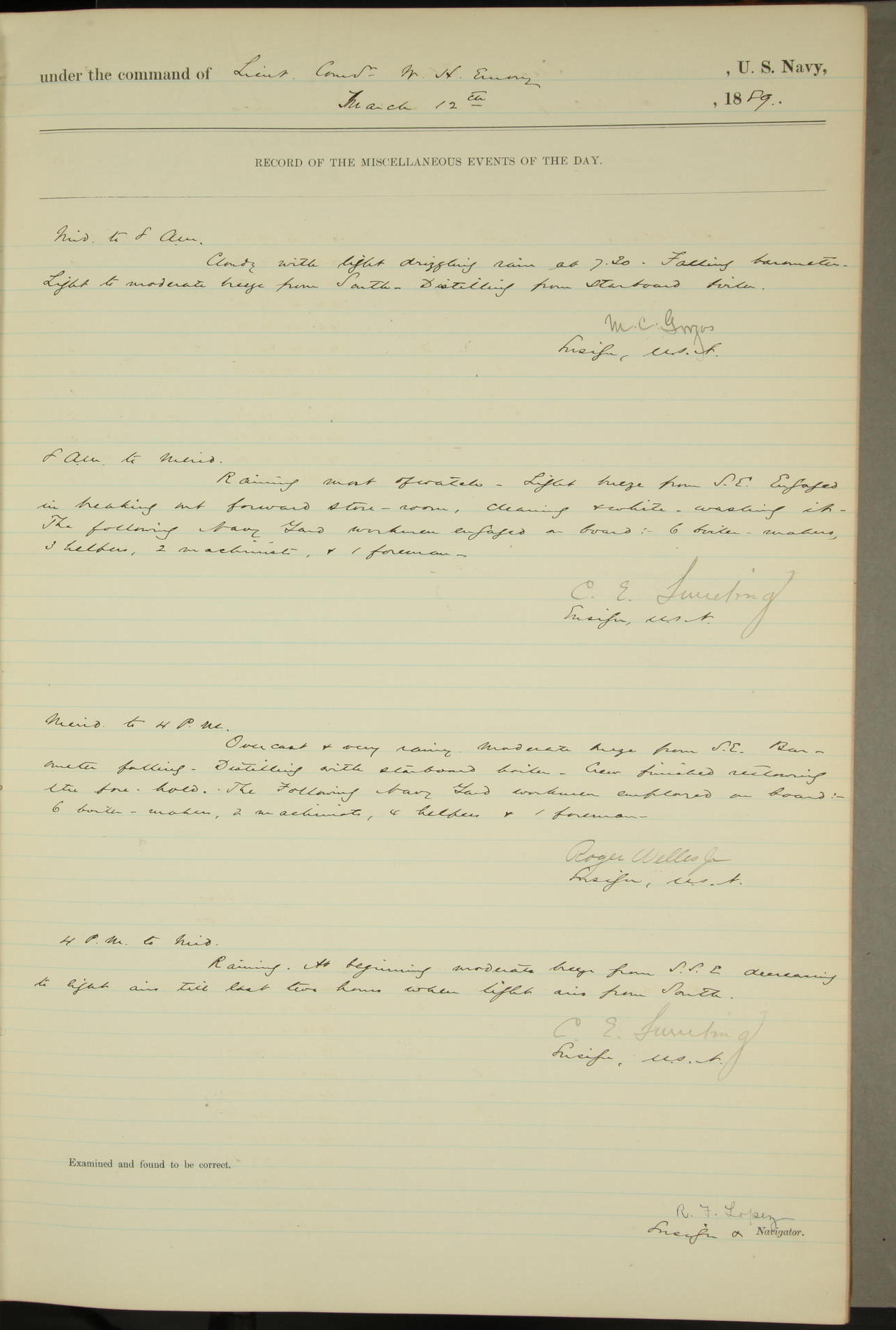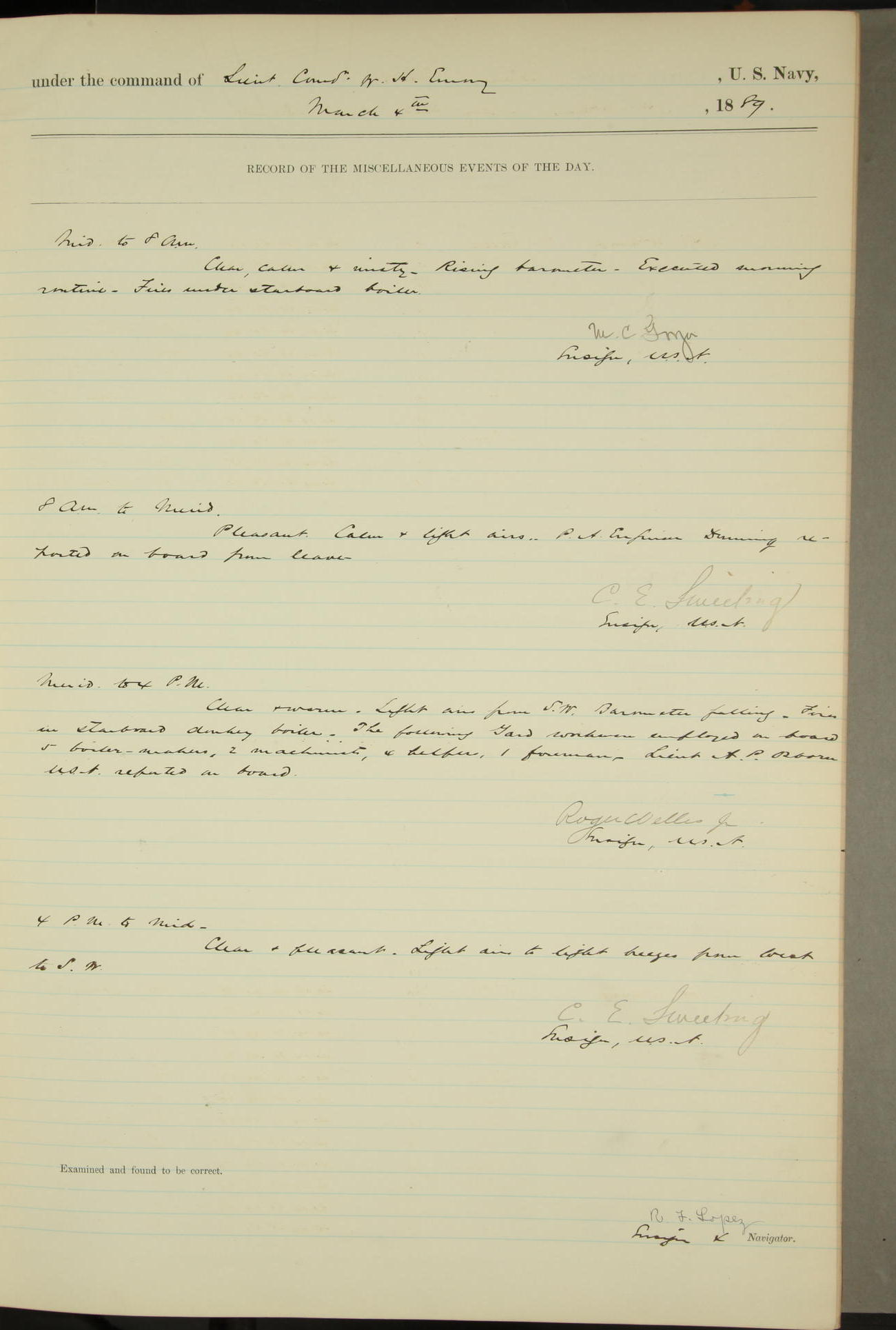 T. McKachury (Sea) returned from liberty 33 2/3 hours overtime. The following yard men employed on board 1 machinist, 2 helpers, 1 carpenter & 1 apprentice. Brig. Genl. Miles, US Army paid an official visit to the Commodore of the Yard, a salute of eleven guns being fired in his honor upon his departure.