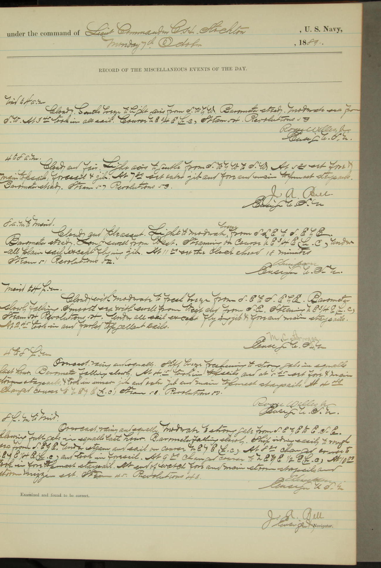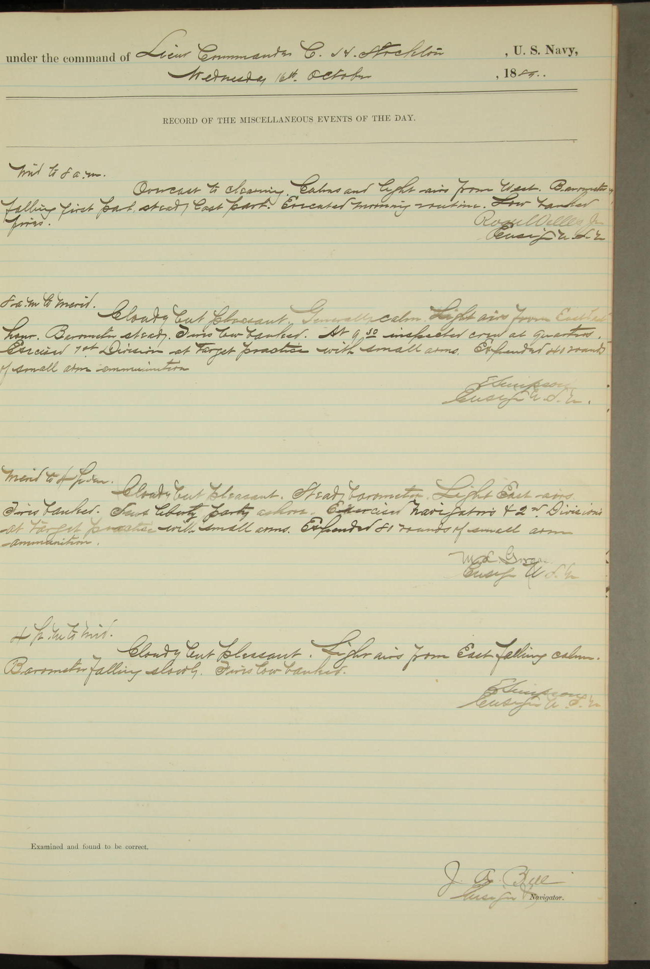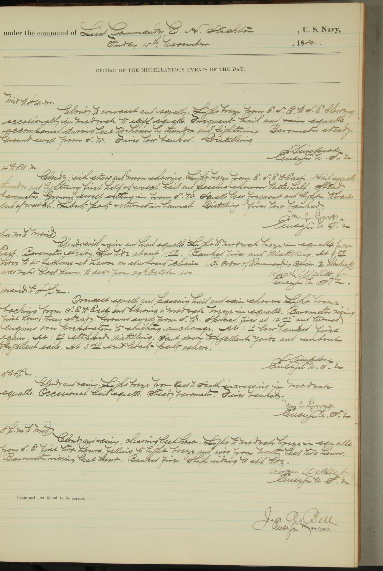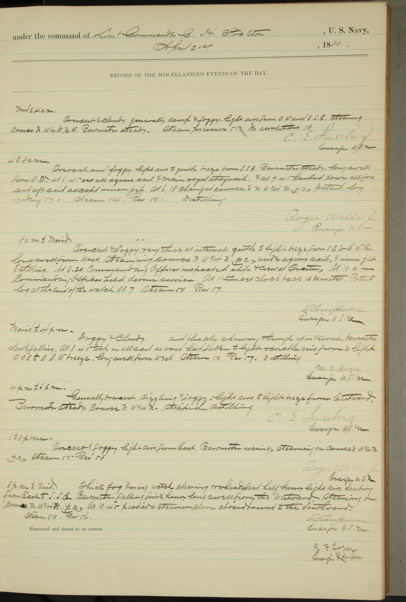 T. McKachury (Sea) returned from liberty 33 2/3 hours overtime. The following yard men employed on board 1 machinist, 2 helpers, 1 carpenter & 1 apprentice. Brig. Genl. Miles, US Army paid an official visit to the Commodore of the Yard, a salute of eleven guns being fired in his honor upon his departure.