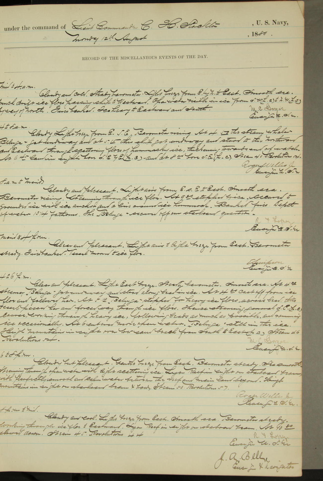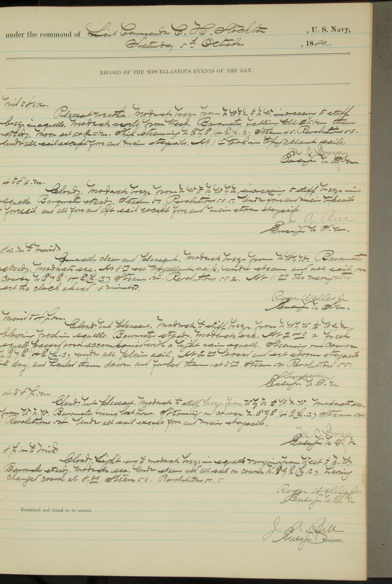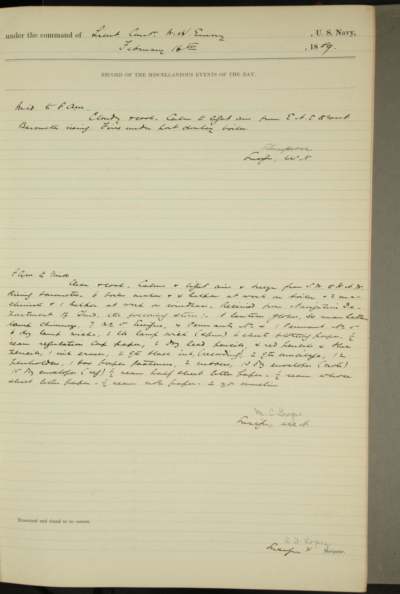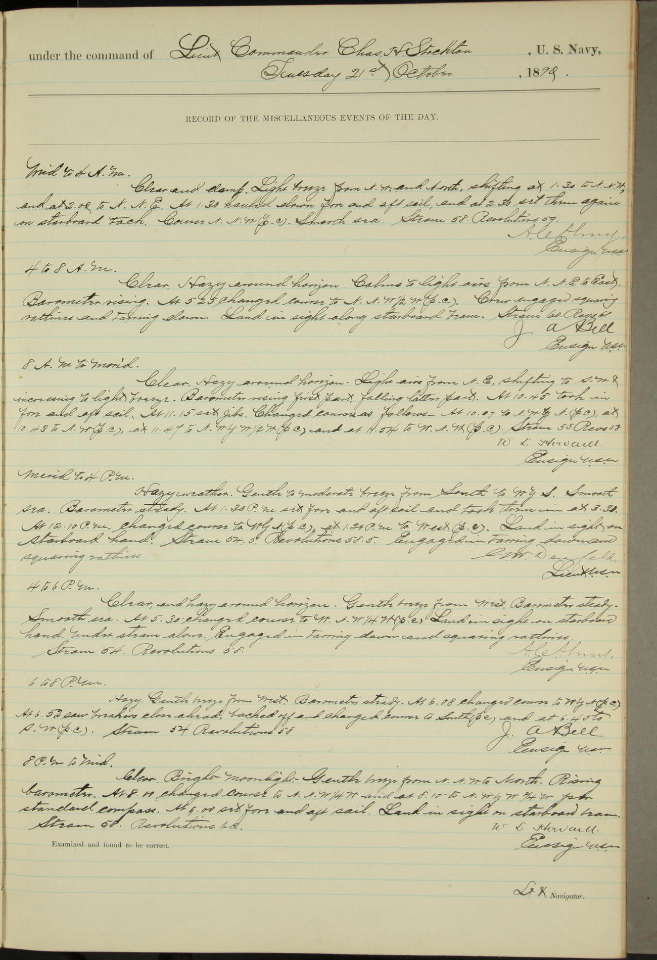T. McKachury (Sea) returned from liberty 33 2/3 hours overtime. The following yard men employed on board 1 machinist, 2 helpers, 1 carpenter & 1 apprentice. Brig. Genl. Miles, US Army paid an official visit to the Commodore of the Yard, a salute of eleven guns being fired in his honor upon his departure.