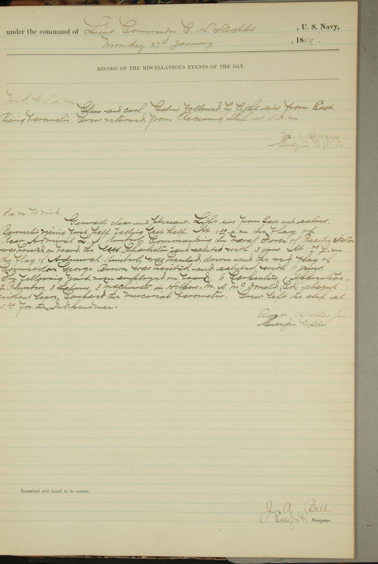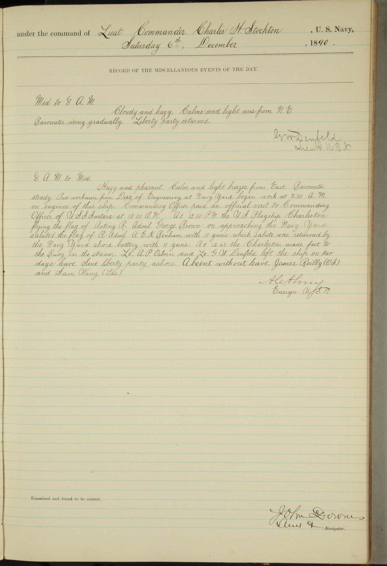 At 12.30PM the US Flagship Charleston flying the flag of Acting R-Adml. George Brown on approaching the Navy Yard saluted the flag of R-Adml. A.E.K. Benham with 13 guns which salute was returned by the Navy Yard shore battery with 11 guns.