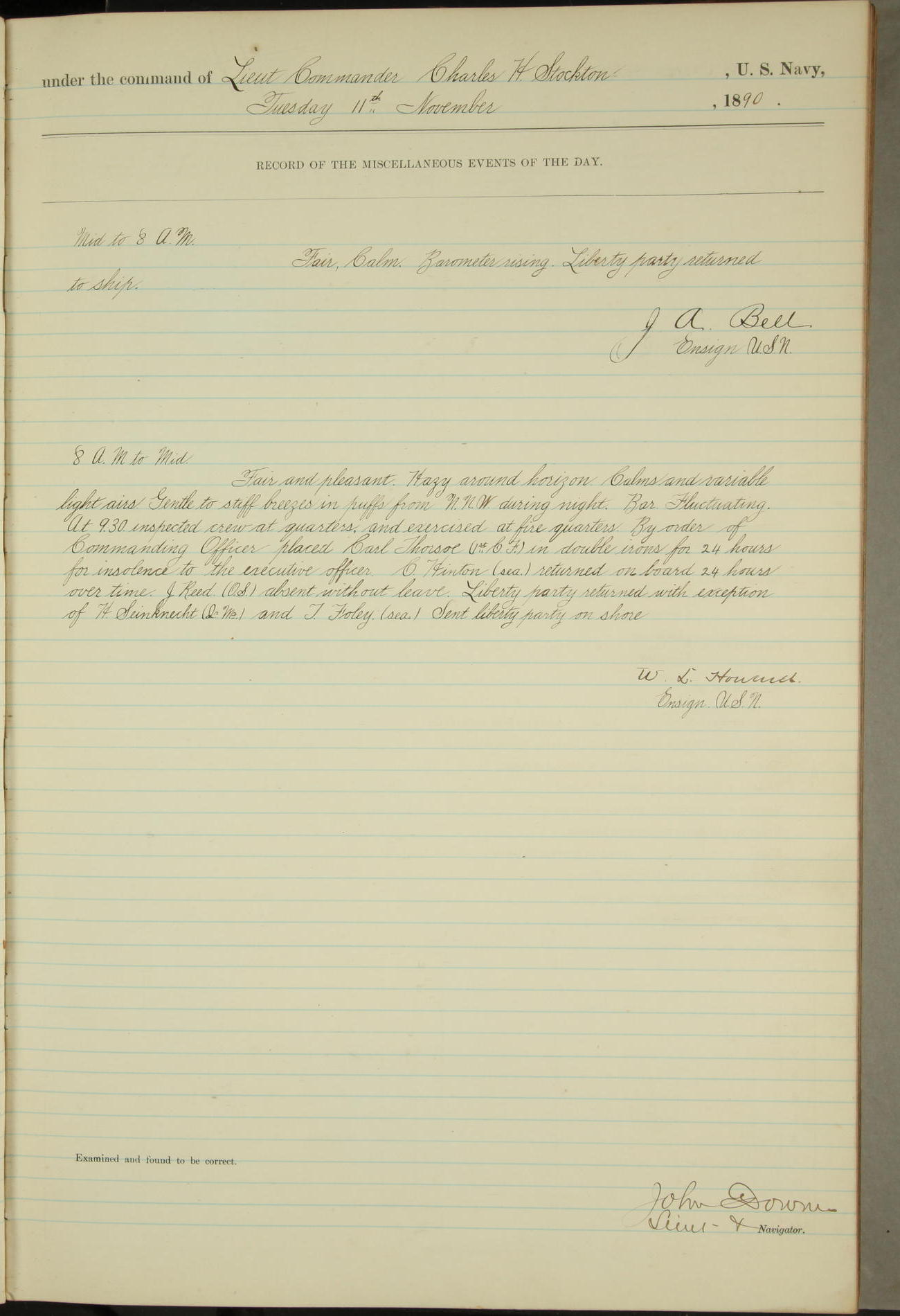J. Reilly (OS) returned on board 8 1/4 days overtime and by order of Commanding Officer was placed in double irons until sober.