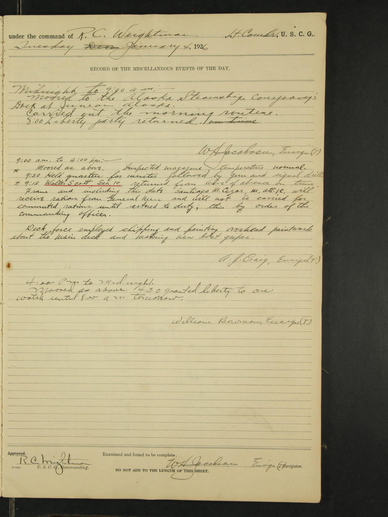 Midnight to 9:00am. Moored to the Alaska Steamship Company's dock, Juneau, Alaska. Carried out the morning routine. 8:00 liberty party returned; no absentees 8:00 held boat drill under oars. 8:15 Santiago M. Cezar, M.Att 1c was found sleeping in the ~ room in the Cabin. * 8:45 William Bowman, Ensign (T)