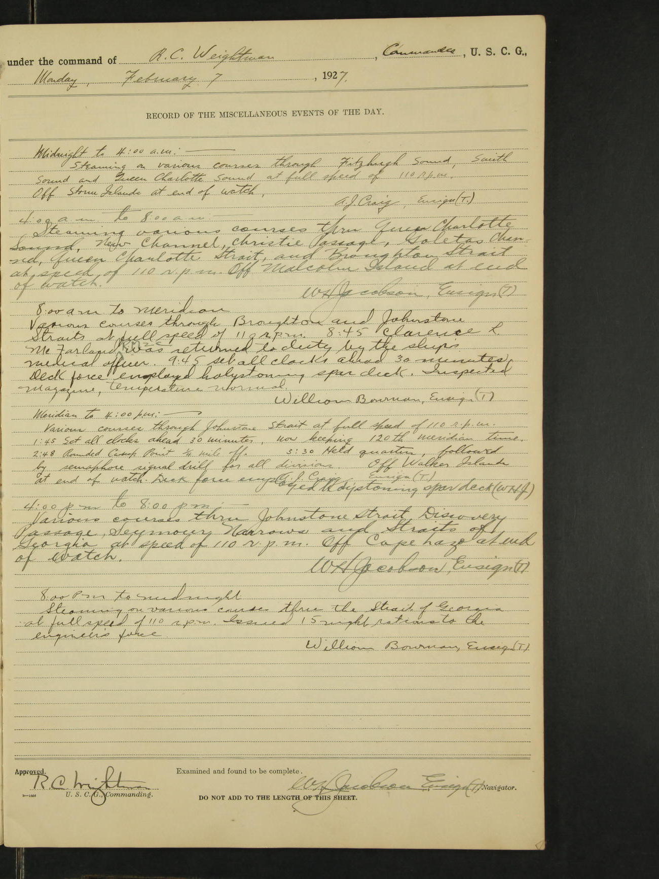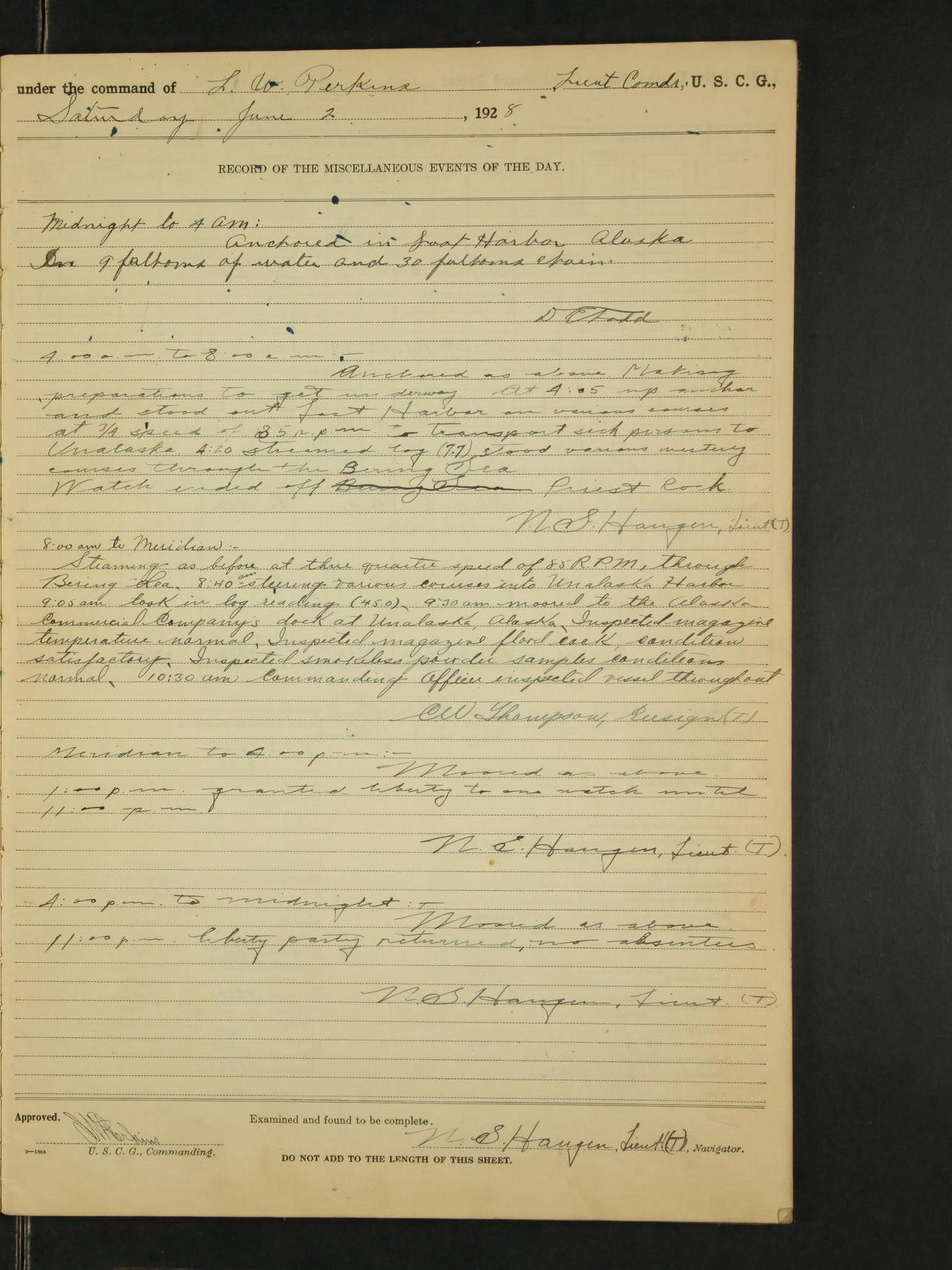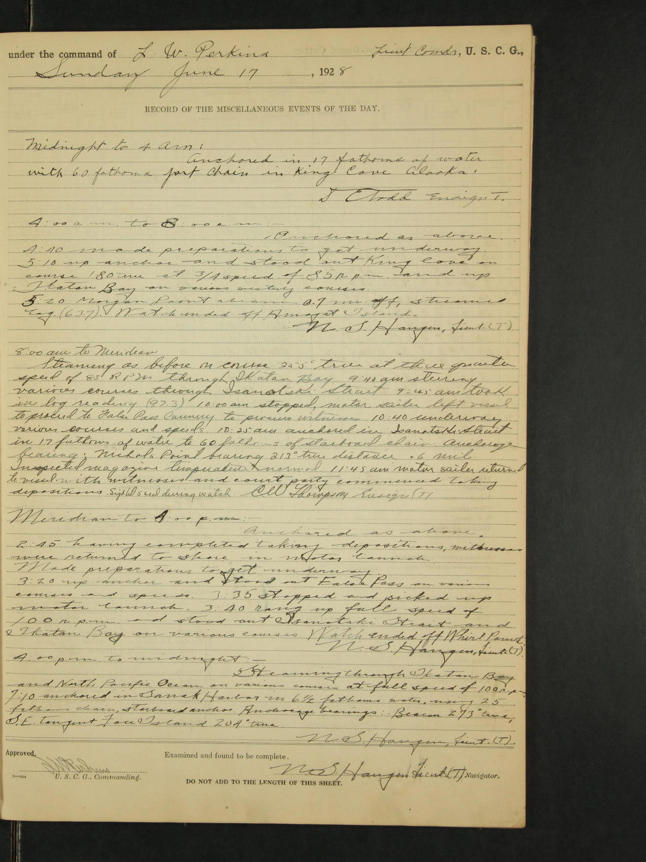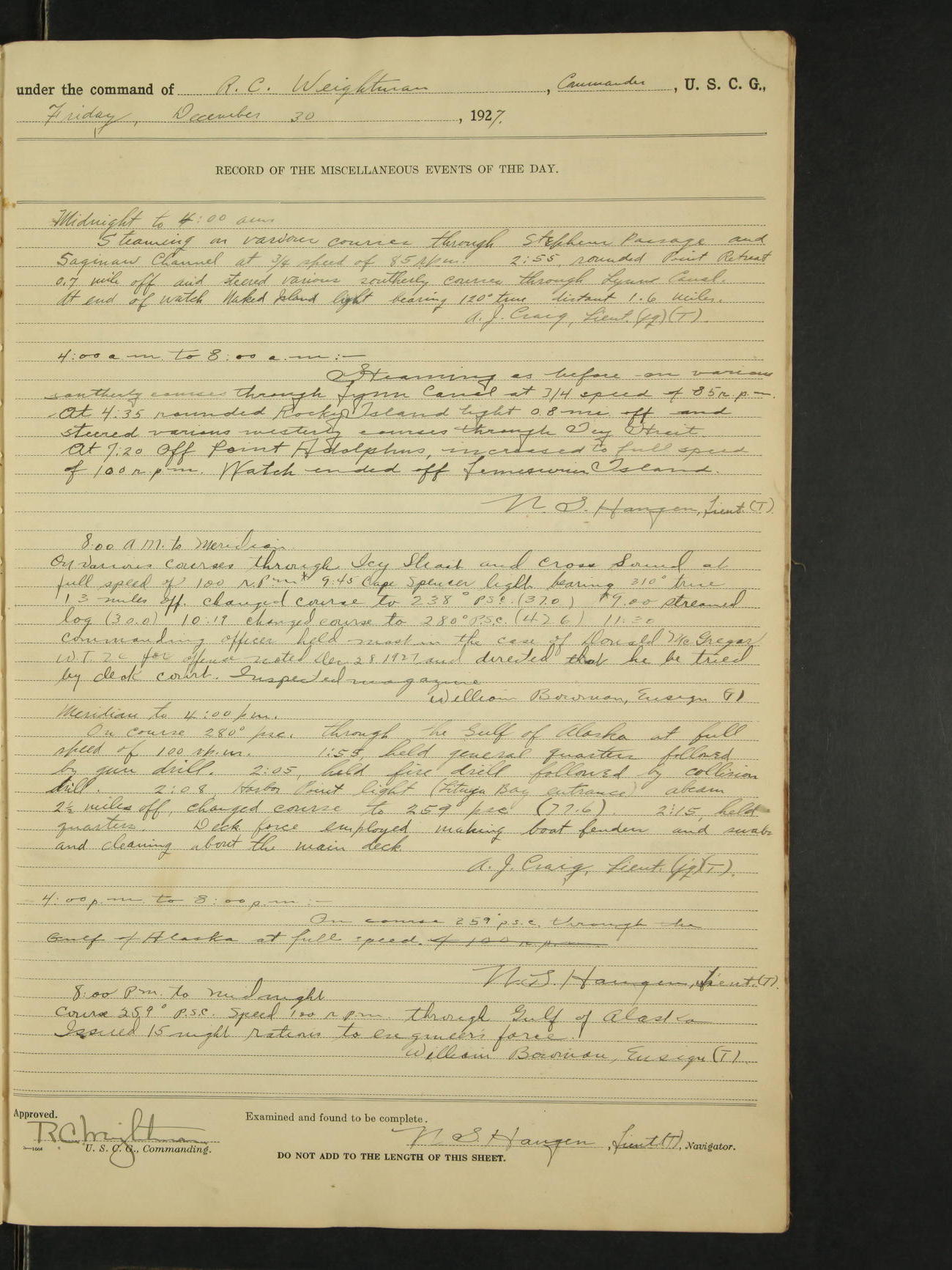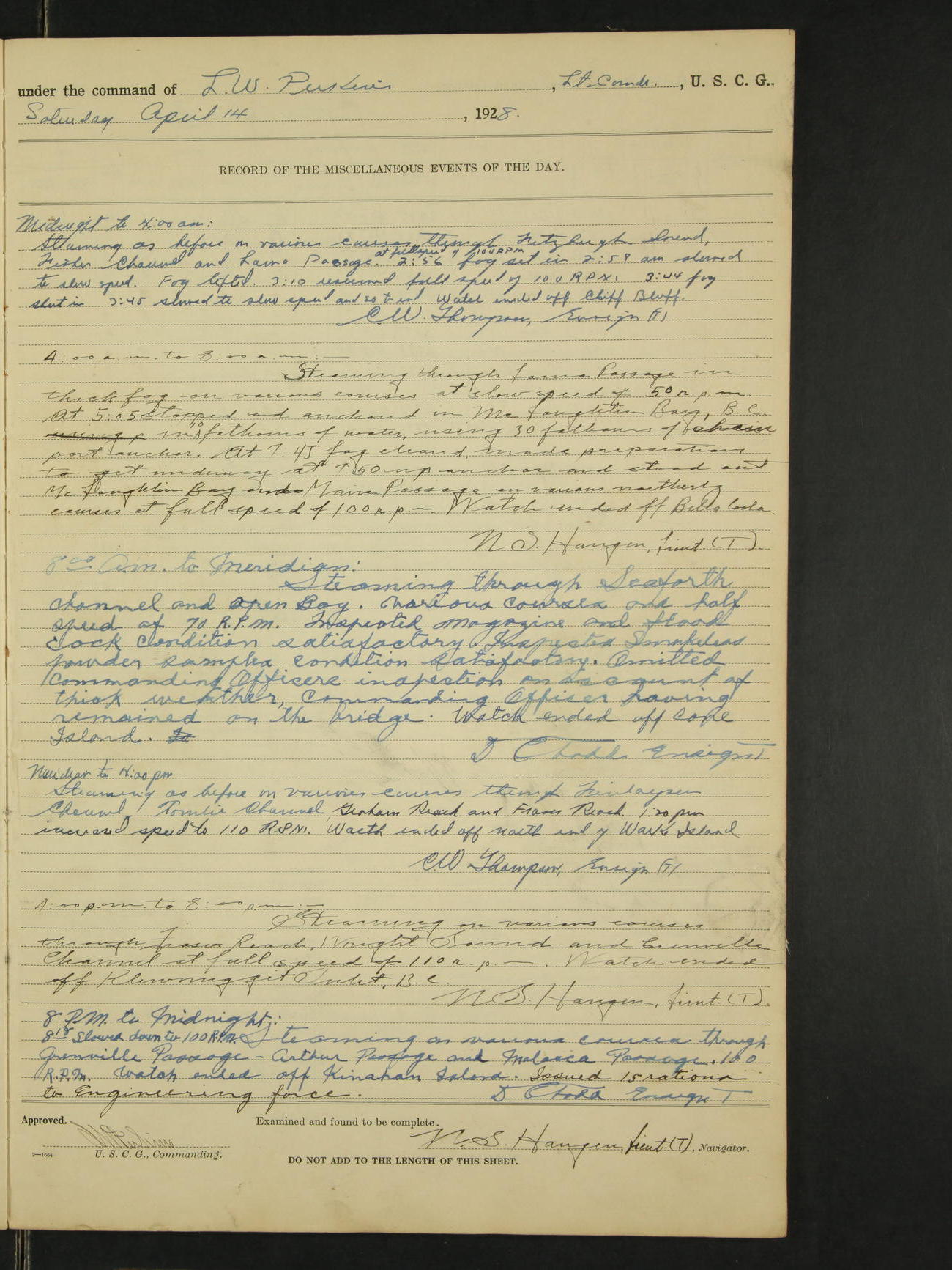 4:00am to 8:00am:- Steaming as before on various southerly and westerly courses through Lynn Canal and Icy Strait at full speed of 100 rpm. Watch ended off Lemesurier Island Light. N.S. Haugen, Lieut. (T).