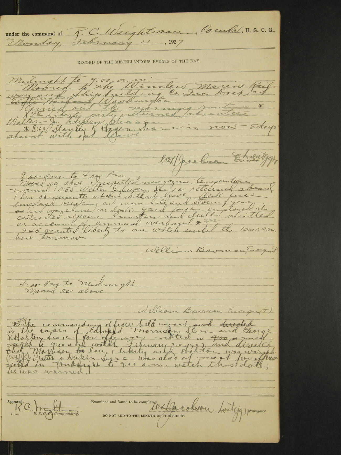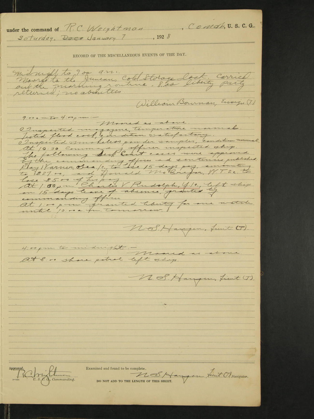Midnight to 9:00AM. Moored to the Alaska Steamship Company dock, Juneau, Alaska. Carried out the morning routine. 8:00 Regular liberty party returned; no absentees. 9:00 Arthur L. Bowman SC 1c, failed to returned from watch stander's liberty and is absent without leave from this time. William Bowman, Ensign (T)