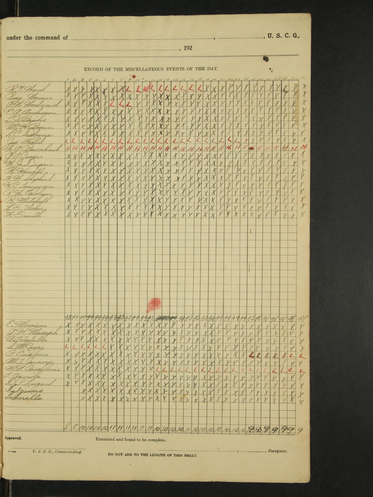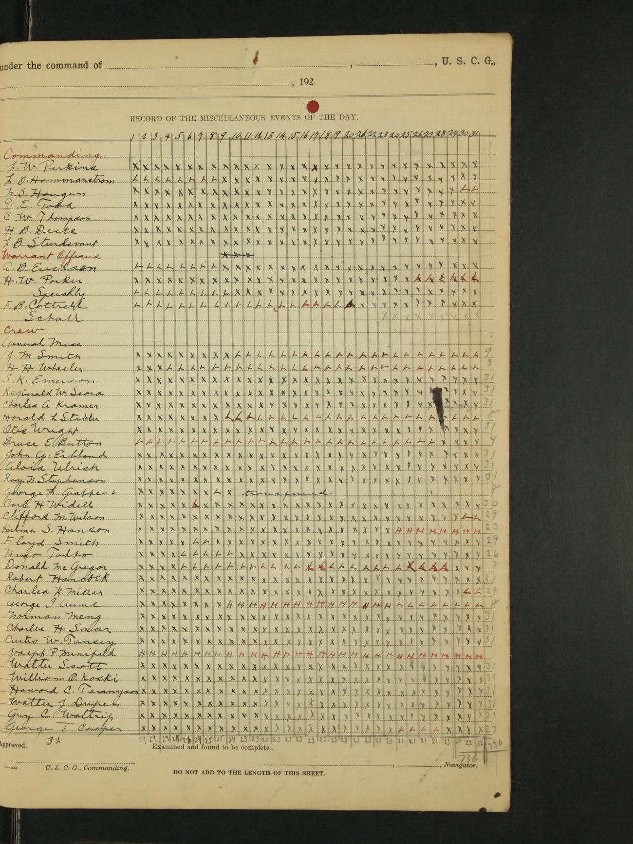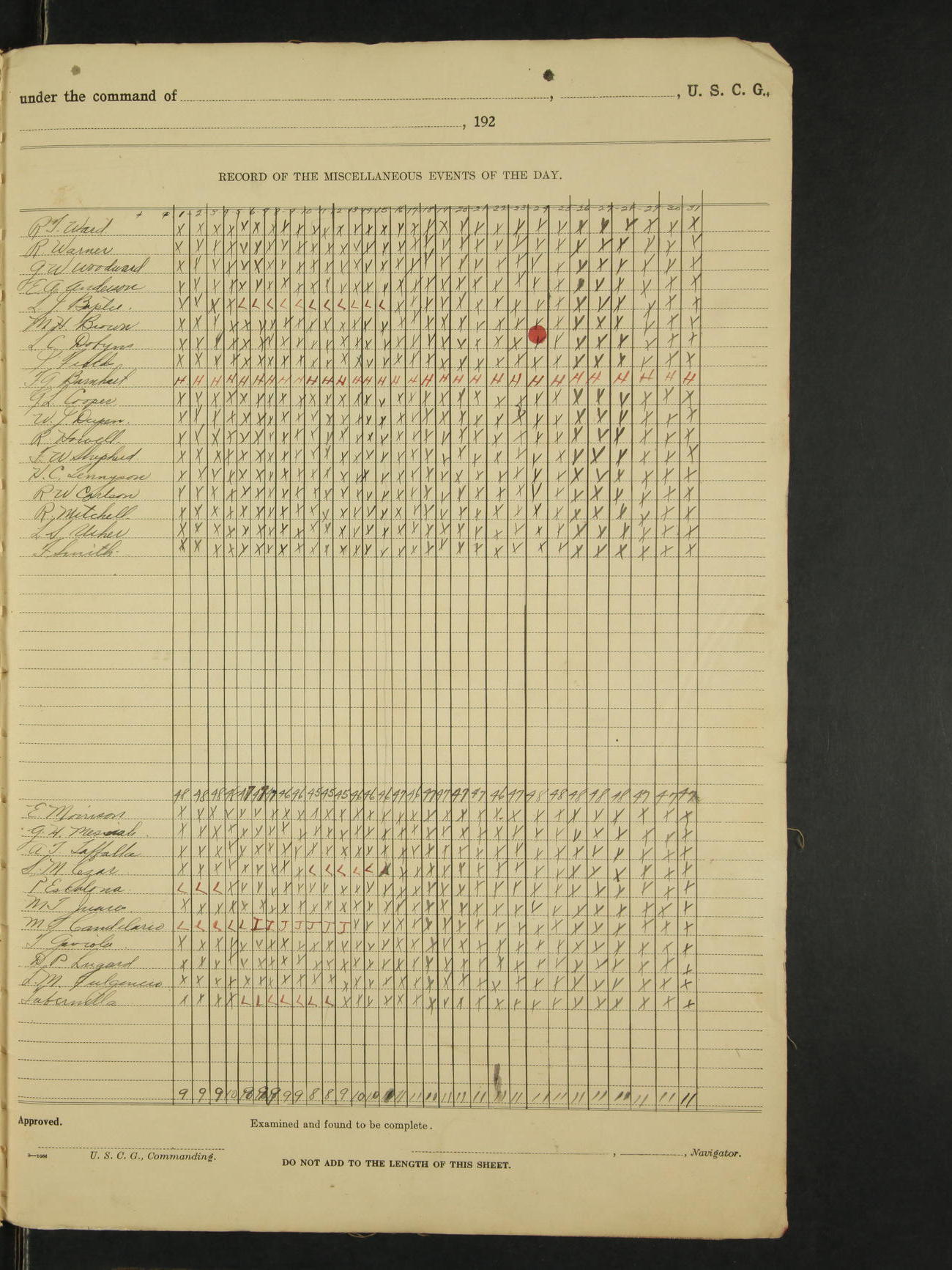 *The following named men were placed on the binnacle list by the ship's medical officer; Clarence L. McFarland, RM 2c, Floyd Smith, F 1c. Santiago M. Cezar, M.Att 1c was placed on the binnacle list by the ship's medical officer, for a disease due to his own misconduct, no pay accrue after this date.