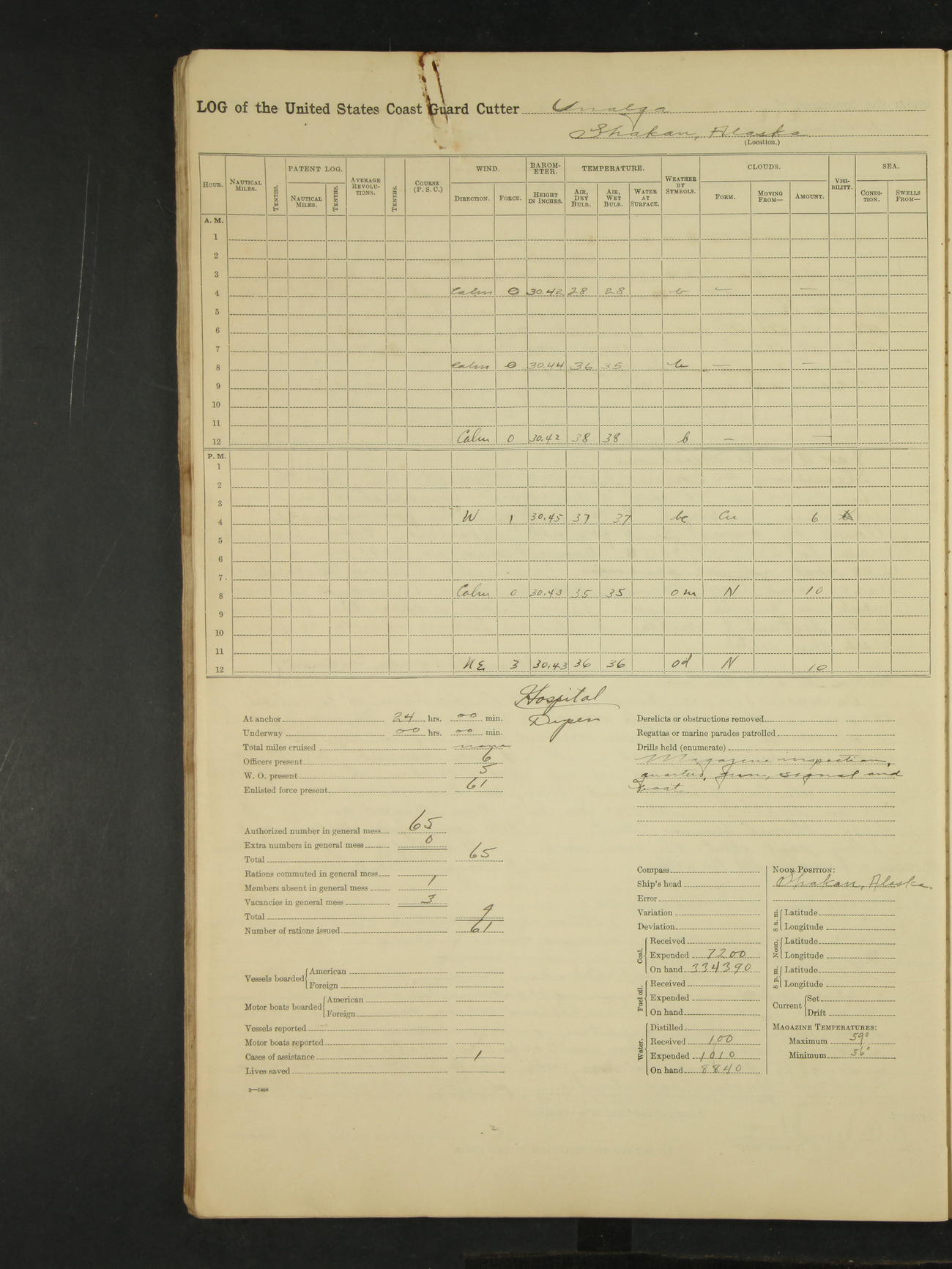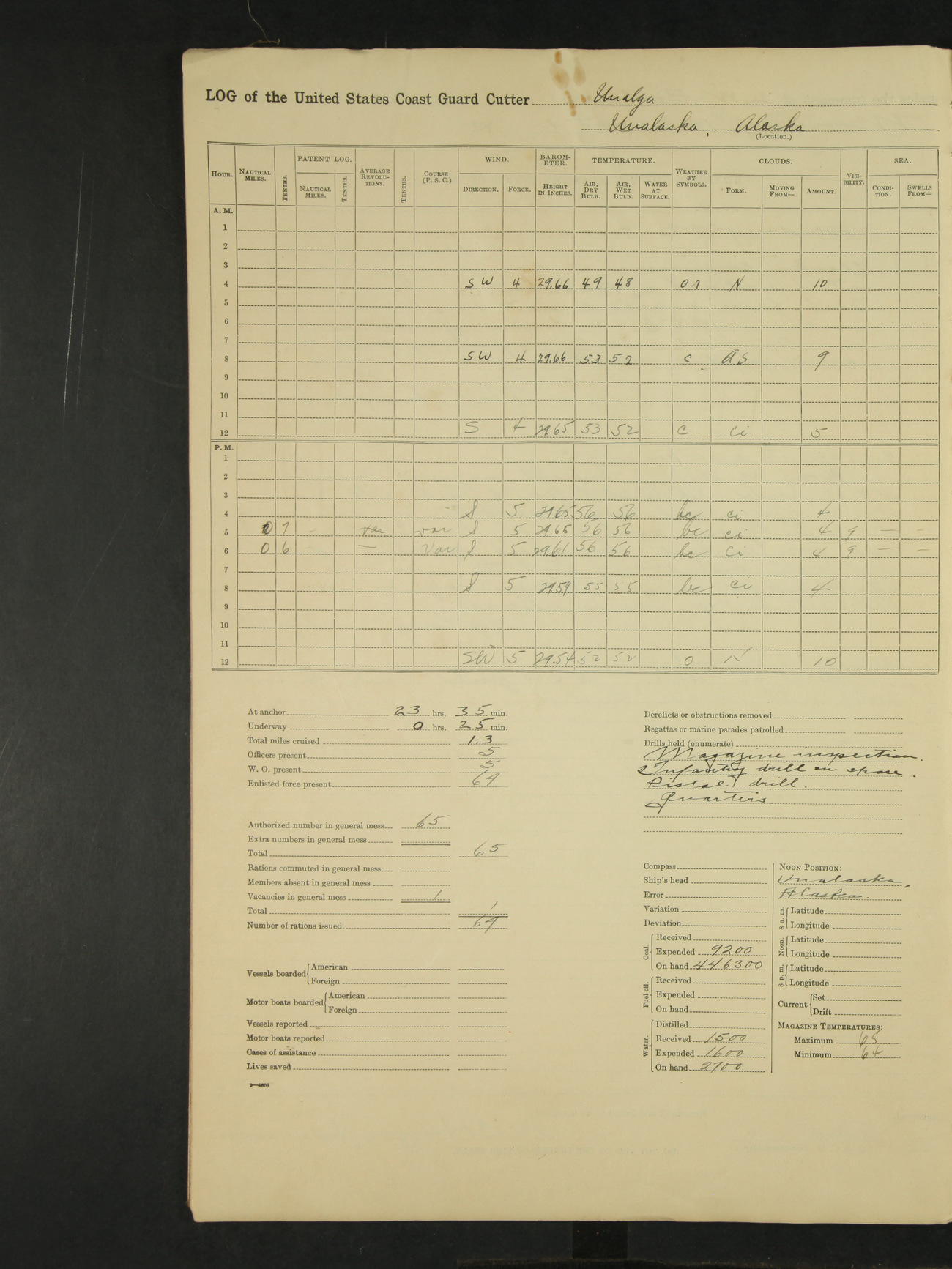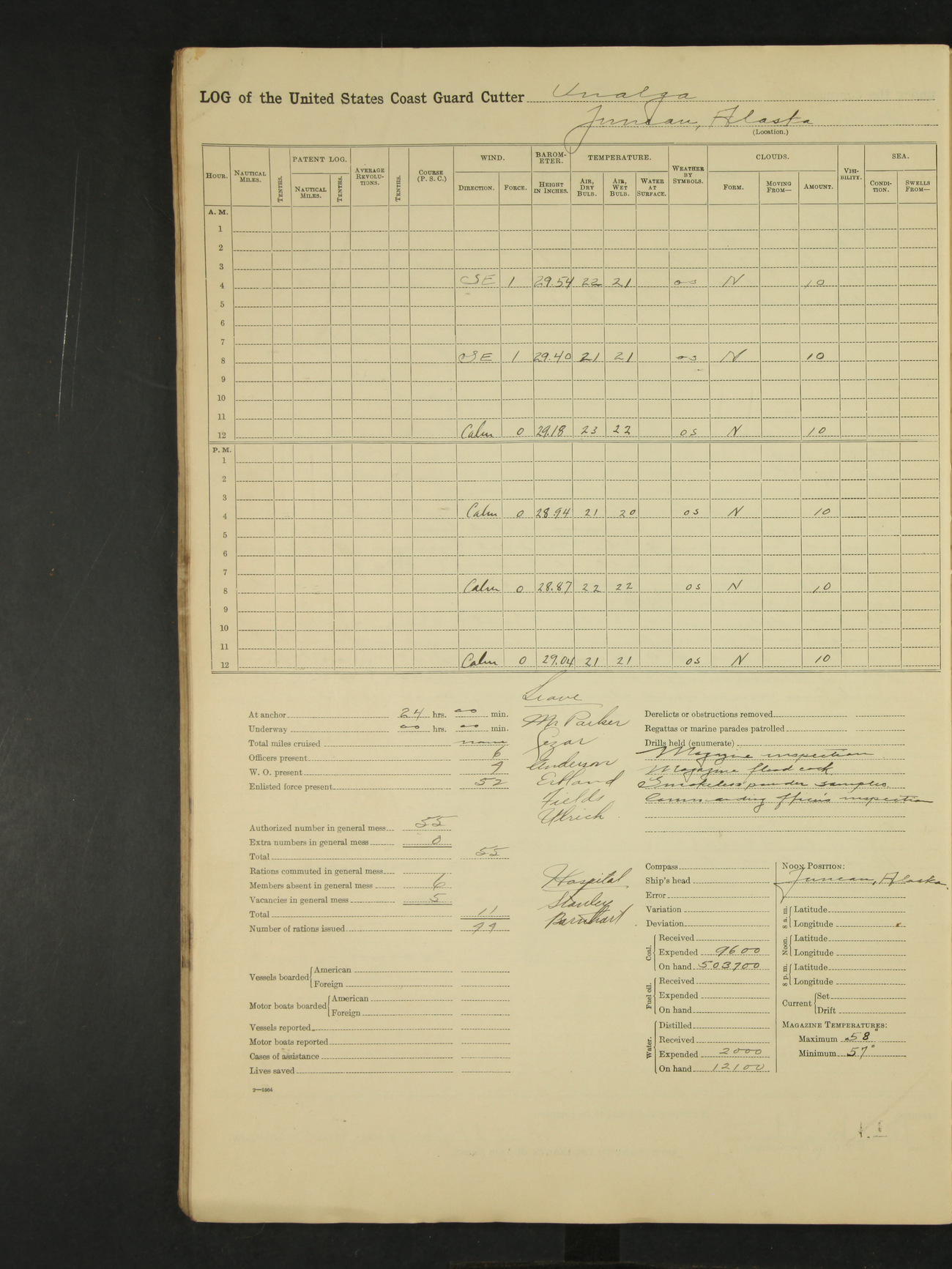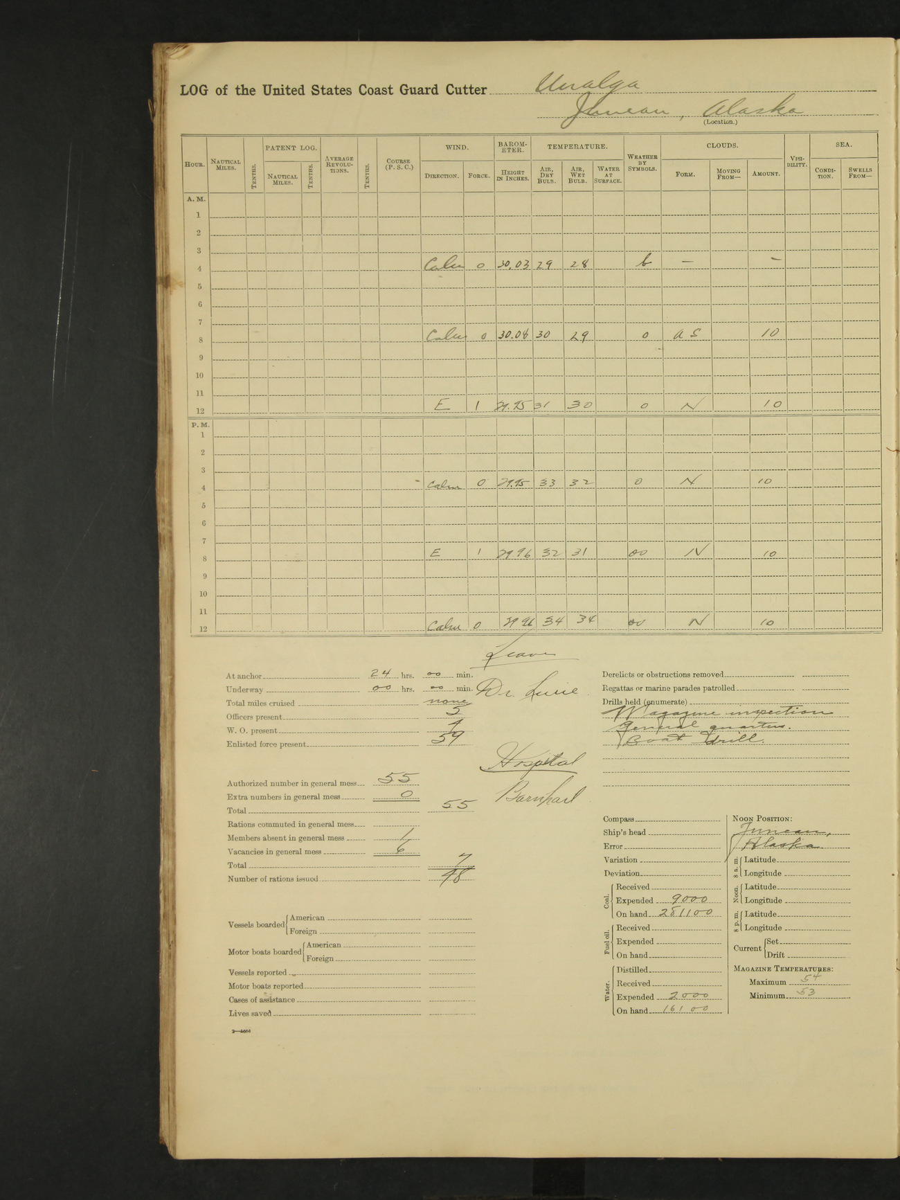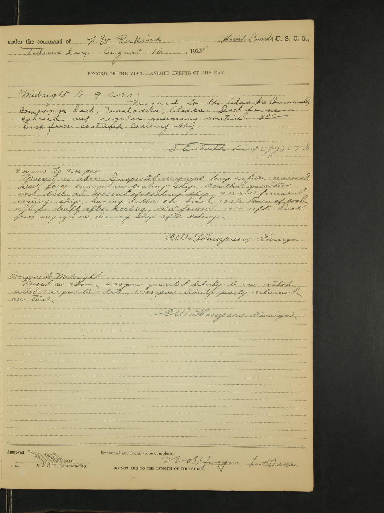 9:00am to 4:00pm Moored as above. Inspected magazine, temperature normal. Deck force engaged in coaling ship. Omitted quarters and drills on account of coaling ship. Leslie E Cole, F 2c placed on binnacle list. 3:40pm suspended coaling ship, having taken on board ninety (90) long tons. In compliance to Commander Northwestern Division telegram 9928-1440 December 1928, Unalga will convoy SS Starr to Cape Spencer Alaska, when the latter vessel is ready to proceed. Draft after coaling 13'6" forward, 14'00" aft. C.W. Thompson, Ensign.