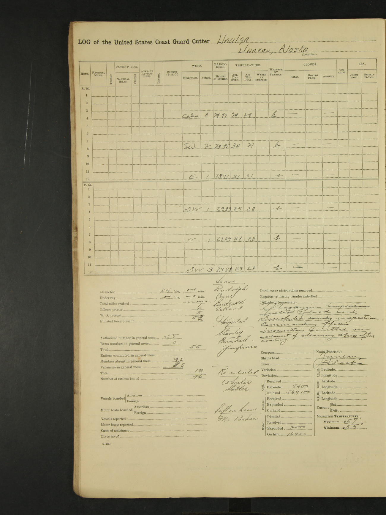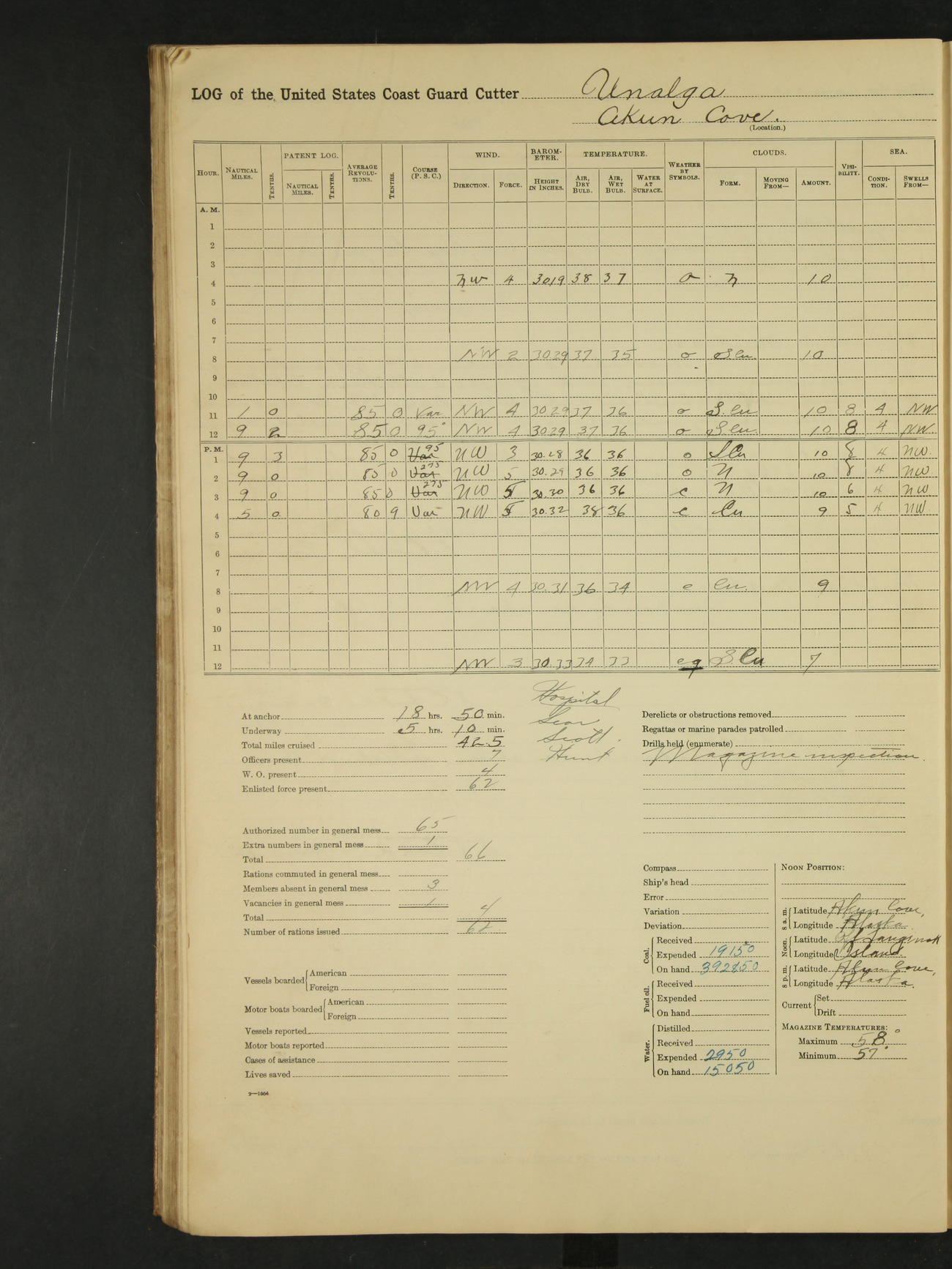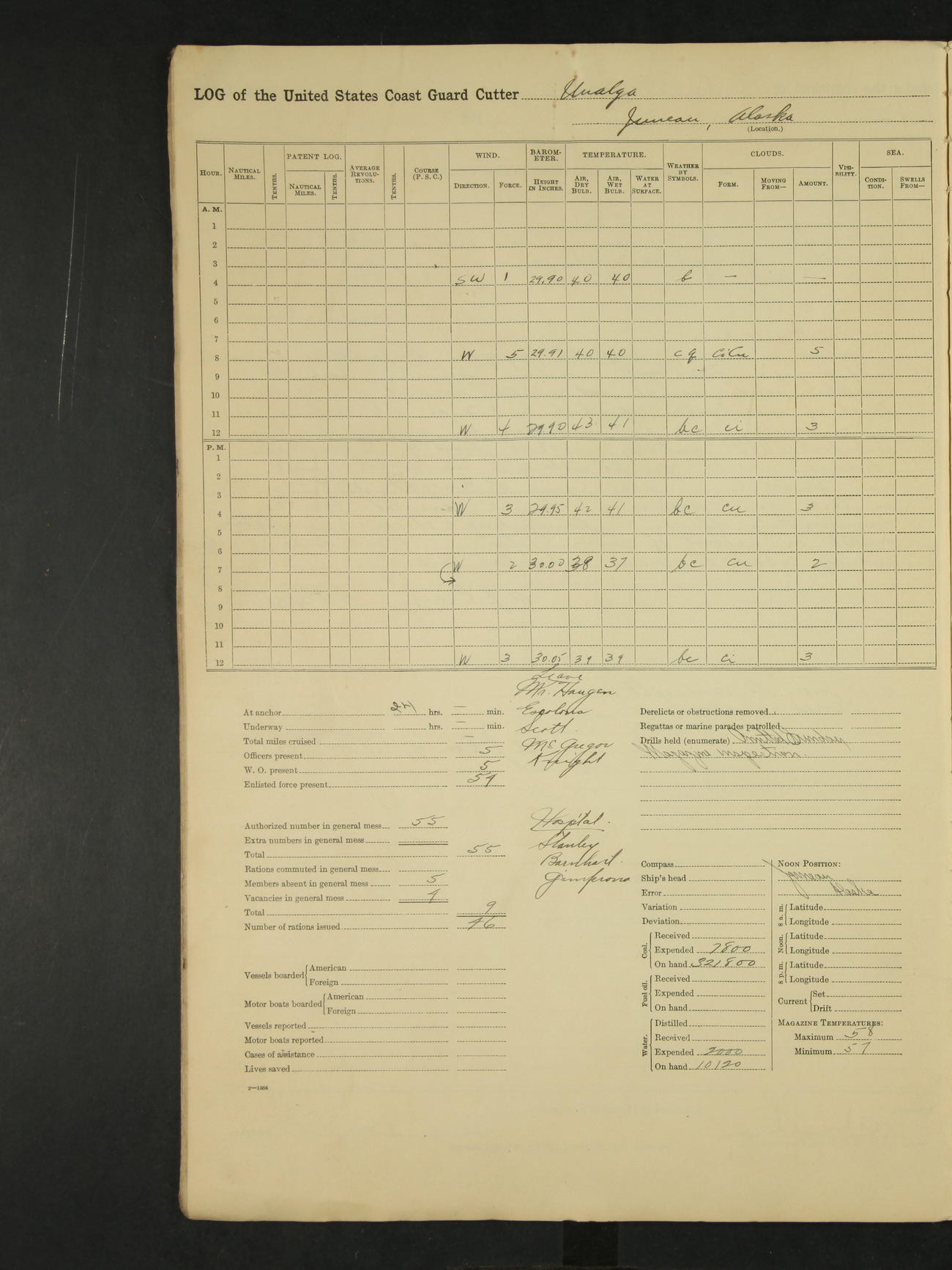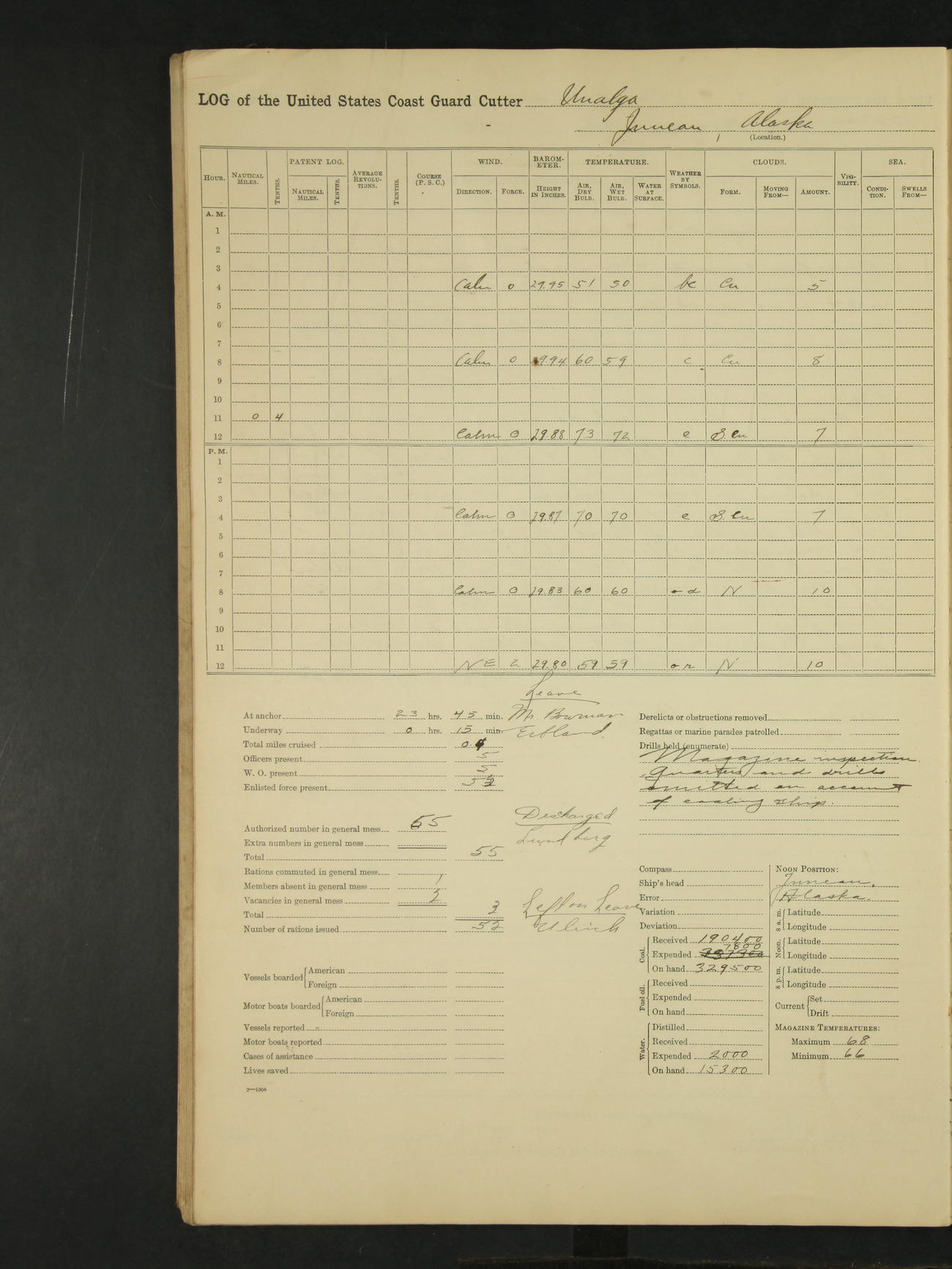9:00am to 4:00pm Moored as above. Inspected magazine, temperature normal. Deck force engaged in coaling ship. Omitted quarters and drills on account of coaling ship. Leslie E Cole, F 2c placed on binnacle list. 3:40pm suspended coaling ship, having taken on board ninety (90) long tons. In compliance to Commander Northwestern Division telegram 9928-1440 December 1928, Unalga will convoy SS Starr to Cape Spencer Alaska, when the latter vessel is ready to proceed. Draft after coaling 13'6" forward, 14'00" aft. C.W. Thompson, Ensign.