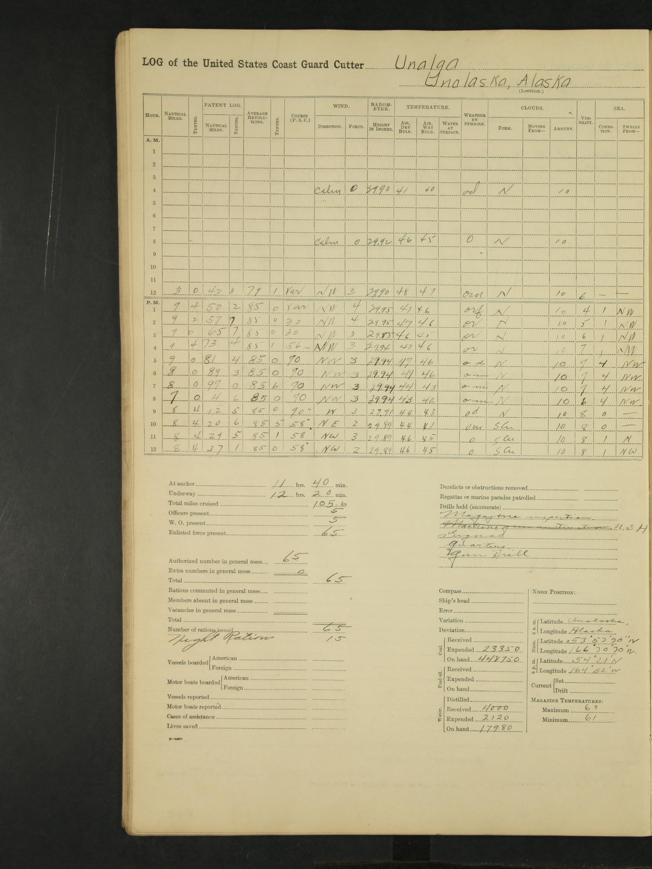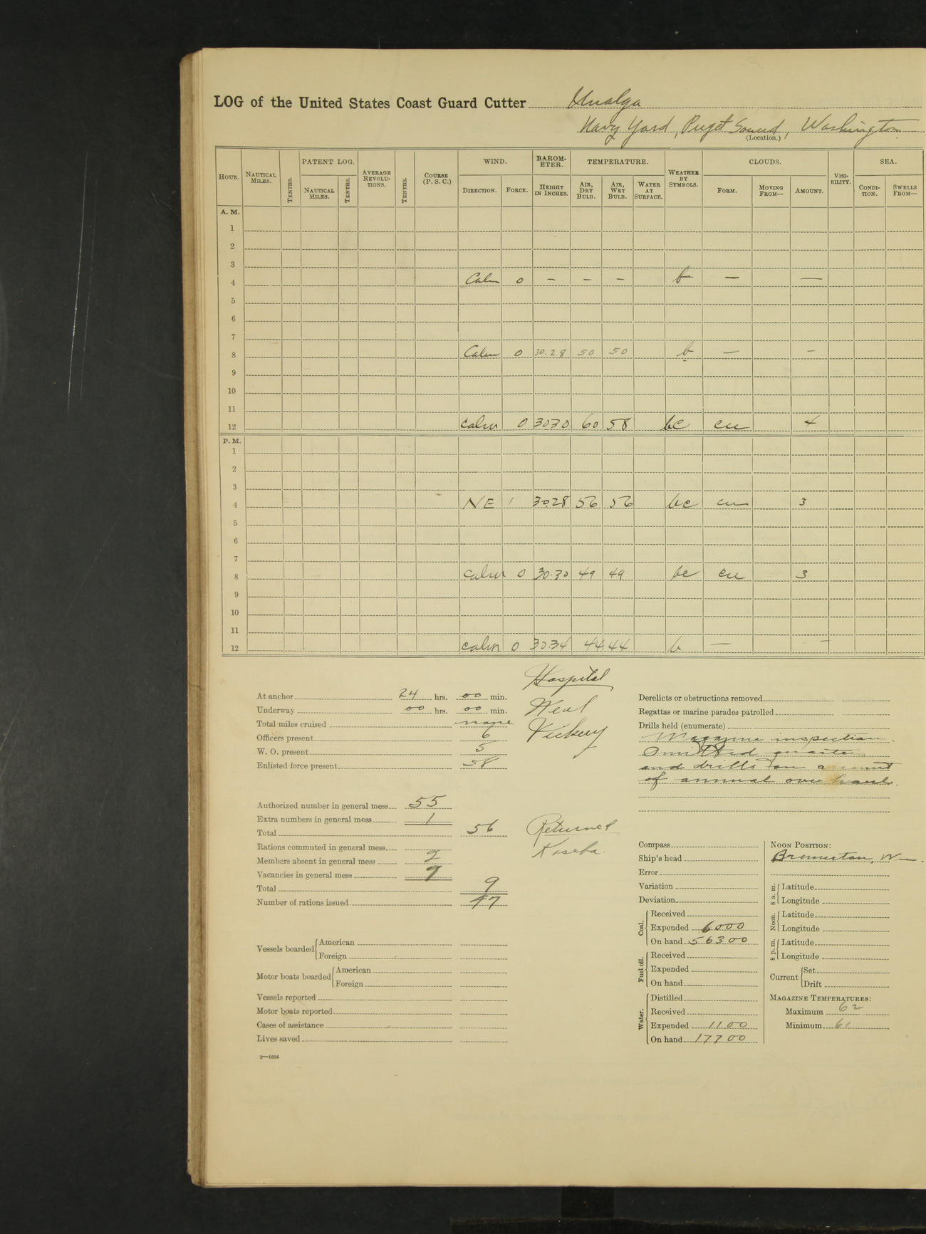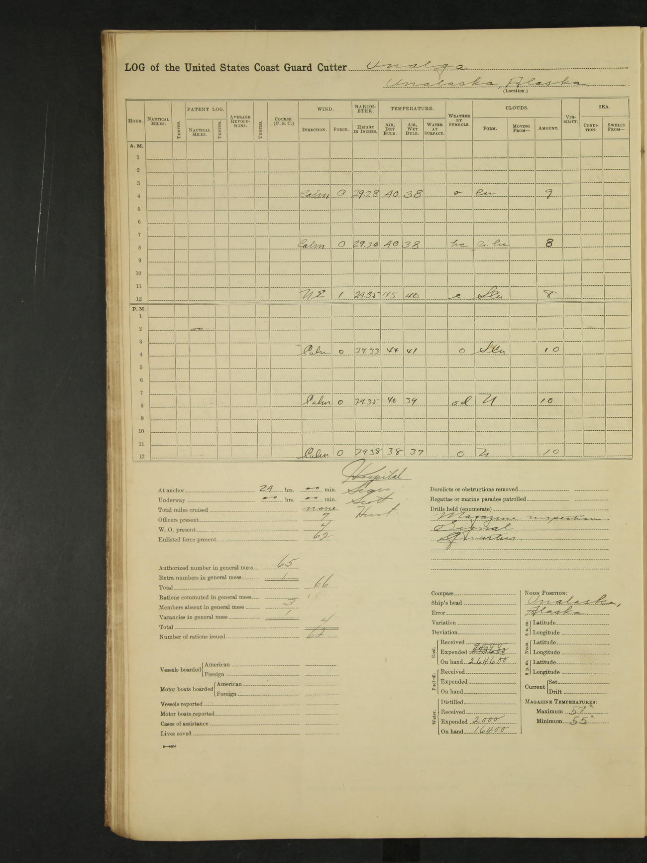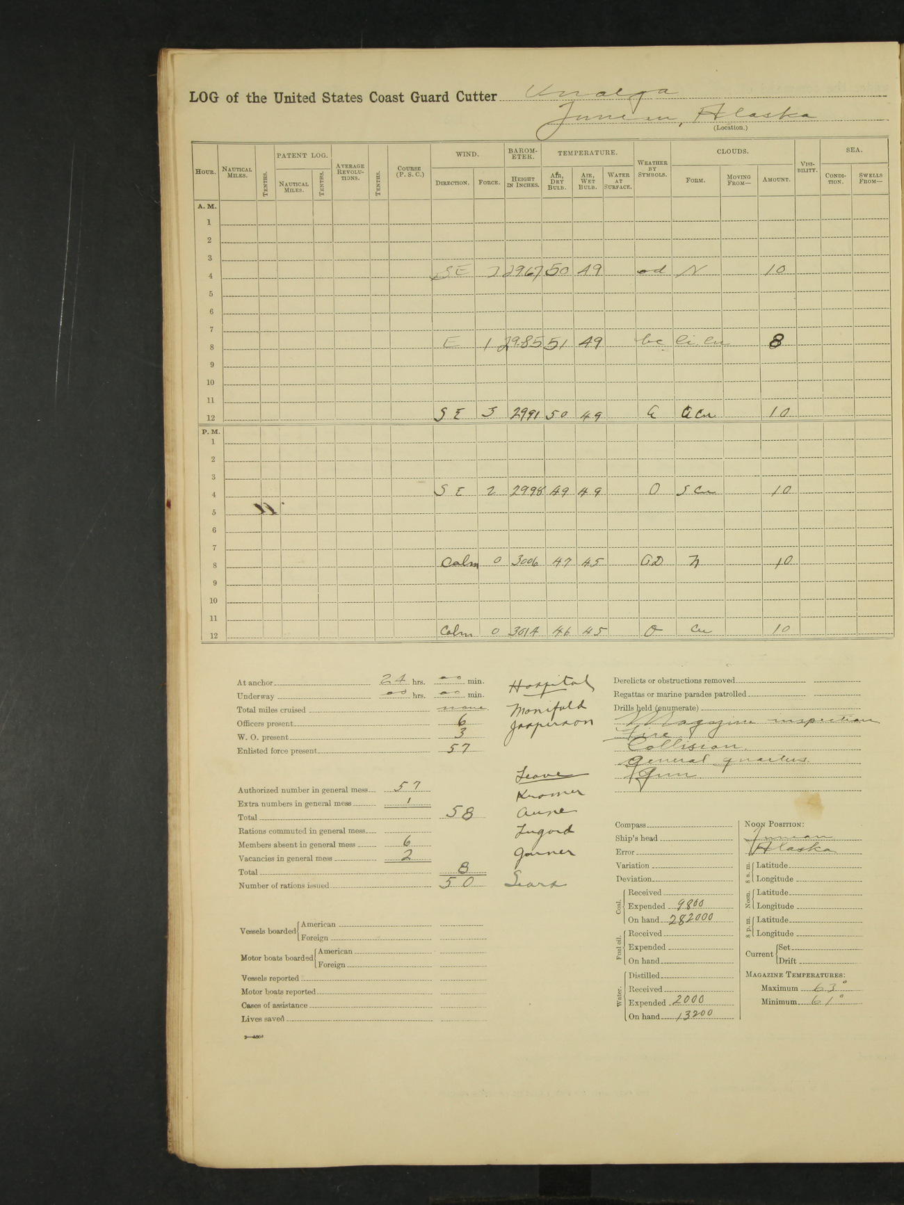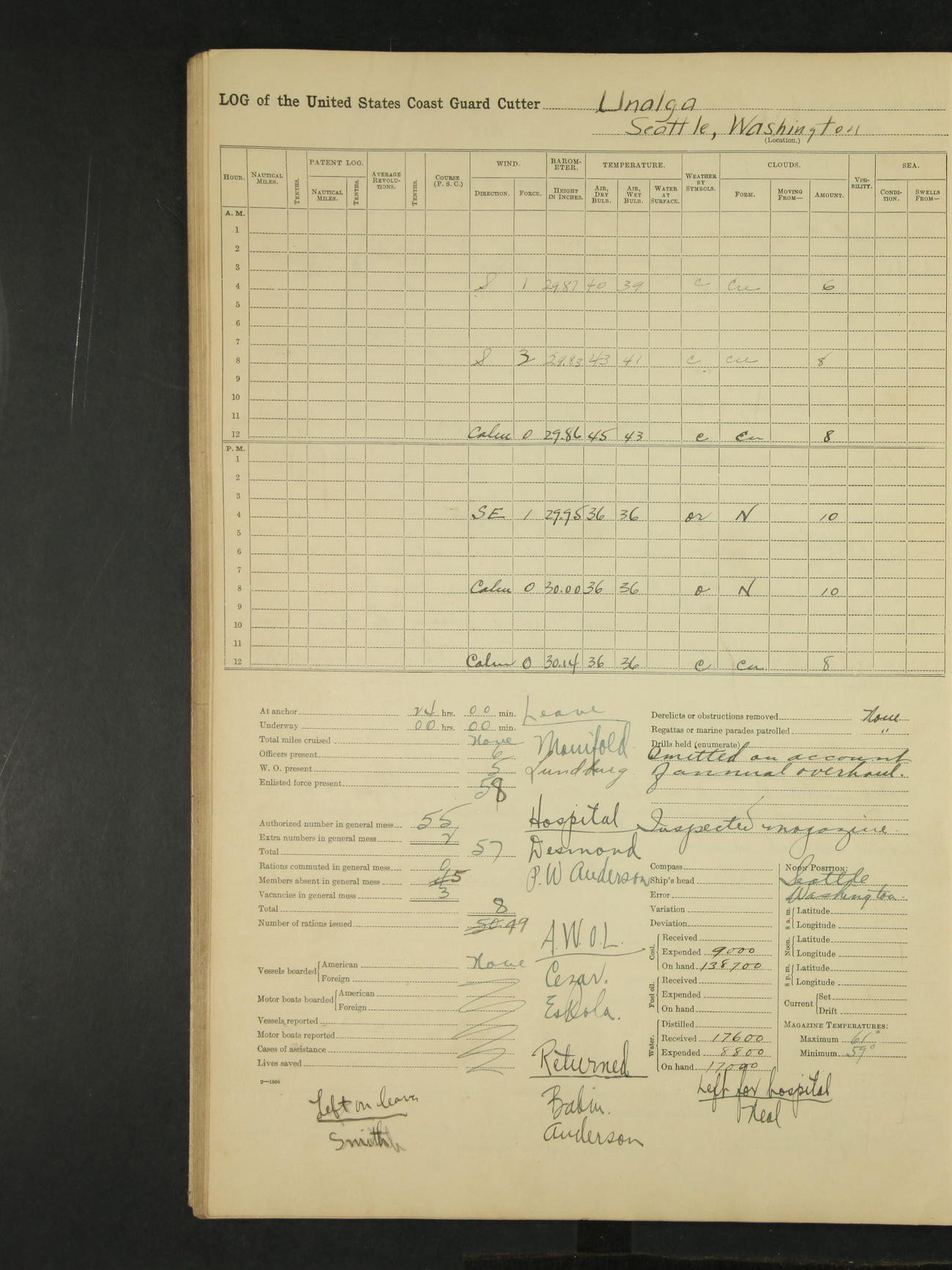 9:00am to 4:00pm Moored as above. Inspected magazine, temperature normal. Deck force engaged in coaling ship. Omitted quarters and drills on account of coaling ship. Leslie E Cole, F 2c placed on binnacle list. 3:40pm suspended coaling ship, having taken on board ninety (90) long tons. In compliance to Commander Northwestern Division telegram 9928-1440 December 1928, Unalga will convoy SS Starr to Cape Spencer Alaska, when the latter vessel is ready to proceed. Draft after coaling 13'6" forward, 14'00" aft. C.W. Thompson, Ensign.