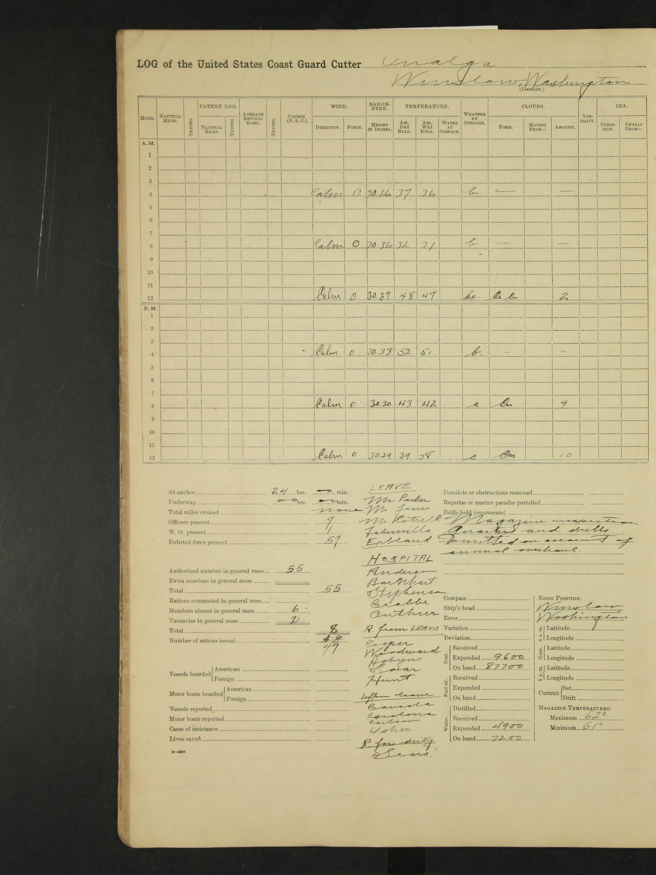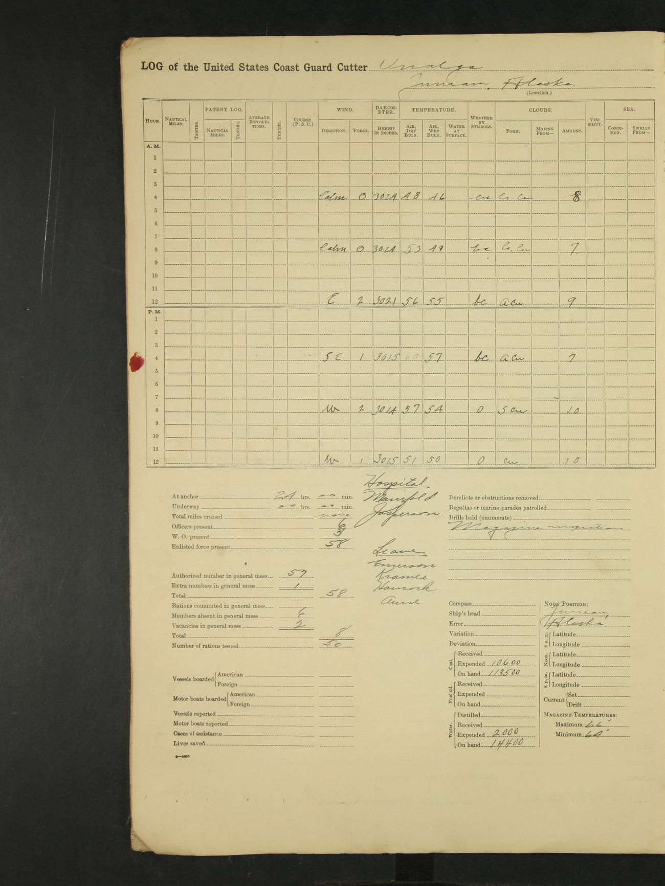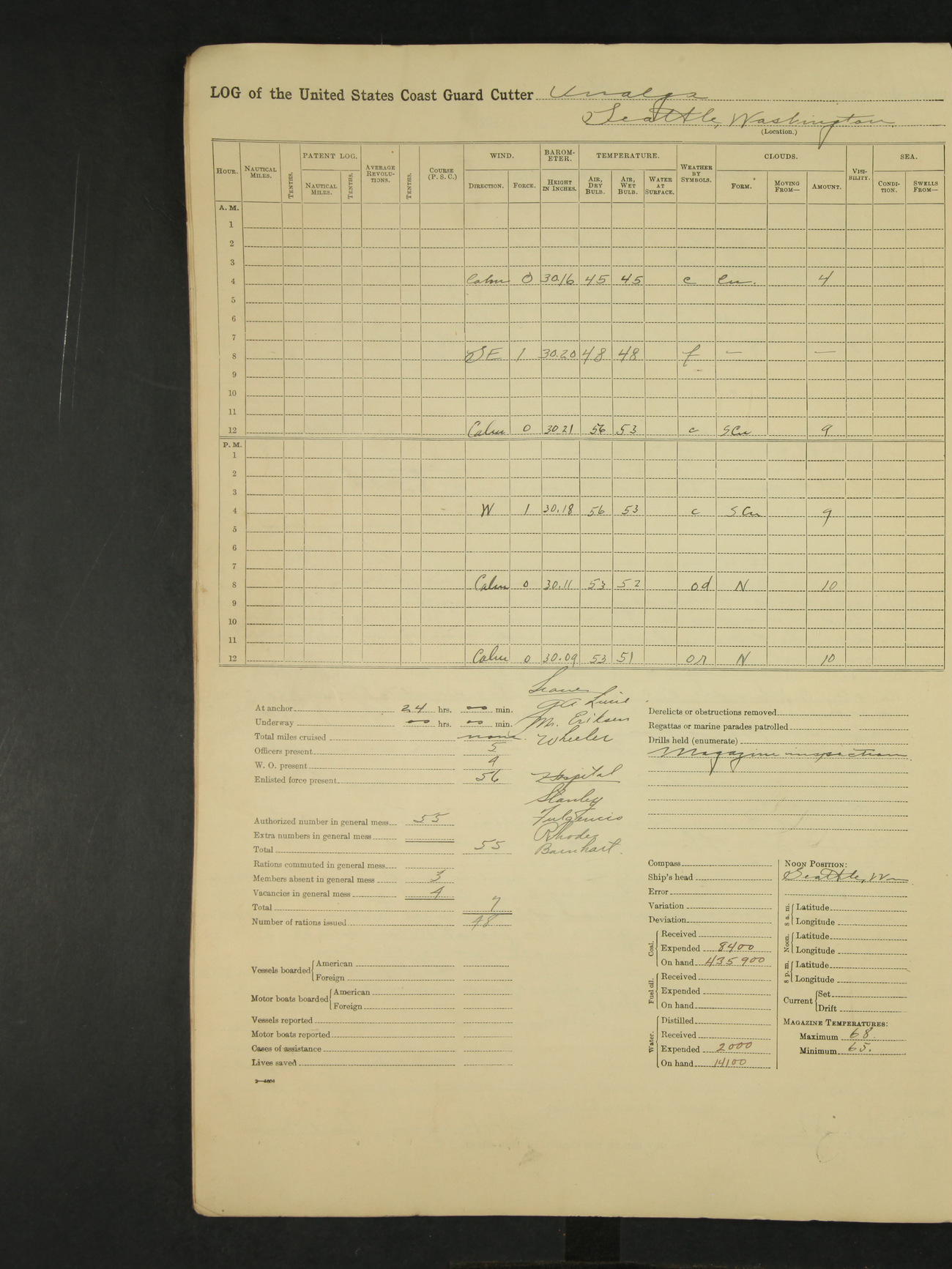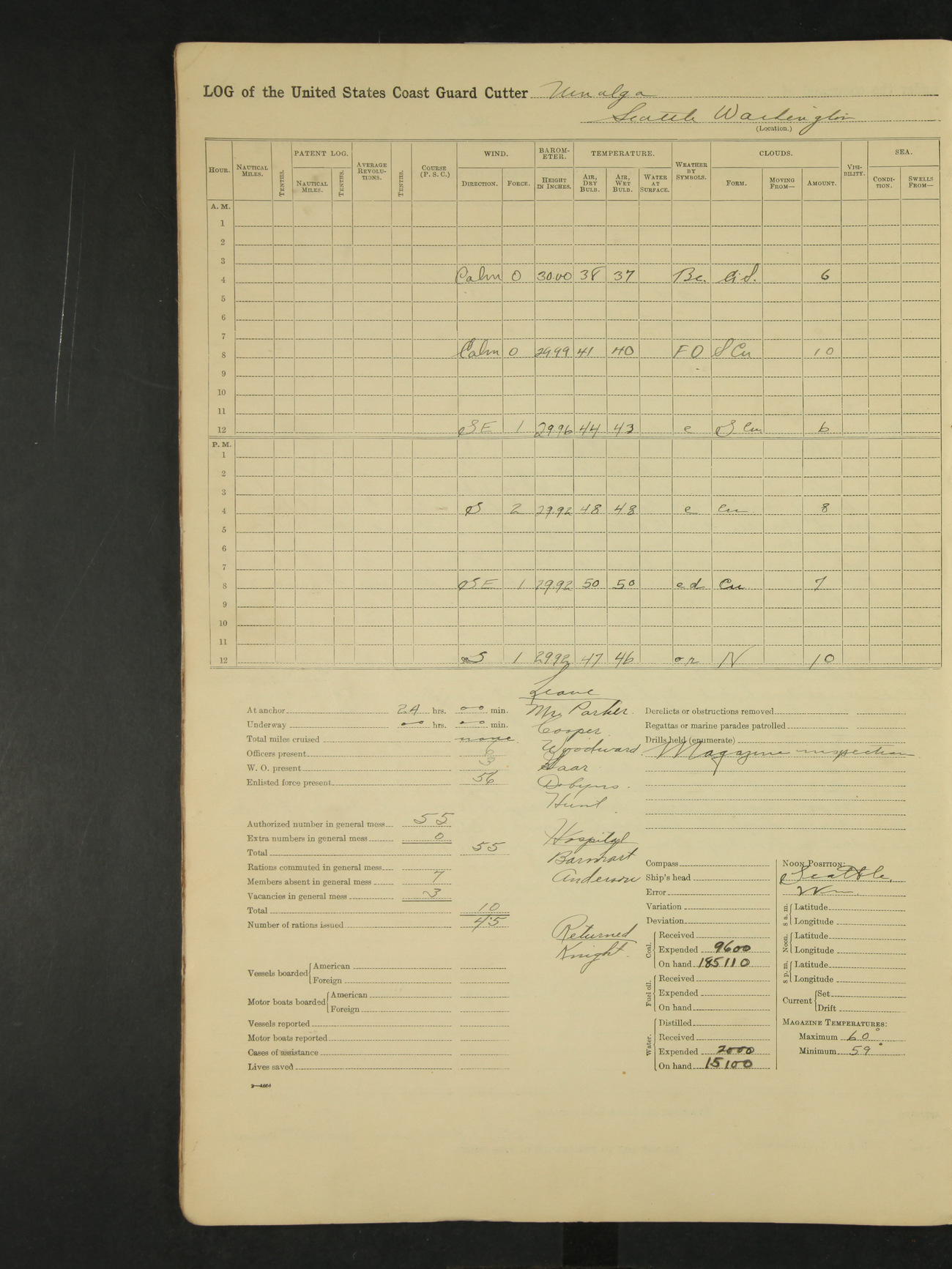 9:00am to 4:00pm Moored as above. Inspected magazine, temperature normal. Deck force engaged in coaling ship. Omitted quarters and drills on account of coaling ship. Leslie E Cole, F 2c placed on binnacle list. 3:40pm suspended coaling ship, having taken on board ninety (90) long tons. In compliance to Commander Northwestern Division telegram 9928-1440 December 1928, Unalga will convoy SS Starr to Cape Spencer Alaska, when the latter vessel is ready to proceed. Draft after coaling 13'6" forward, 14'00" aft. C.W. Thompson, Ensign.
