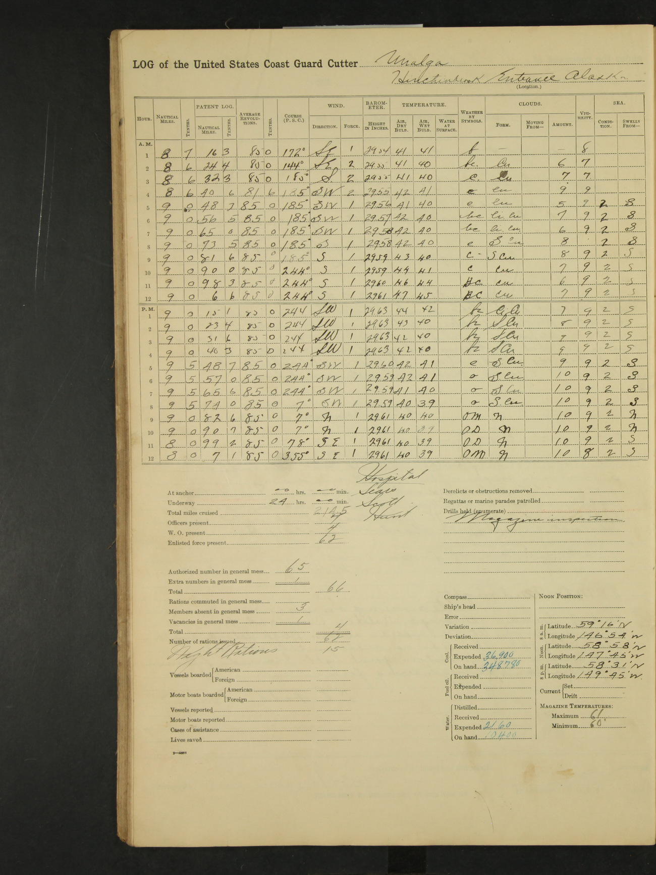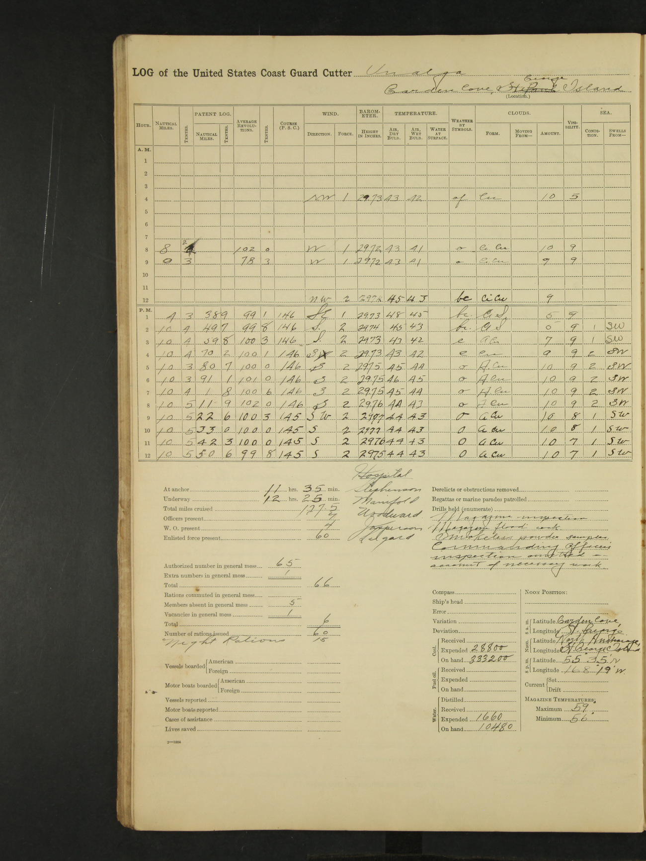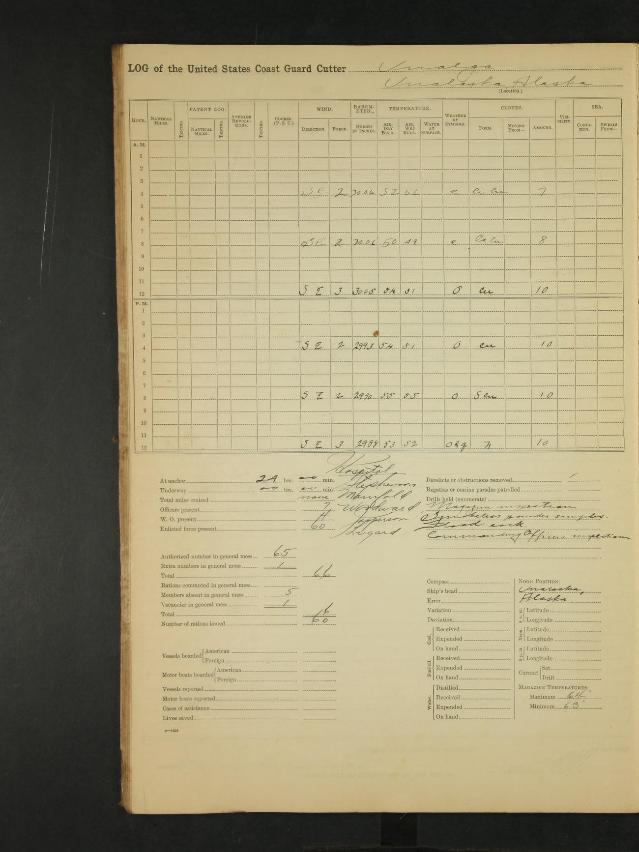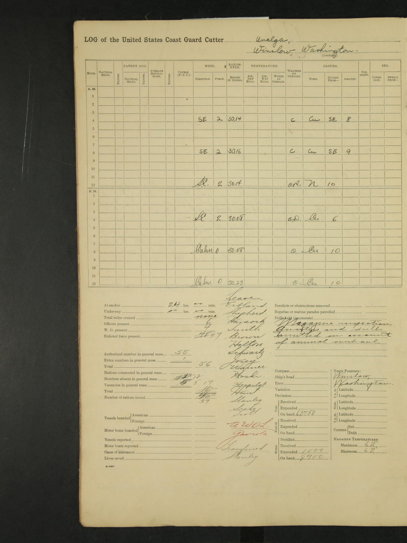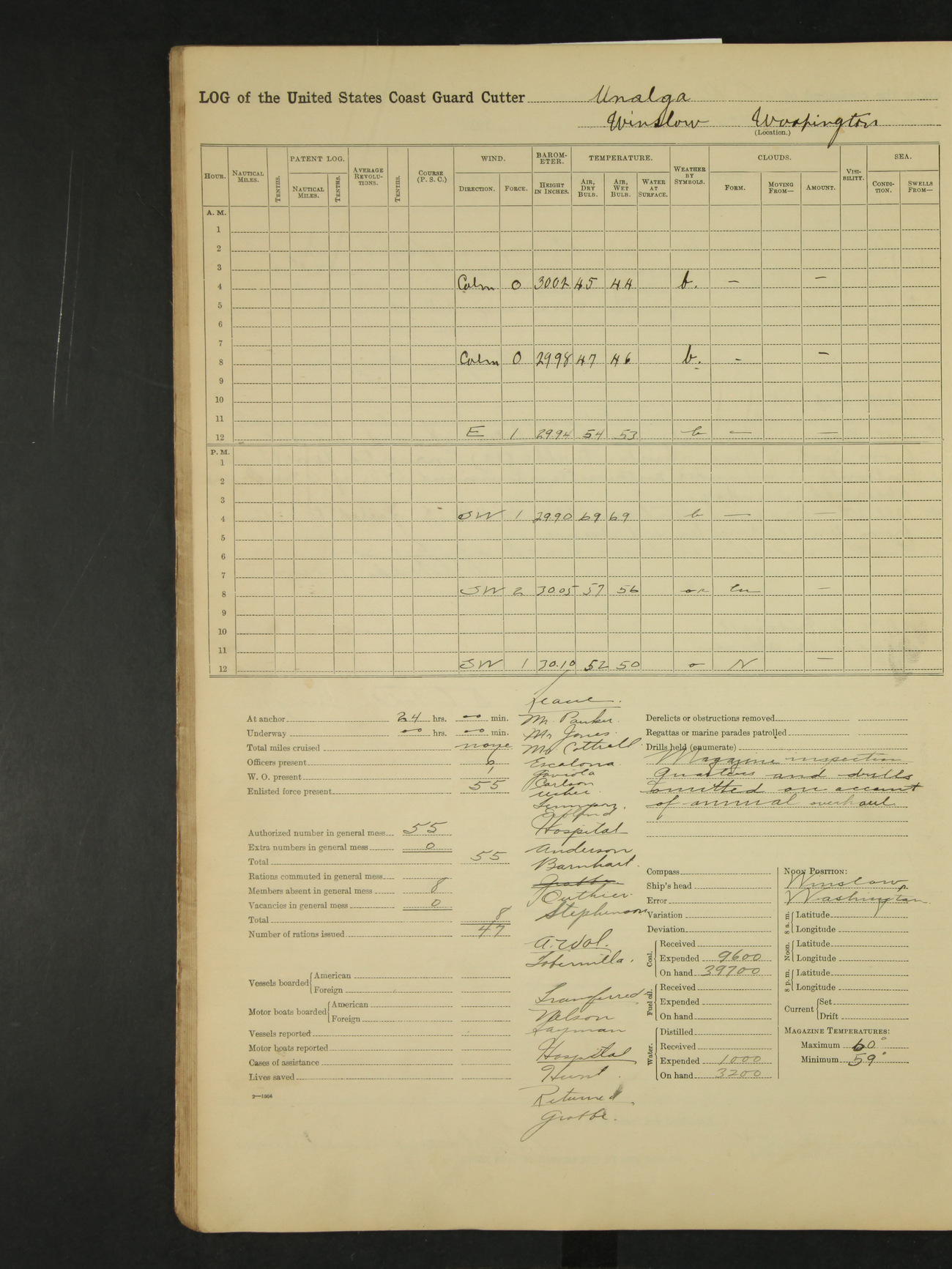 9:00am to 4:00pm Moored as above. Inspected magazine, temperature normal. Deck force engaged in coaling ship. Omitted quarters and drills on account of coaling ship. Leslie E Cole, F 2c placed on binnacle list. 3:40pm suspended coaling ship, having taken on board ninety (90) long tons. In compliance to Commander Northwestern Division telegram 9928-1440 December 1928, Unalga will convoy SS Starr to Cape Spencer Alaska, when the latter vessel is ready to proceed. Draft after coaling 13'6" forward, 14'00" aft. C.W. Thompson, Ensign.