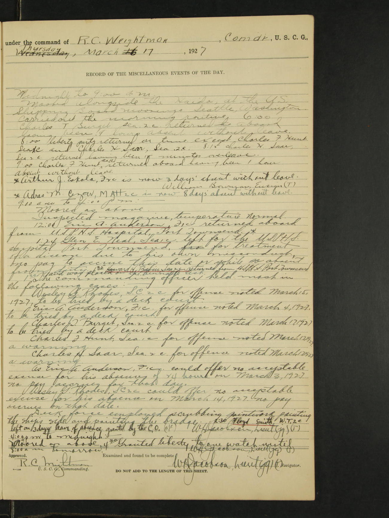 Charles F. Hunt, F 2c - 12:00am liberty party returned except Walter Scott, Sea 1c and Douglas A. McCullough, F 3c who could not be found and not notified, they are therefore unavoidably absent. Carl H. Widell, QM 2c, Clifford M. Wilson, RM 2c and Charles F. Hunt, F 2c who were notified and failed to return to ship are absent without leave
