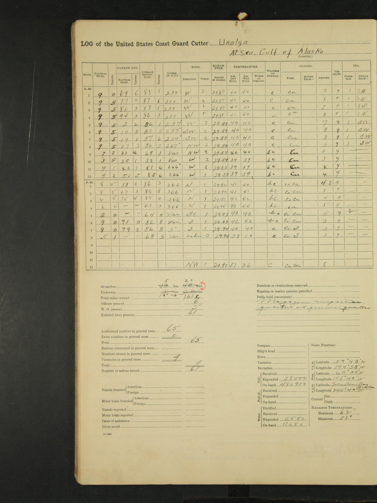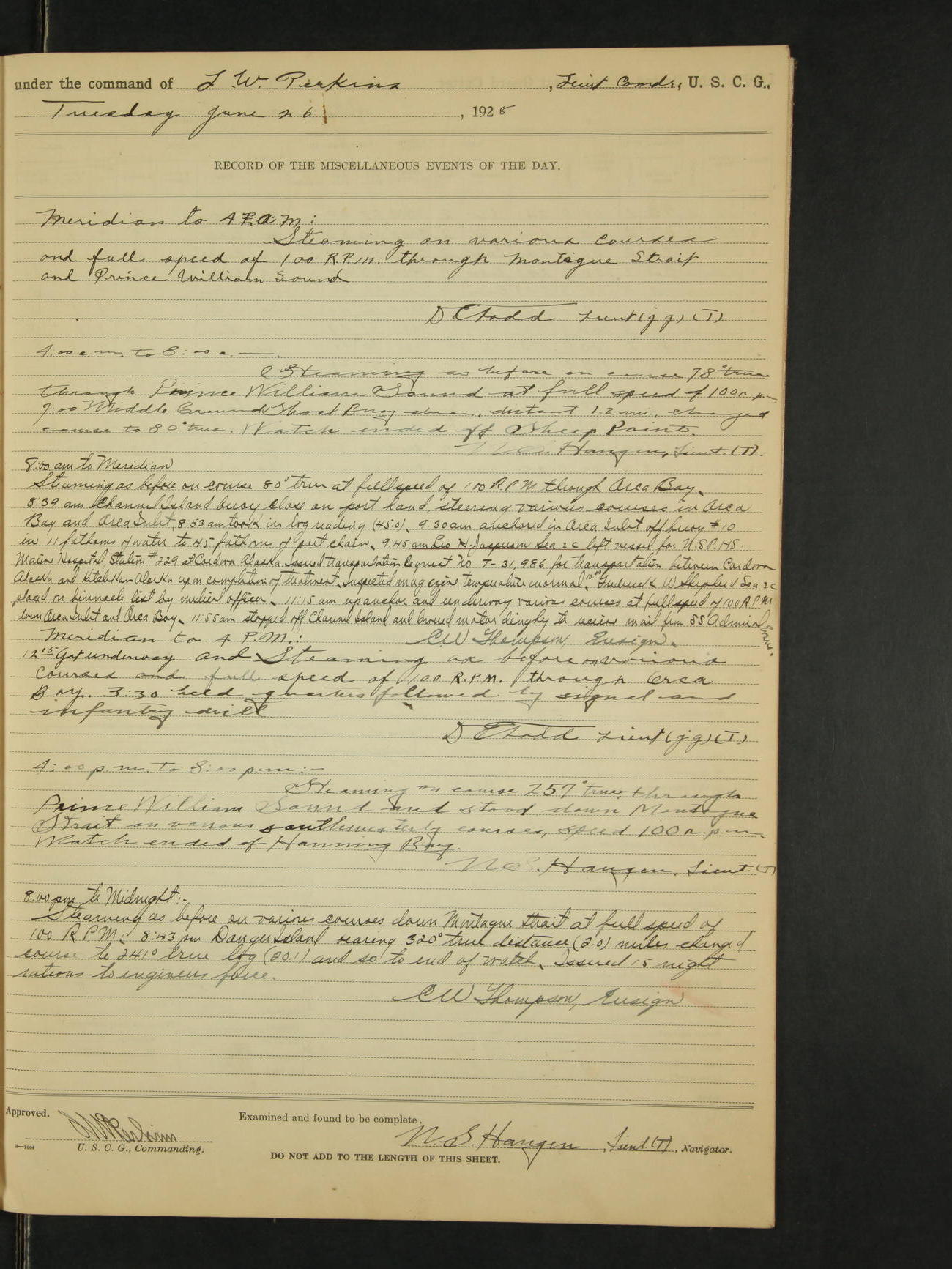 Meridian to 4:00PM: Steaming as above on course 289° true and full speed of 100 RPM through the Gulf of Alaska. D.E. Todd Lieut. (jg)(T).