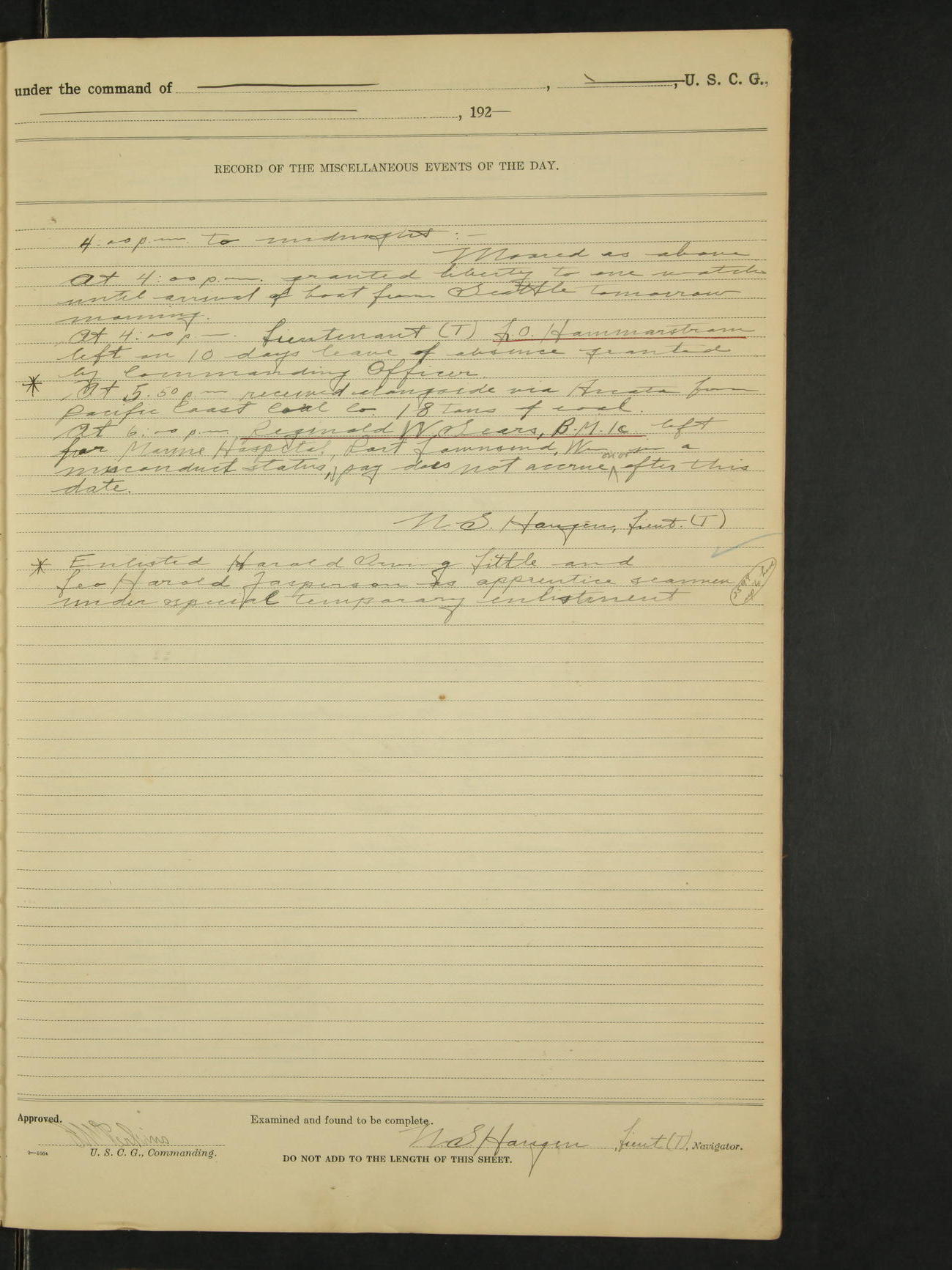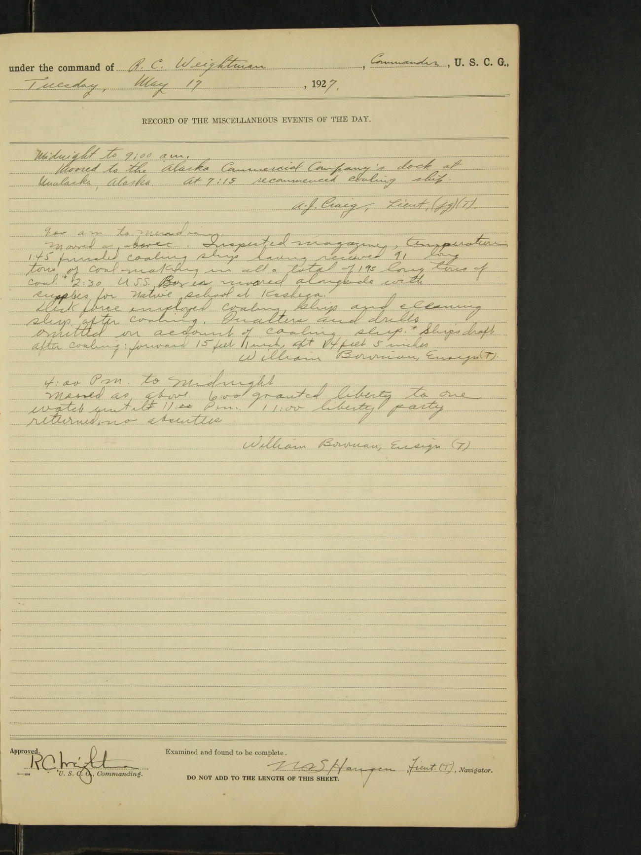 9:00am to 4:00pm:- Moored as above, receiving coal. Inspected magazine, temperature normal. 11:20 Charles A. Kramer, Eng 1c returned from leave of absence on time. 11:30 Prendy Powell QM 1c returned on board from approximately two hours absence without leave for which offence he was sentenced, by the Commanding Officer at Mast, to be deprived of three liberties. 12:20 Finished coaling ship, having received from the Pacific Coast Coal Company 110 long tons of coal this date. Ship's draft after coaling 14'3" forward and 14'3" aft. 1:20 Hauled ship ahead with lines to usual position at the Alaska Steamship Company's dock. 2:00 Commenced cleaning after coaling. Deck force employed coalings hip and cleaning after coaling. Quarters and drills omitted on account of work incident to coaling ship. A.J. Craig, Ensign (T)