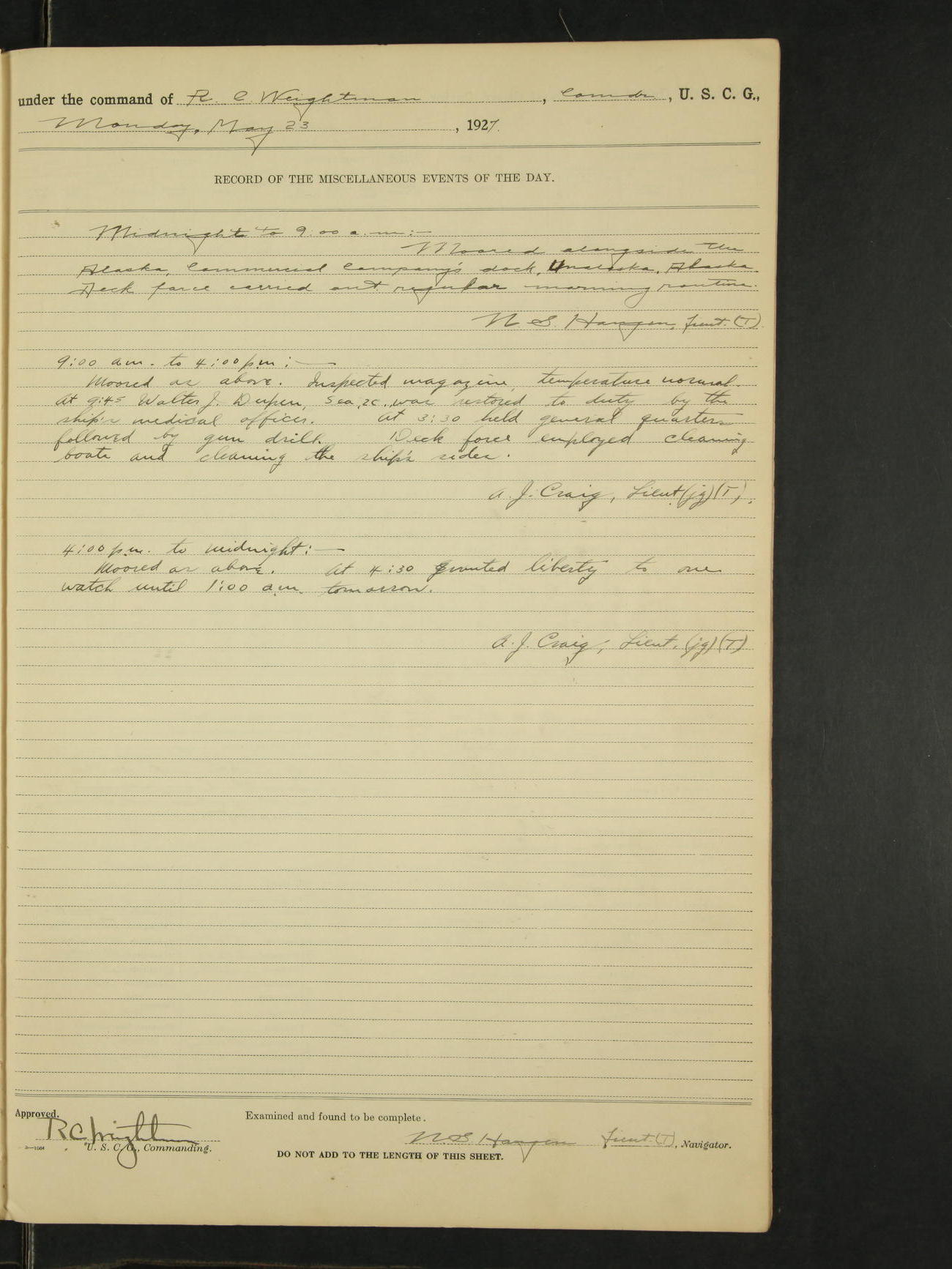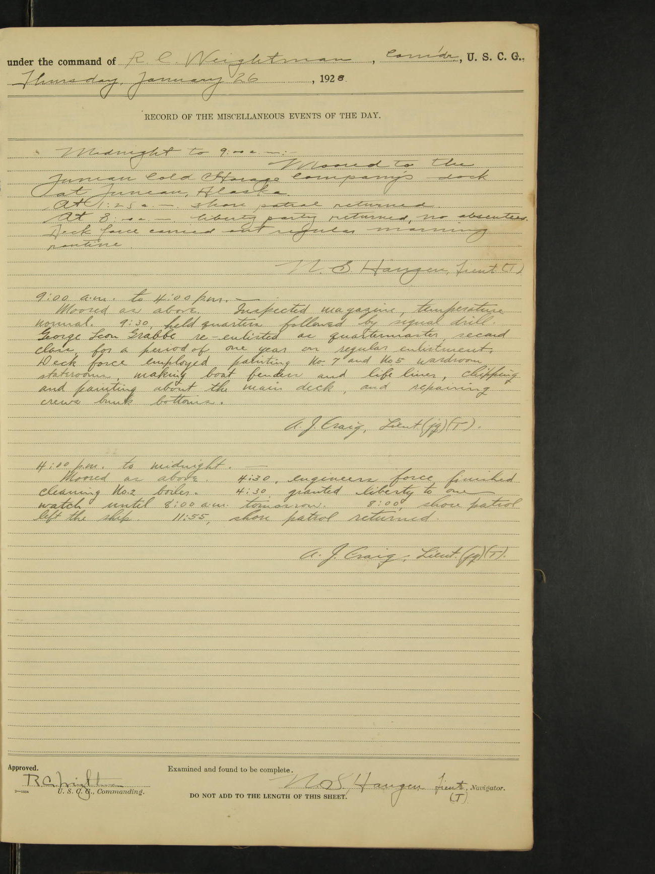 Midnight to 9:00am:- Moored to the Alaska Steamship Company's dock at Juneau Alaska. Carried out the Sunday morning routine. A.J. Craig, Ensign (T)