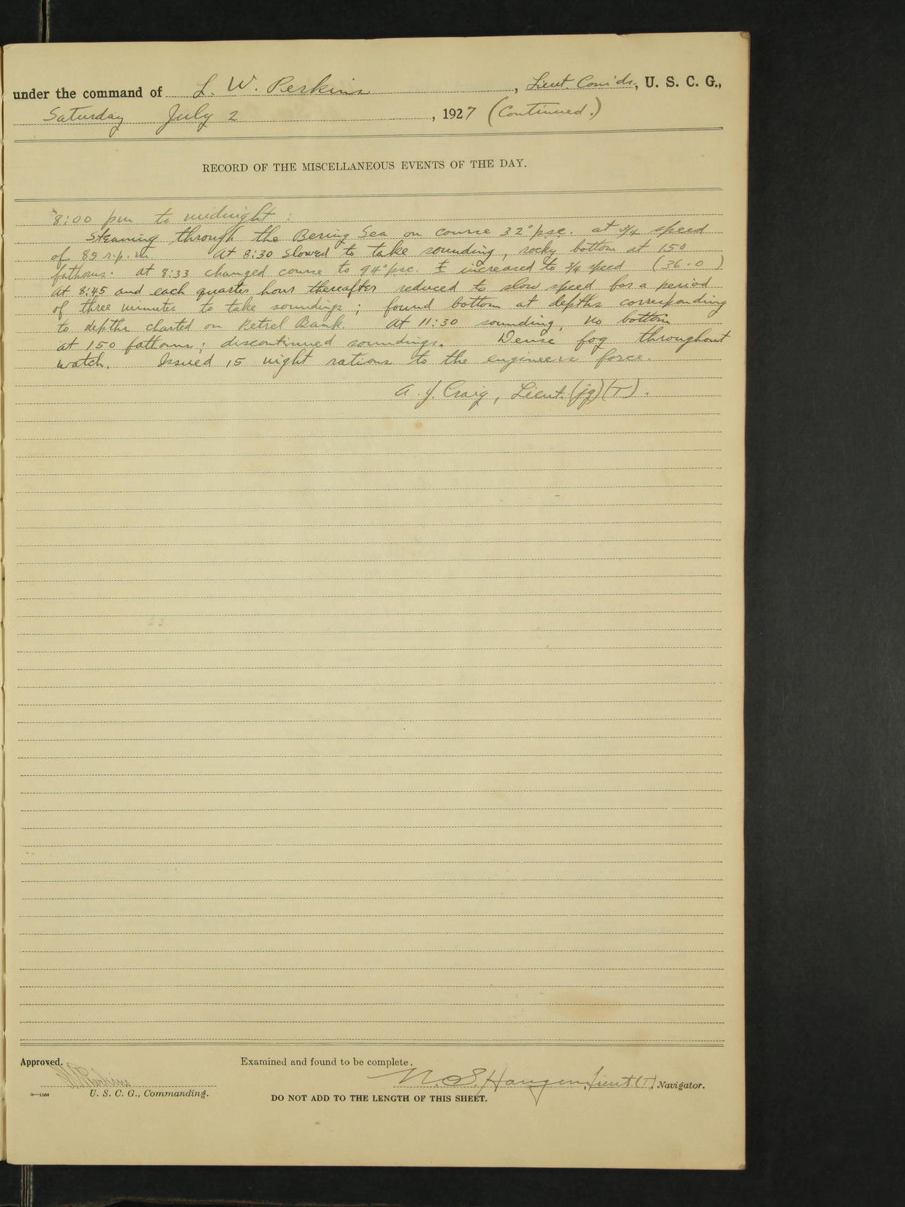 8:00pm to Midnight: Steaming as before on course 289° true at full speed of 100 RPM through the Gulf of Alaska. Issued 15 night rations to engineers force. C.W. Thompson, Ensign.