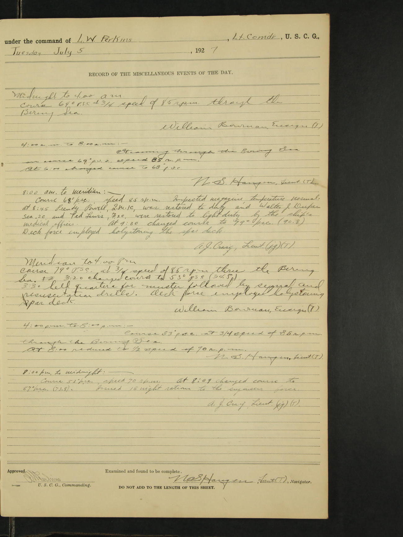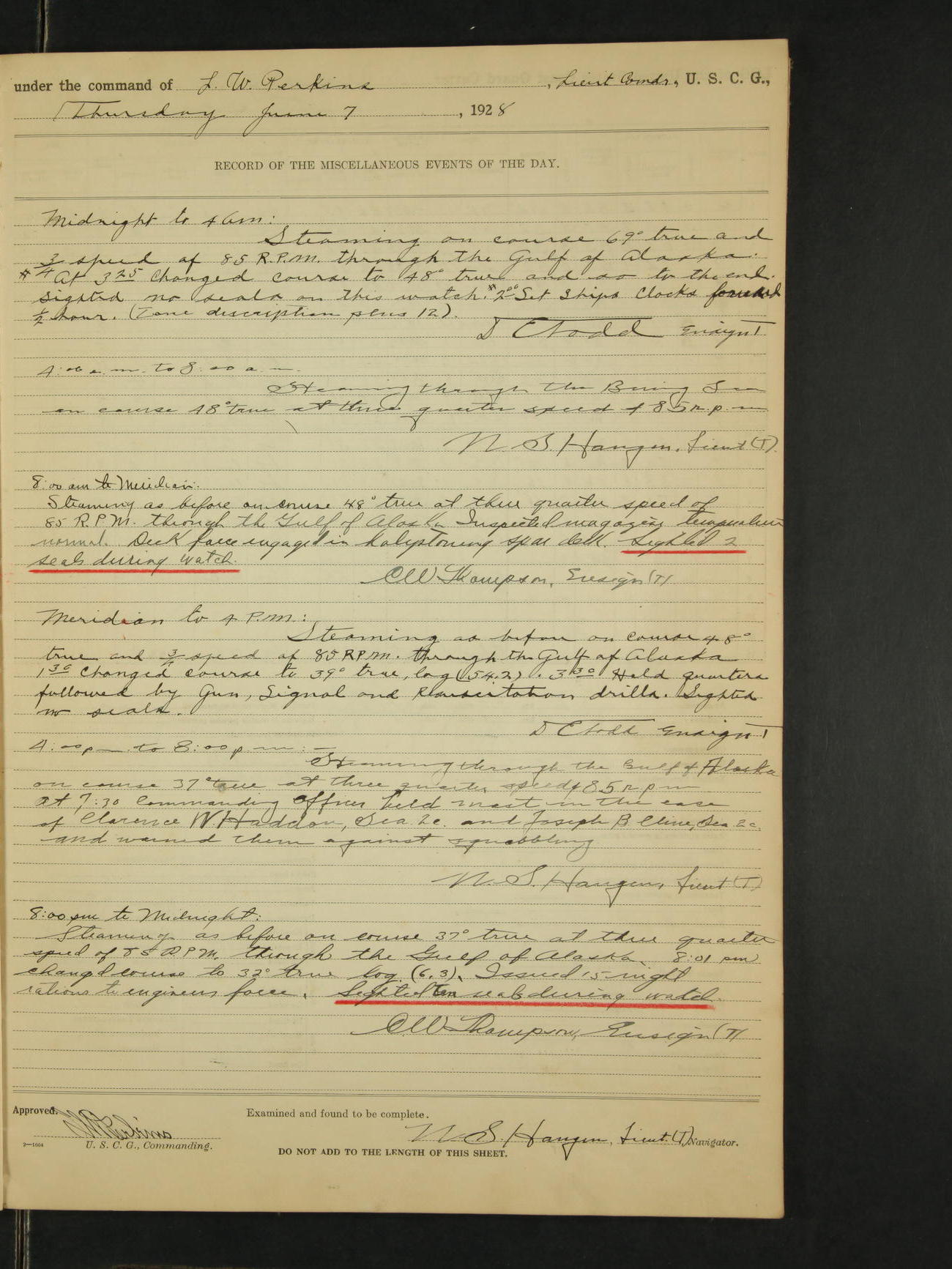 4:00am to 8:00am:- Steaming as before on course 289° true at full speed of 100 rpm through the Gulf of Alaska. N.S. Haugen, Lieut. (T).
