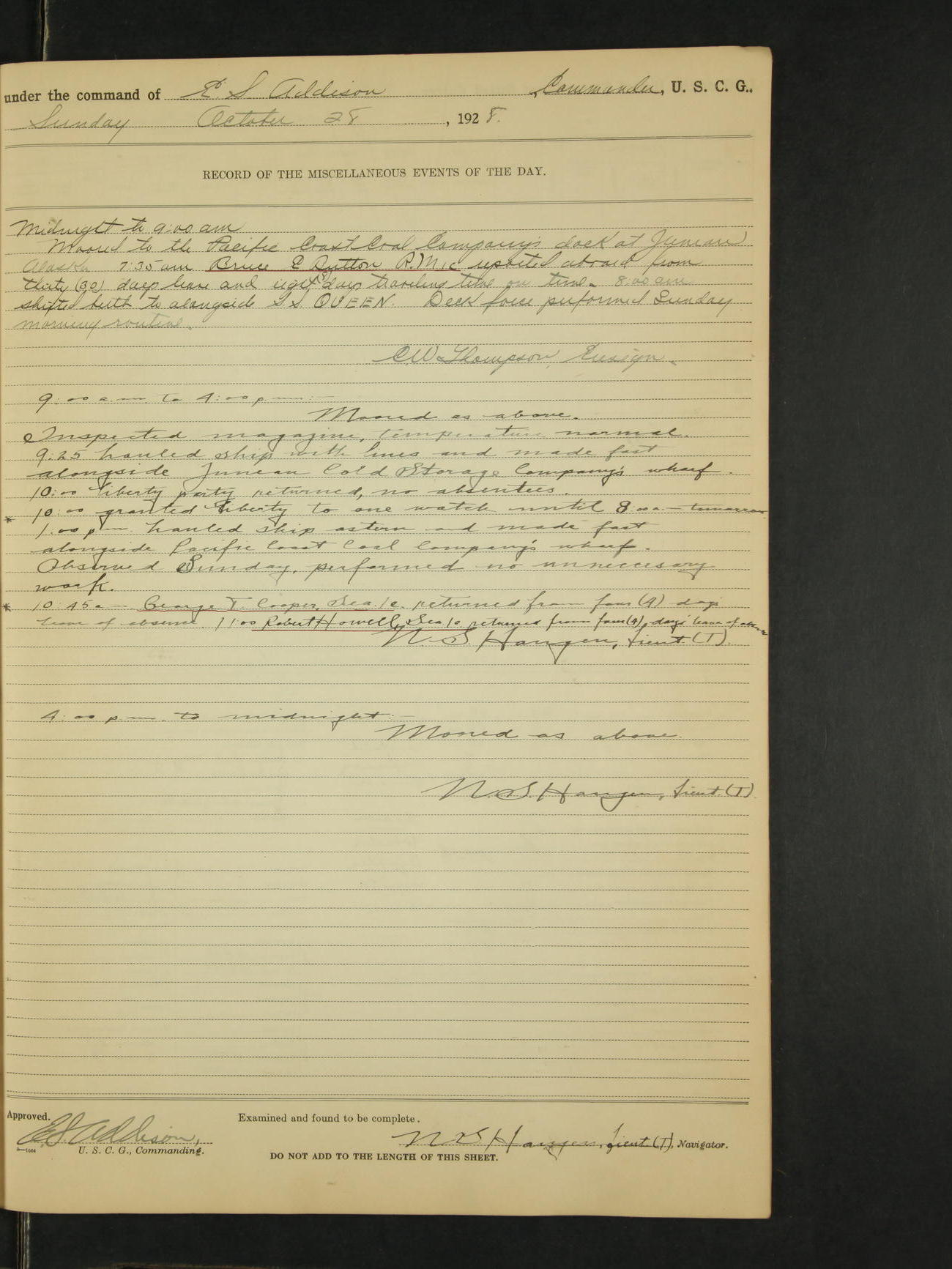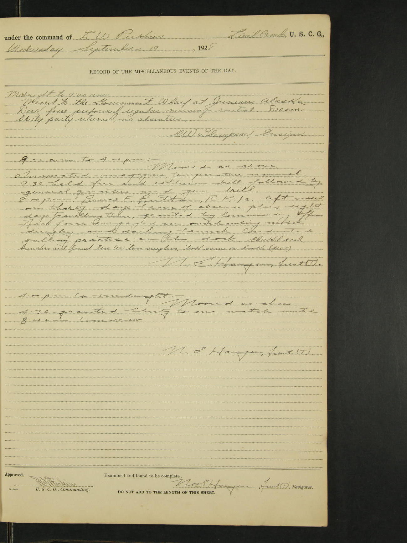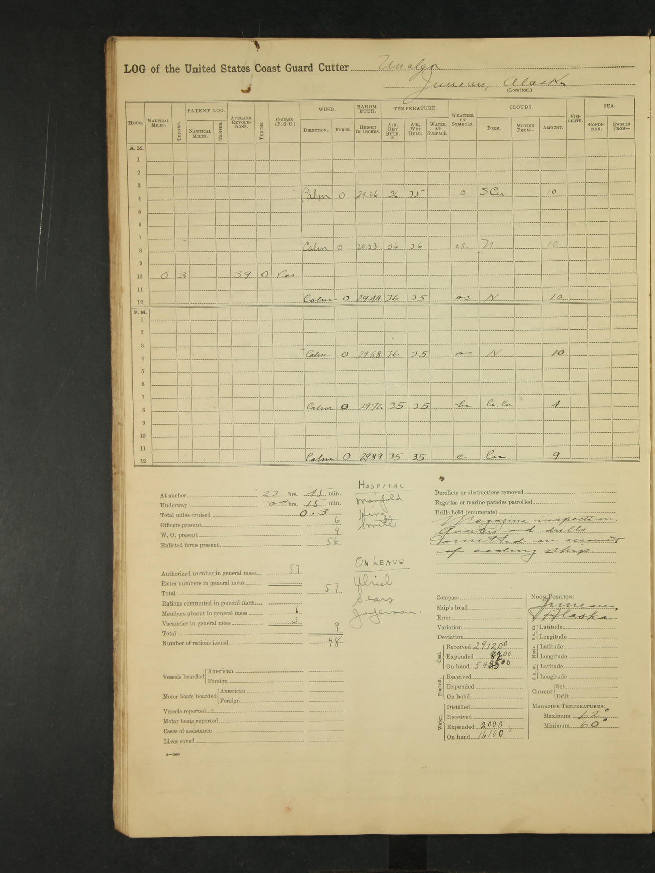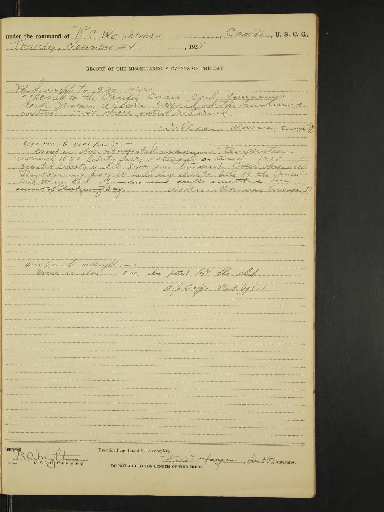 Midnight to 9:00am. Moored to the Alaska Steamship Company's Dock, Juneau, Alaska. Carried out the morning routine. 8:00 liberty party returned; no absentees. William Bowman, Ensign (T)