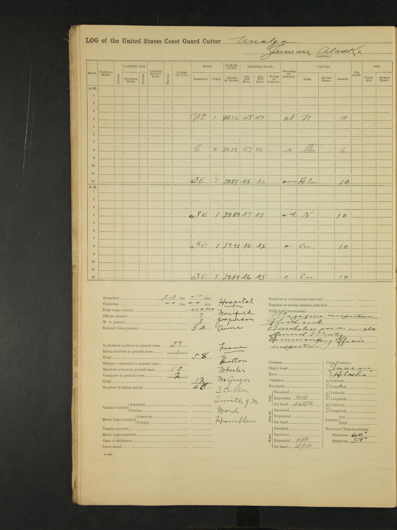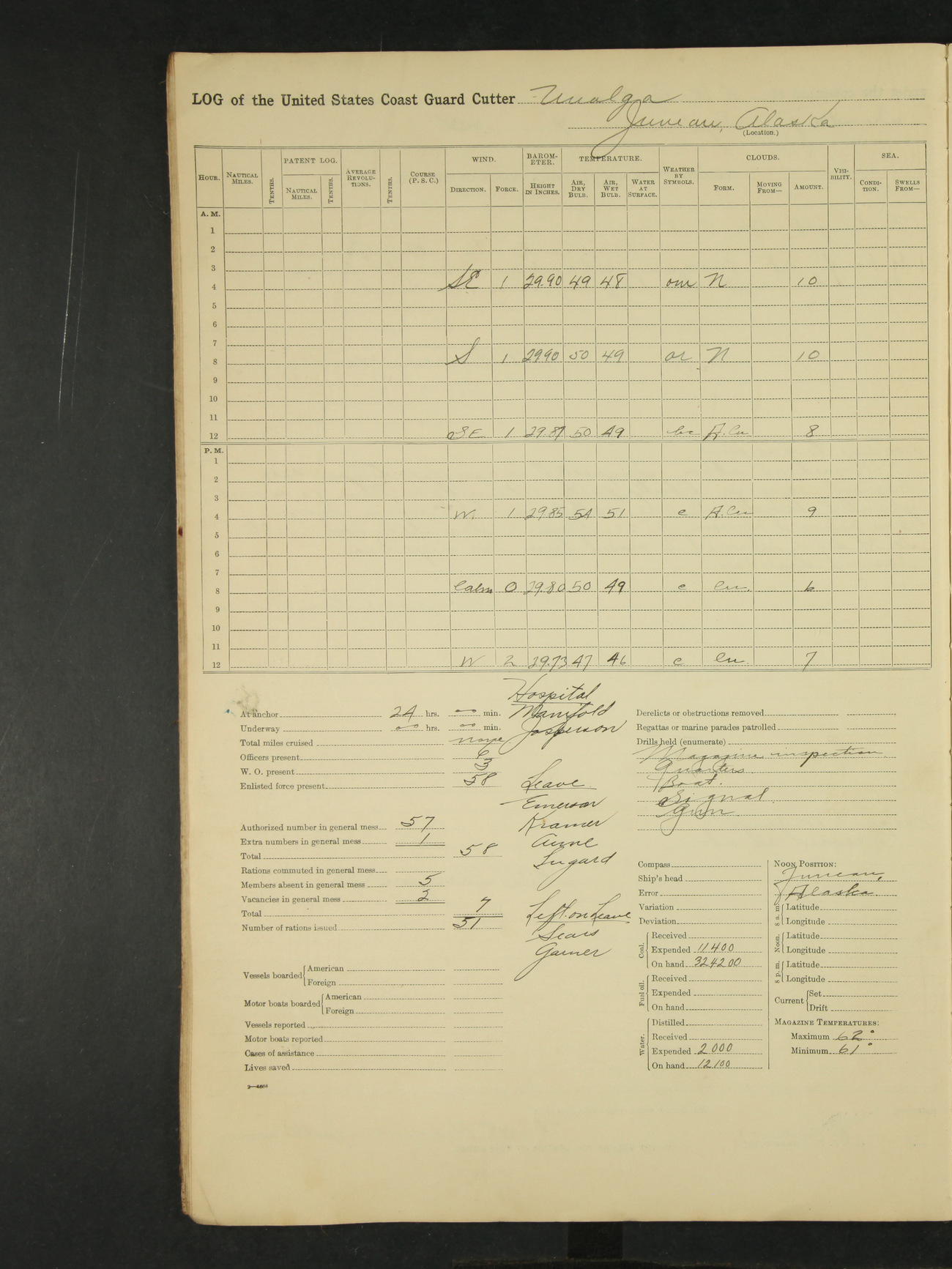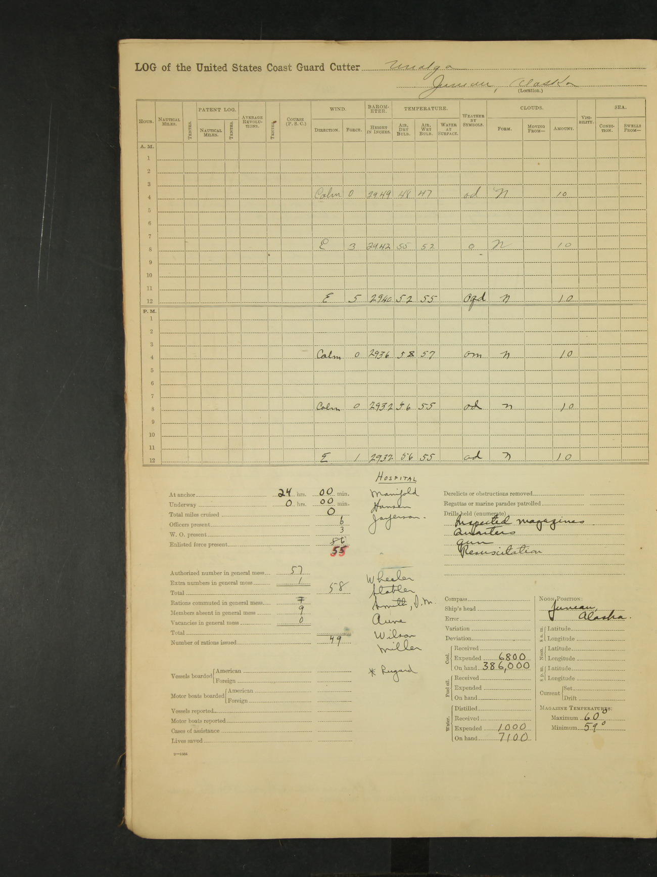 Midnight to 9:00am. Moored to the Alaska Steamship Company's Dock, Juneau, Alaska. Carried out the morning routine. 8:00 liberty party returned; no absentees. William Bowman, Ensign (T)