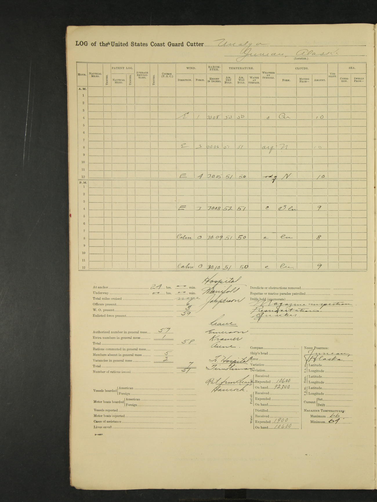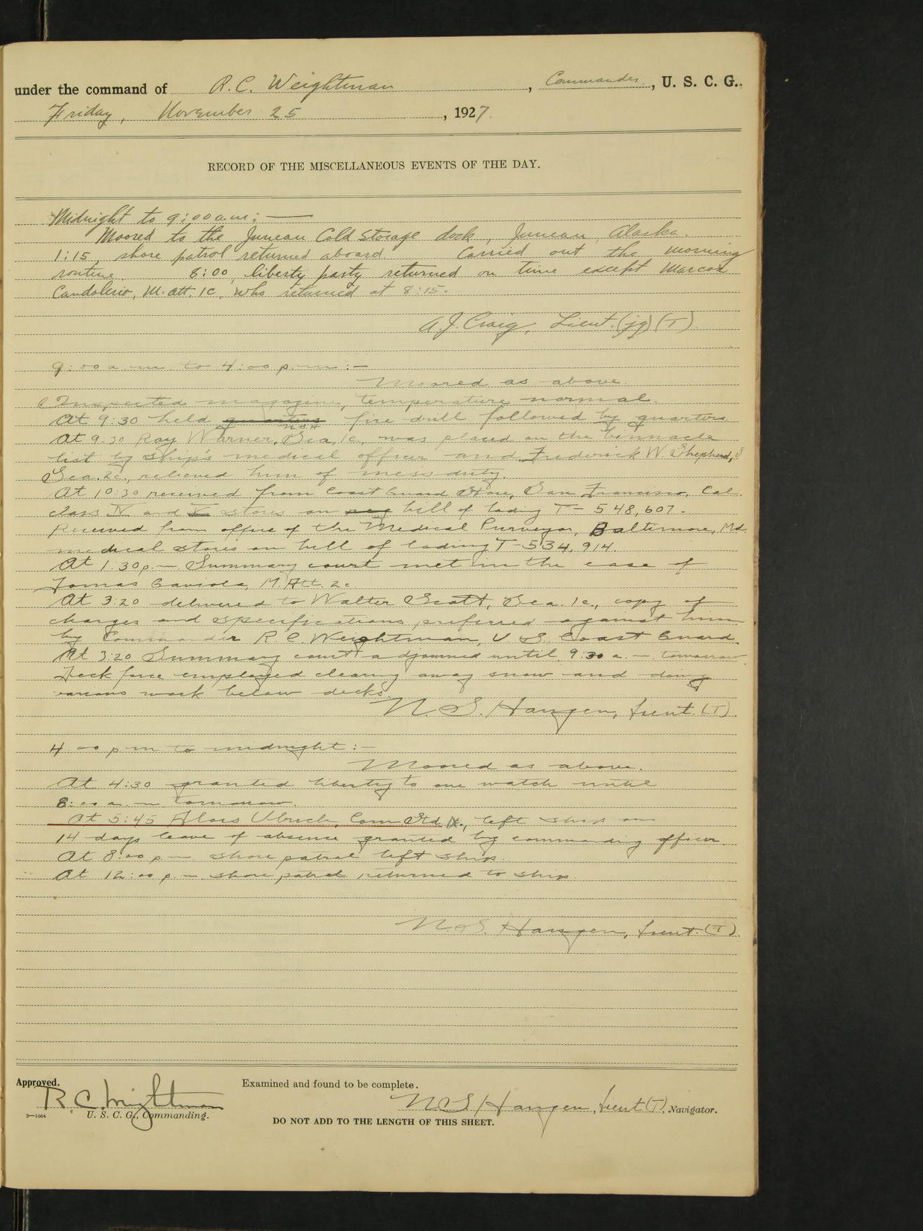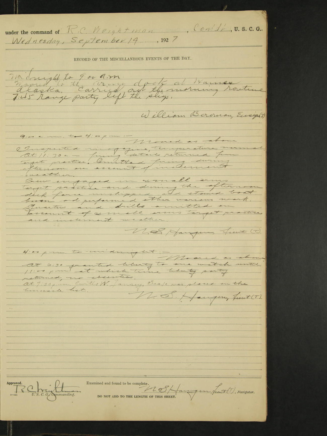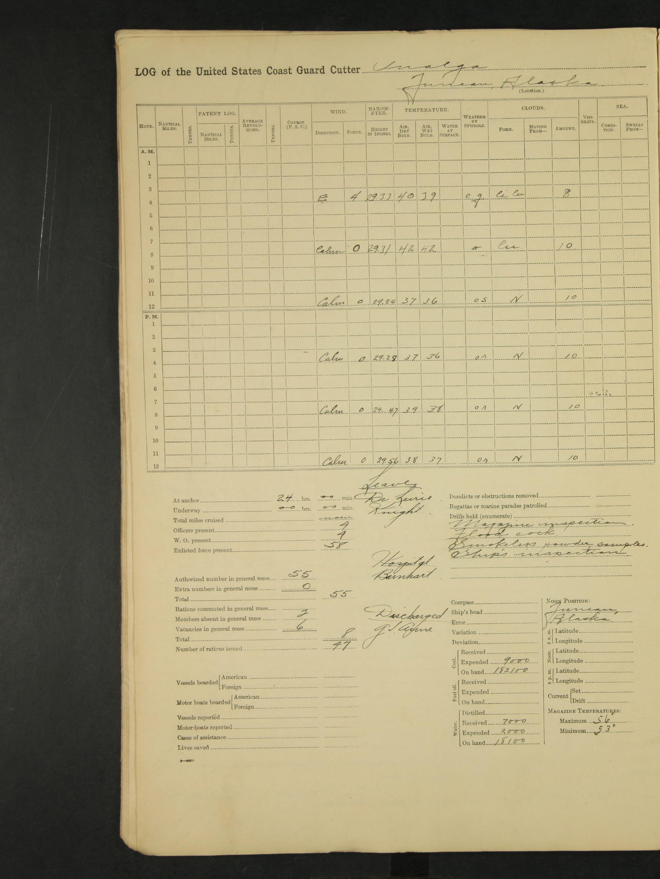 Midnight to 9:00am. Moored to the Alaska Steamship Company's Dock, Juneau, Alaska. Carried out the morning routine. 8:00 liberty party returned; no absentees. William Bowman, Ensign (T)