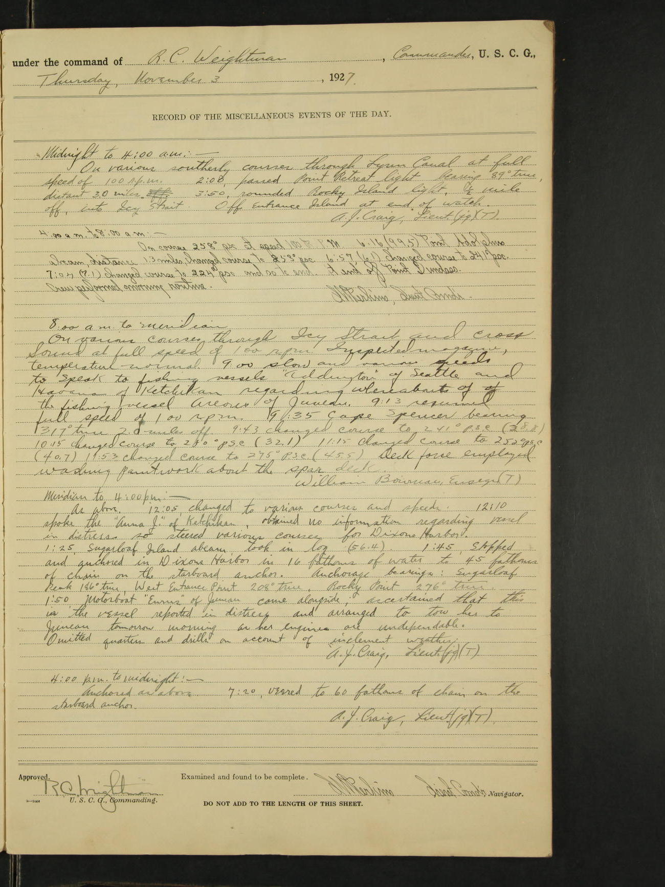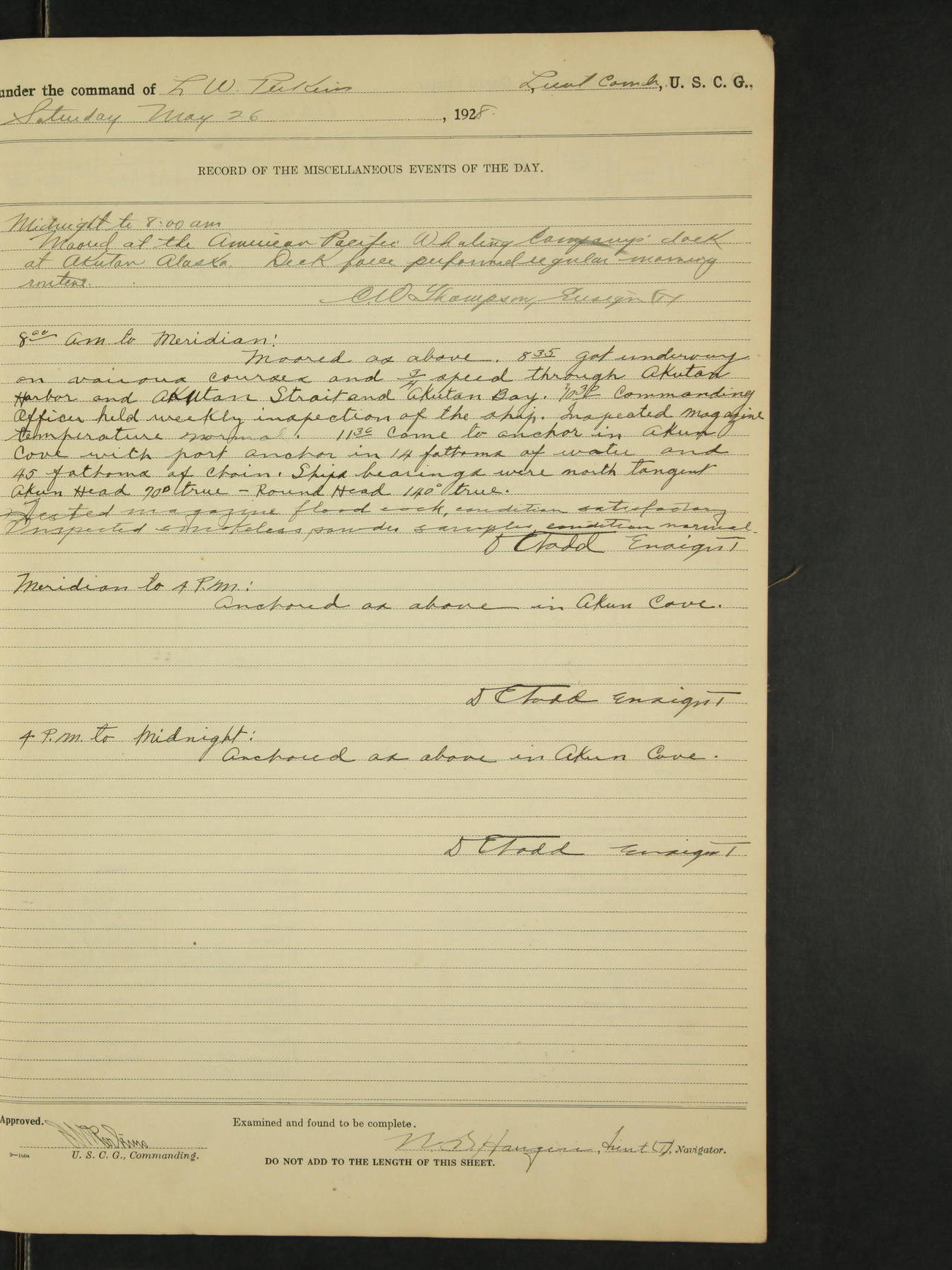 Meridian to 4:00PM: Steaming as before on various courses and half speed of 80 RPM through Orca Inlet with SS Starr in tow. 12:10 Came to anchor in Orca Inlet in 7 1/2 fathoms of water and 30 fathoms of chain: starboard anchor. Anchorage bearings, Orca Cannery 198° true, Right tangent Observation Island 298° true. 12:20 SS Starr came to Anchor. 12:25 Cast off and hauled in towing hawser. 12:25 Dinghy left ship for SS Starr to gather up running lines, shackles and shot line. 12:45 Dinghy returned to ship with all gear. 1:20 Up anchor and got underway on various courses and half speed of 70 RPM through Orca Inlet. 1:55 Moored to Copper River and North Western Railway dock, Cordova, Alaska. Expended one shoulder gun shot line used to get line to SS Starr. D.E. Todd Lieut. (jg)(T).