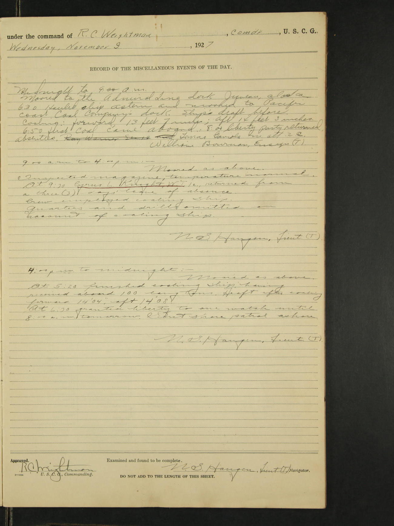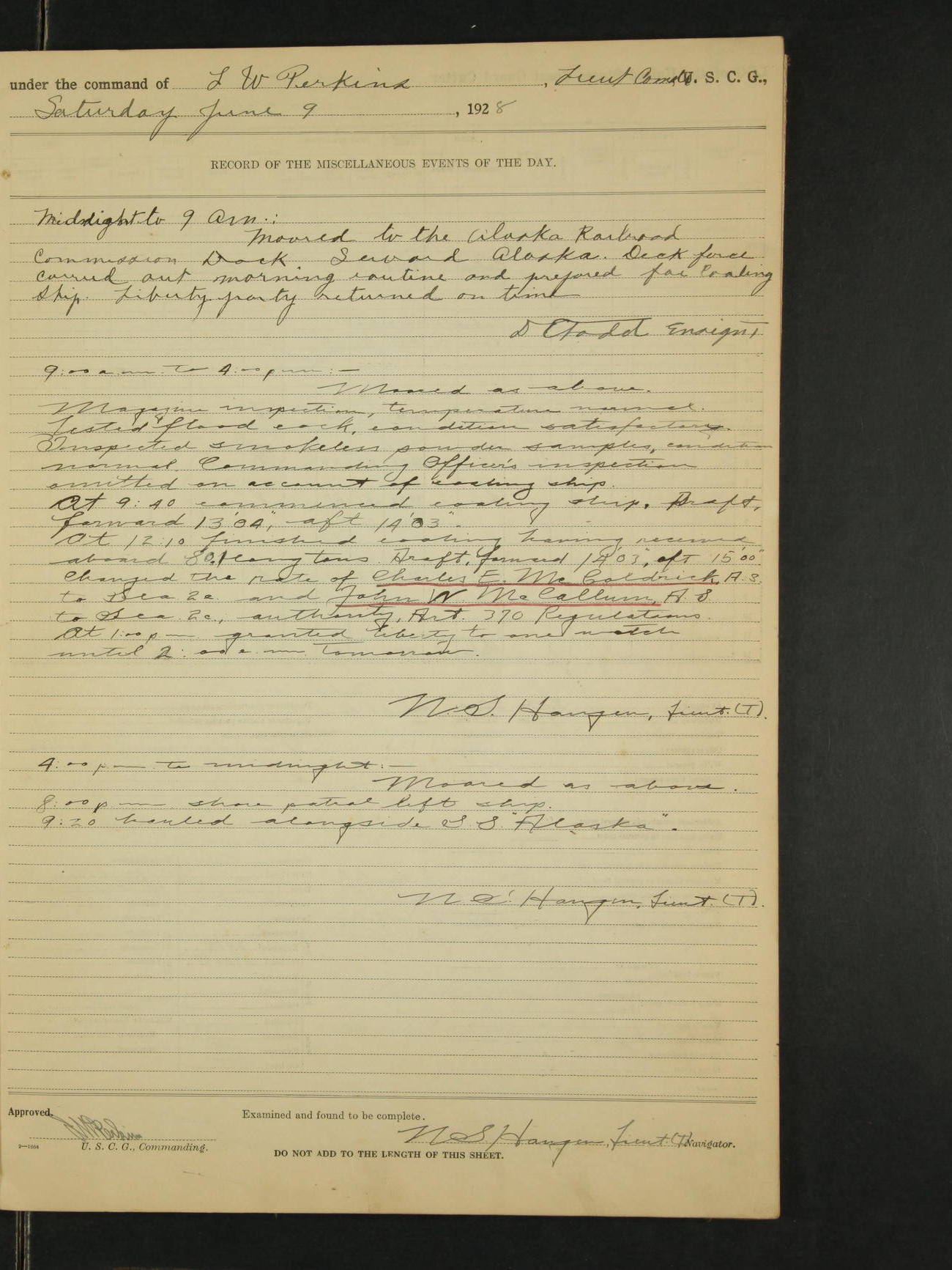 9:00am to 4:00pm:- Moored as above. Inspected magazine, temperature normal. Tested magazine flood cock, condition satisfactory. Inspected smokeless powder samples, condition normal. 11:00am Commanding officer inspected ship throughout. 11:00 received telegram from Northwestern Division 9929-1045 stating that gas boat Shasta was overdue at Juneau from Cordova and to look for her as opportunity affords. Deck force engaged in coaling ship. 1:30 finished coaling ship having received aboard 142 long tons and 1440 lbs. Ship's draft, forward 13'09", aft 14'04". 3:30pm granted liberty to one watch until 8:00am tomorrow. N.S. Haugen, Lieut. (T).