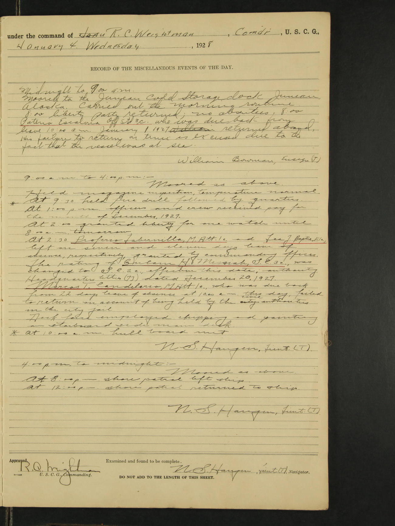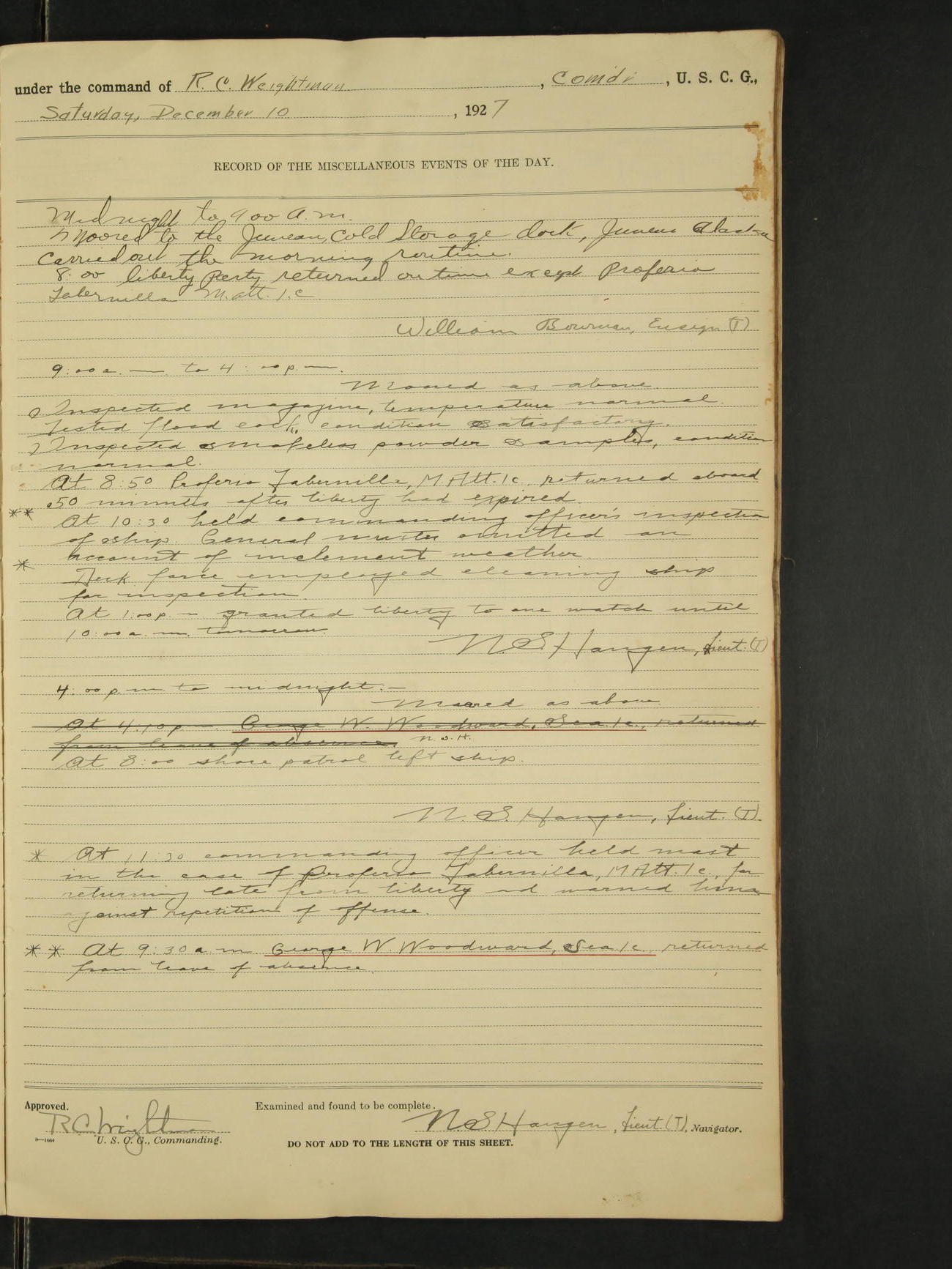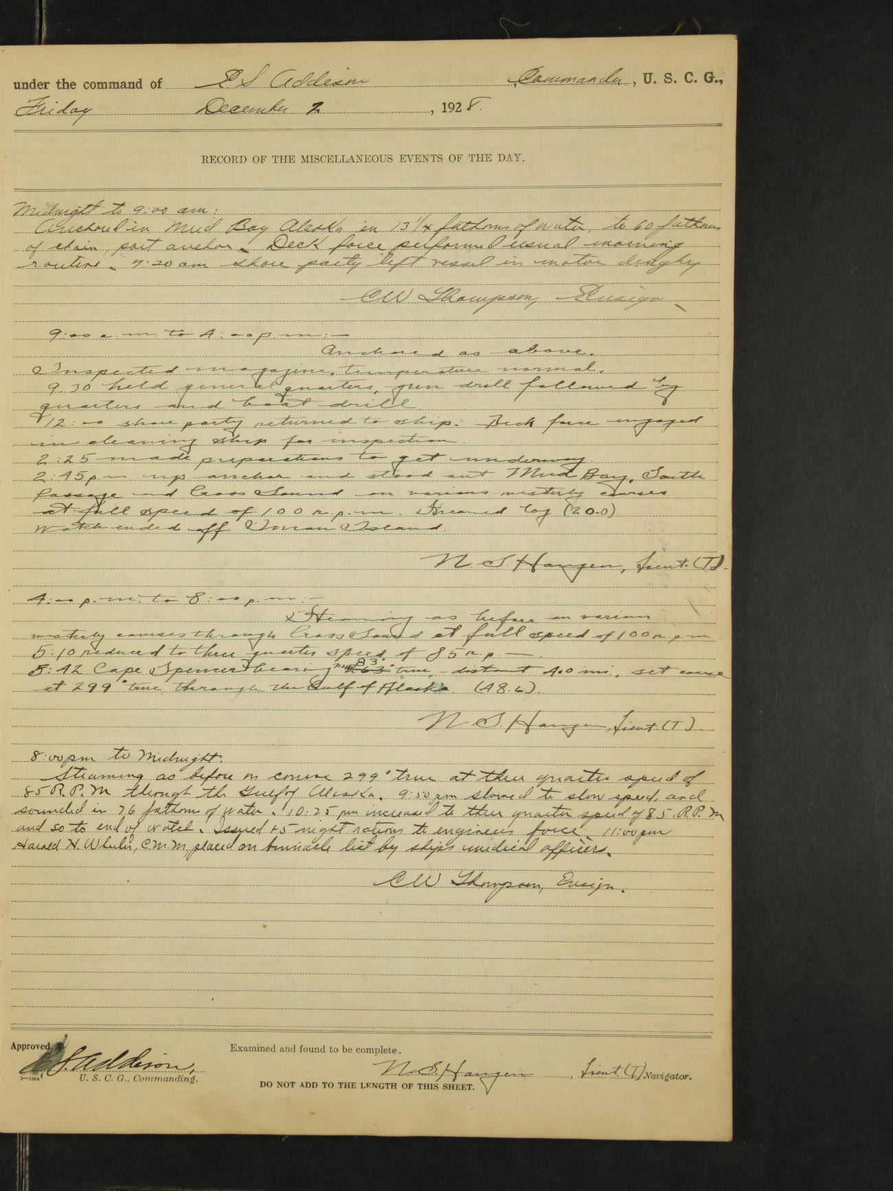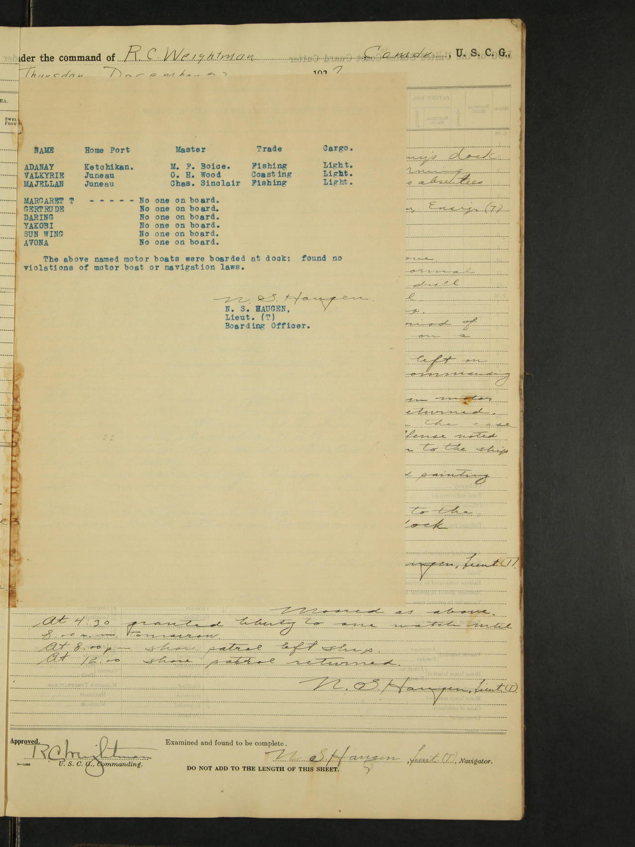 4:00pm to midnight:- Moored as above. 9:20 received information that SS Roosevelt and SS Starr were in distress off Cape St. Elias, so recalled all the liberty party and made preparations to get underway. 11:05pm AA Surgeon L.B. Sturdevant left on leave of absence to expire Dec 31, 1928, authority Headquarters telegram 9905-1040. 12:00am liberty party returned except Walter Scott, Sea 1c and Douglas A. McCullough, F 3c who could not be found and not notified, they are therefore unavoidably absent. Carl H. Widell, QM 2c, Clifford M. Wilson, RM 2c and Charles F. Hunt, F 2c who were notified and failed to return to ship are absent without leave. N.S. Haugen, Lieut. (T).