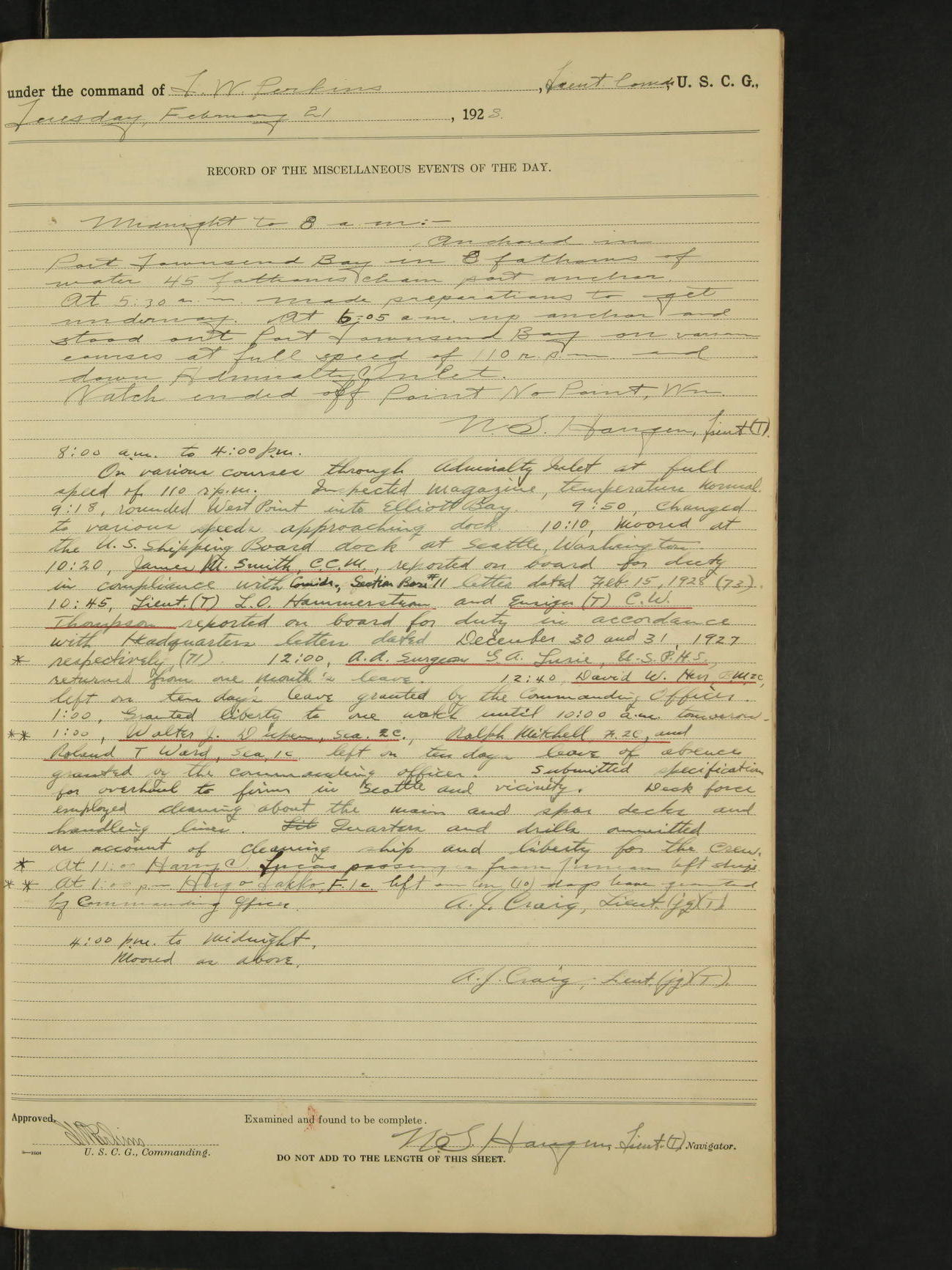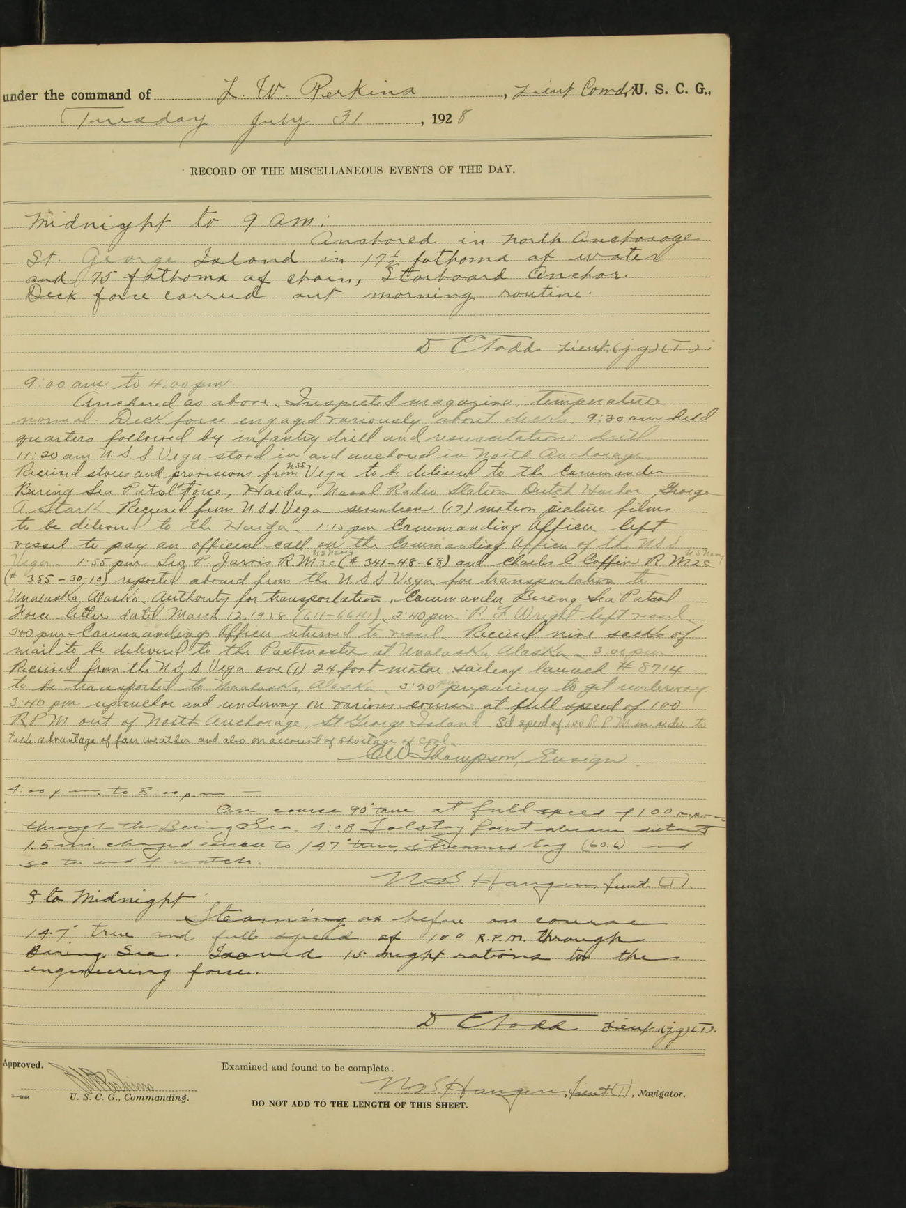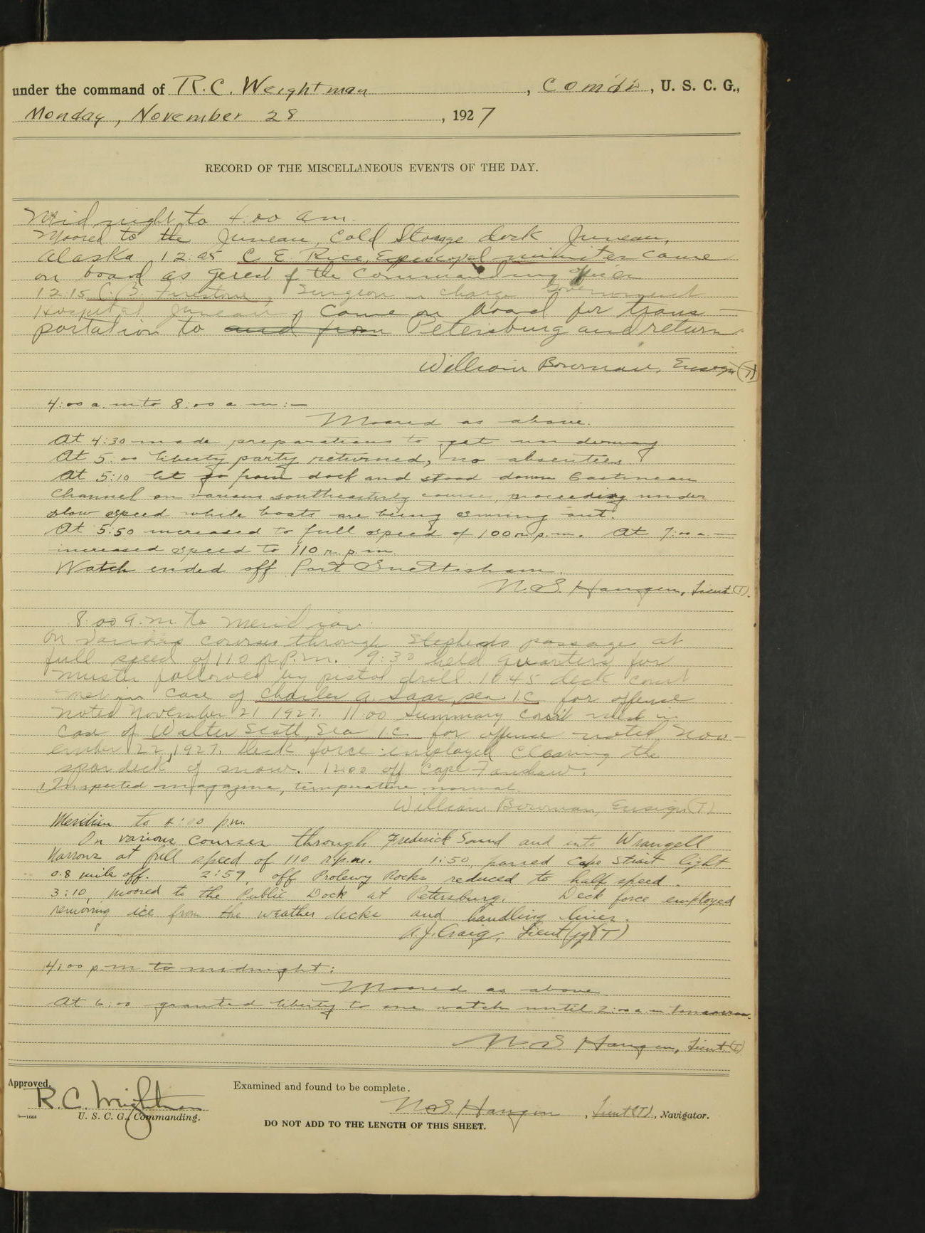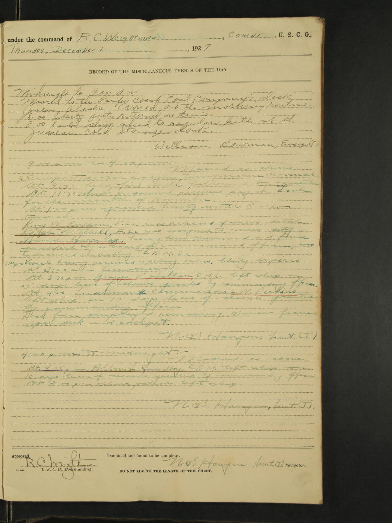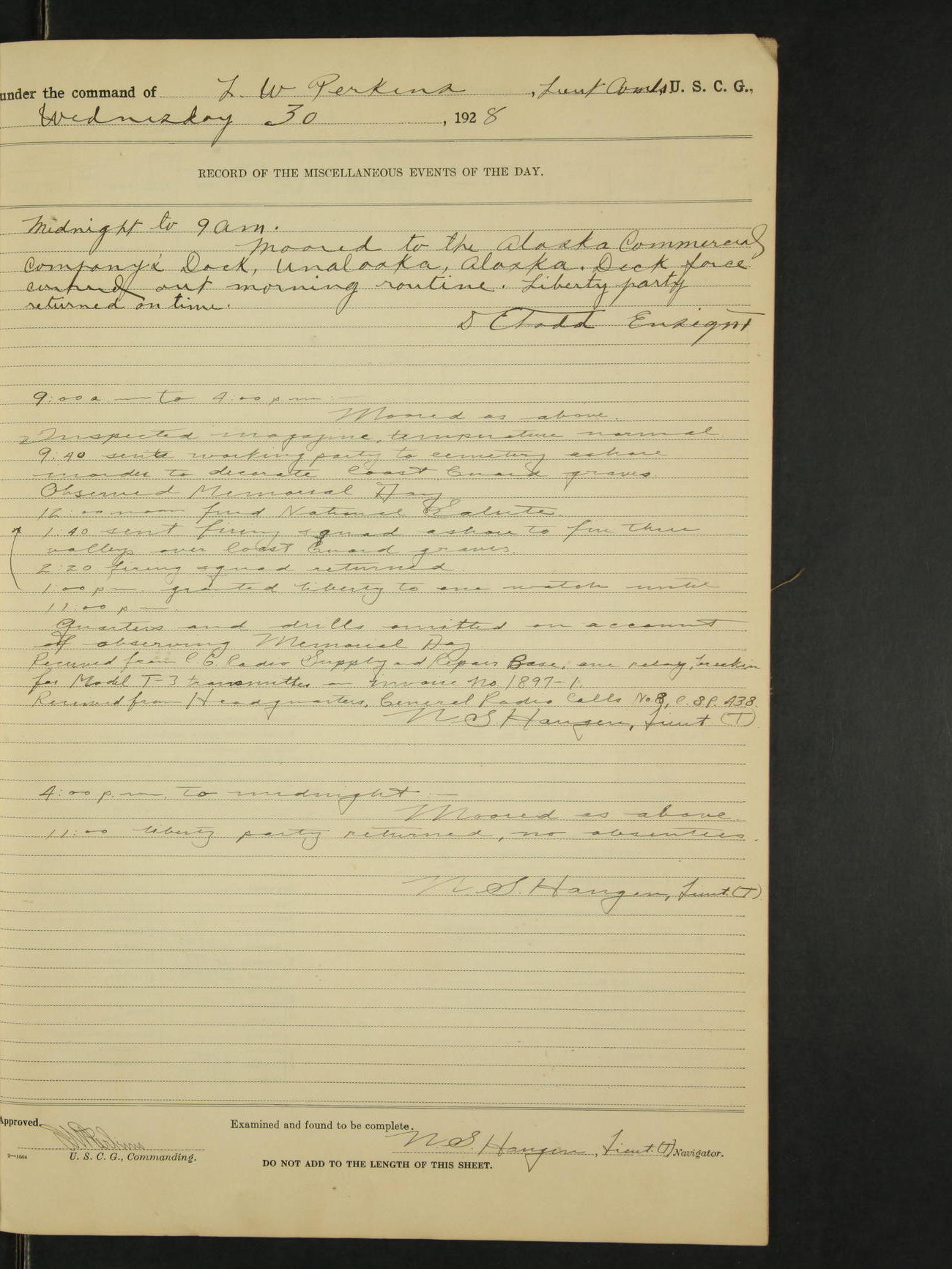 4:00pm to midnight:- Moored as above. 9:20 received information that SS Roosevelt and SS Starr were in distress off Cape St. Elias, so recalled all the liberty party and made preparations to get underway. 11:05pm AA Surgeon L.B. Sturdevant left on leave of absence to expire Dec 31, 1928, authority Headquarters telegram 9905-1040. 12:00am liberty party returned except Walter Scott, Sea 1c and Douglas A. McCullough, F 3c who could not be found and not notified, they are therefore unavoidably absent. Carl H. Widell, QM 2c, Clifford M. Wilson, RM 2c and Charles F. Hunt, F 2c who were notified and failed to return to ship are absent without leave. N.S. Haugen, Lieut. (T).