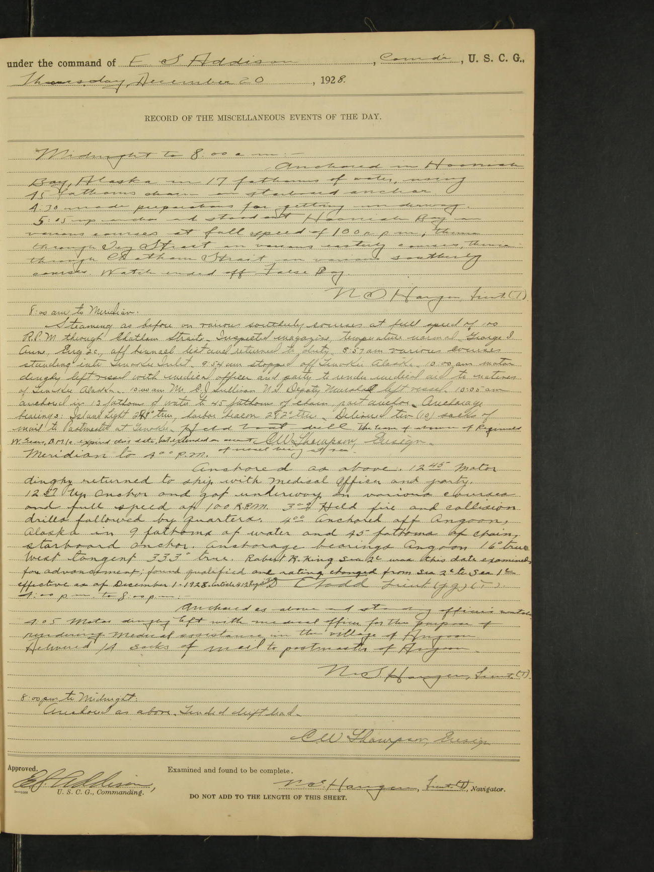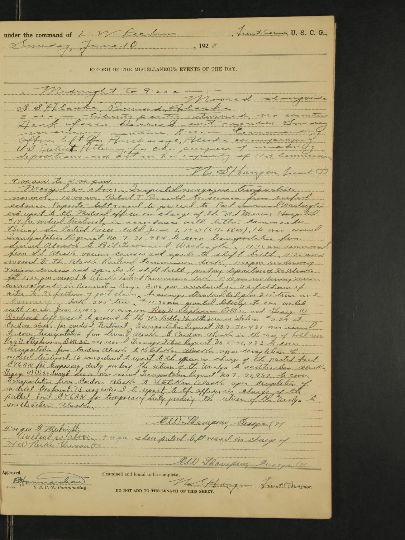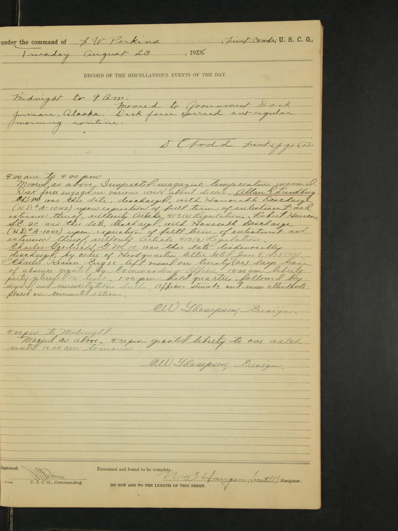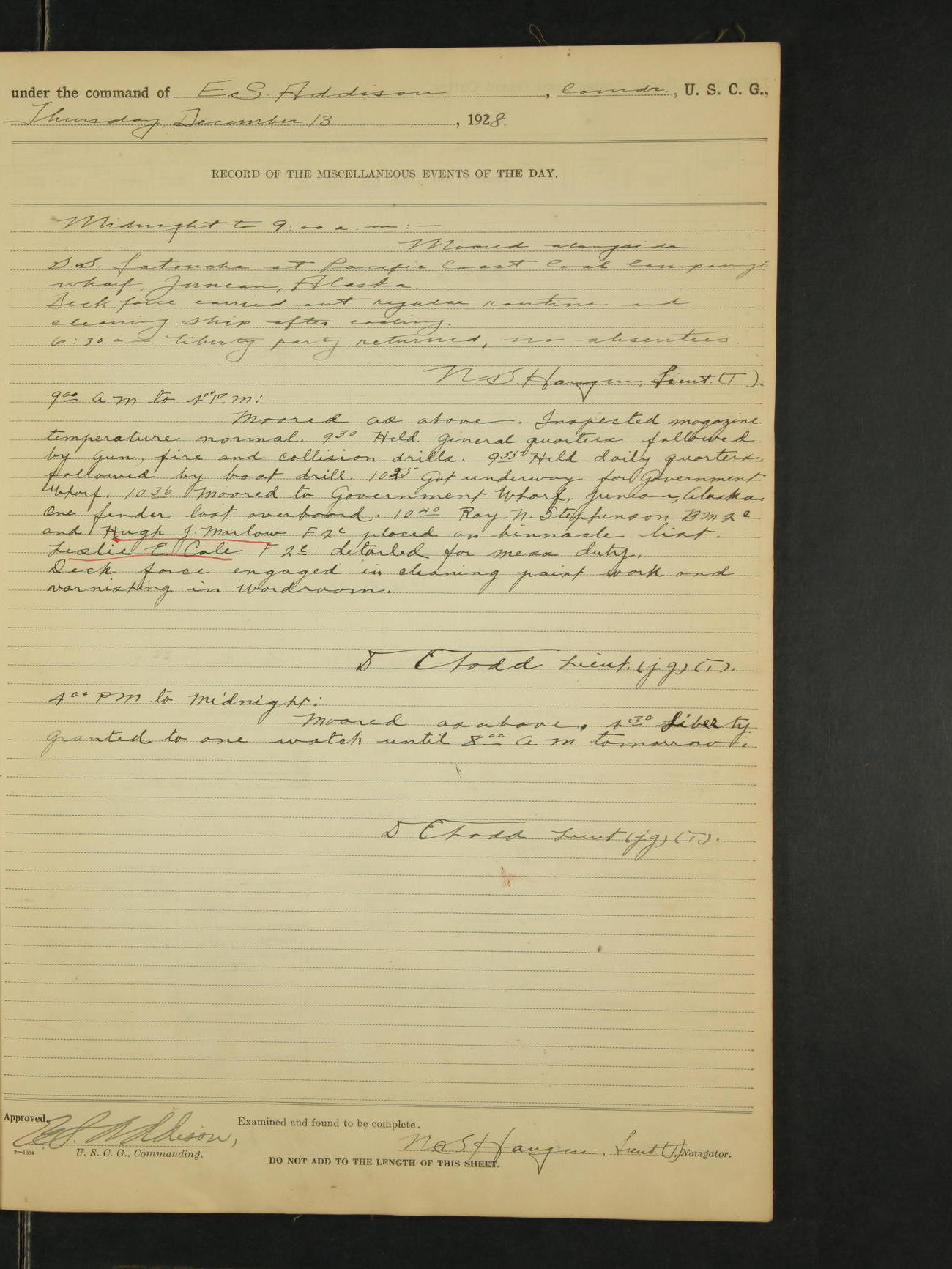9:00am to 4:00pm Moored as above. Inspected magazine, temperature normal. 9:00am Charles E. McGoldrick Sea 2c placed on binnacle list by reason of own misconduct. 9:00am Leslie E. Cole F 2c removed from binnacle list and returned to duty. 9:30am held general quarters collision drill, fire drill, quarters and resuscitation drill. Deck force engaged in sanding down decks and washing paint work. * 4:00pm Bruce E Button RM 1c received out-patient treatment at USPHS Hospital at Cordova, Alaska. *1:00pm Permanent Hull Board convened. C.W. Thompson Ensign
