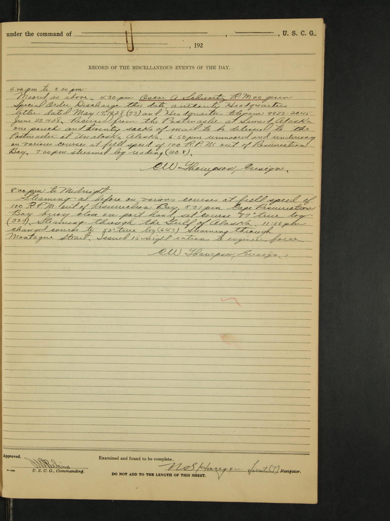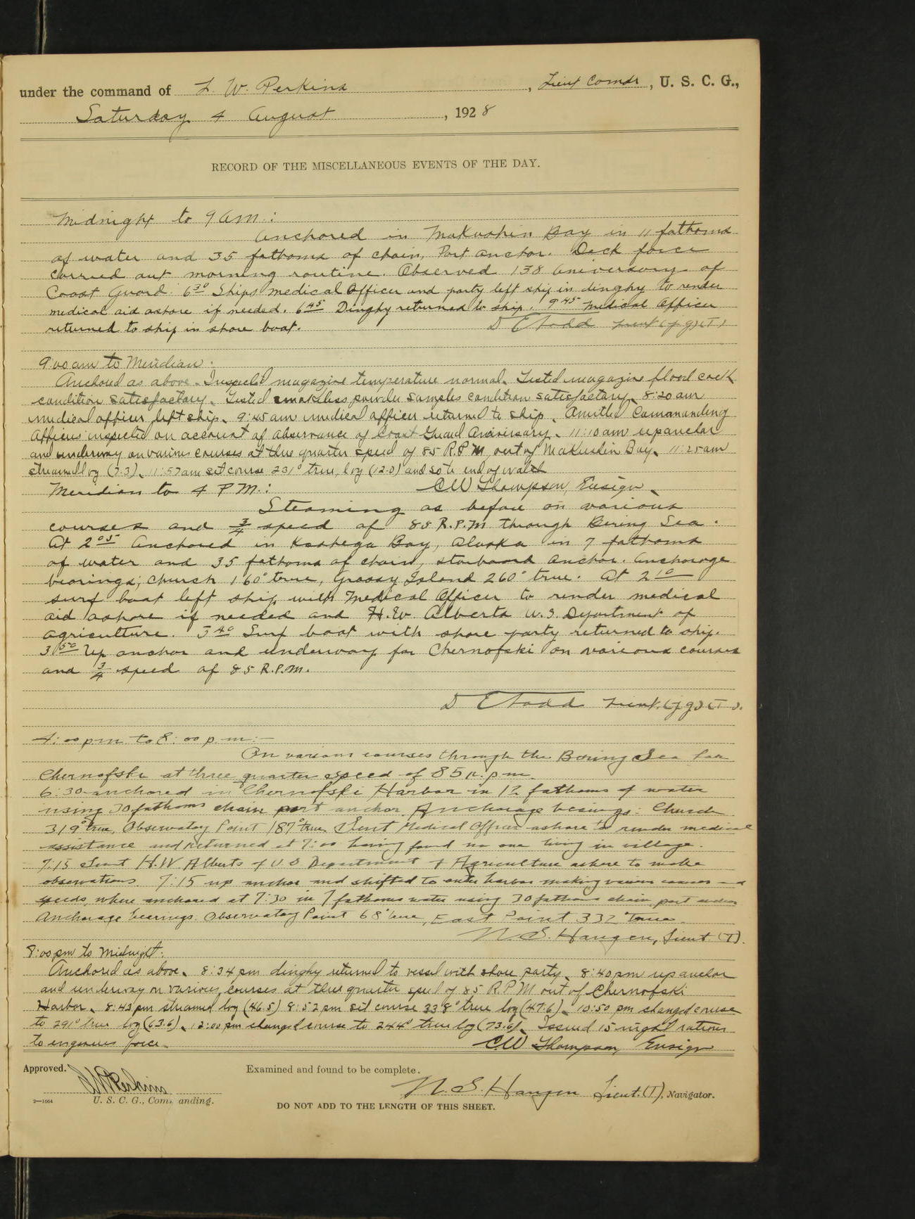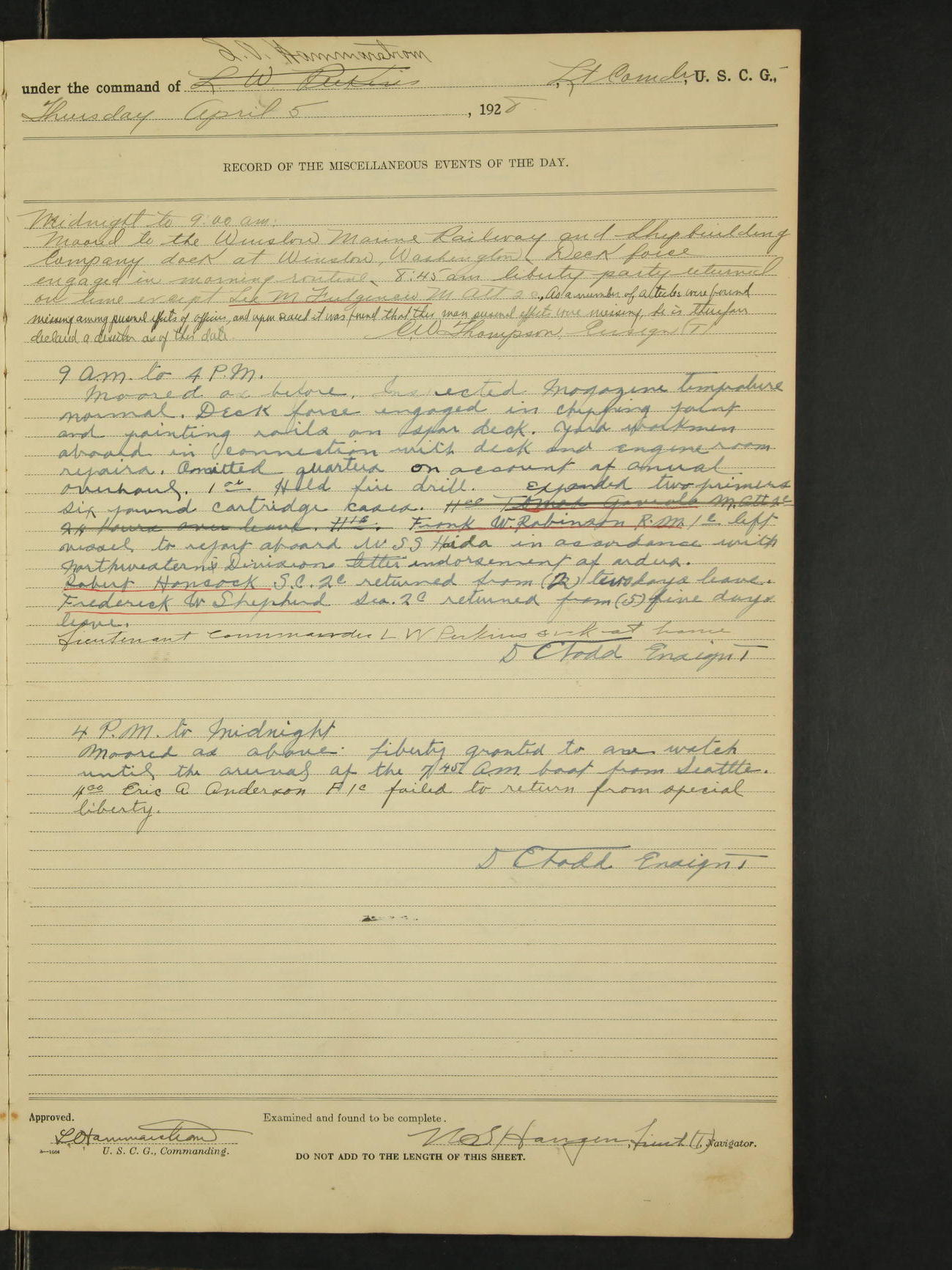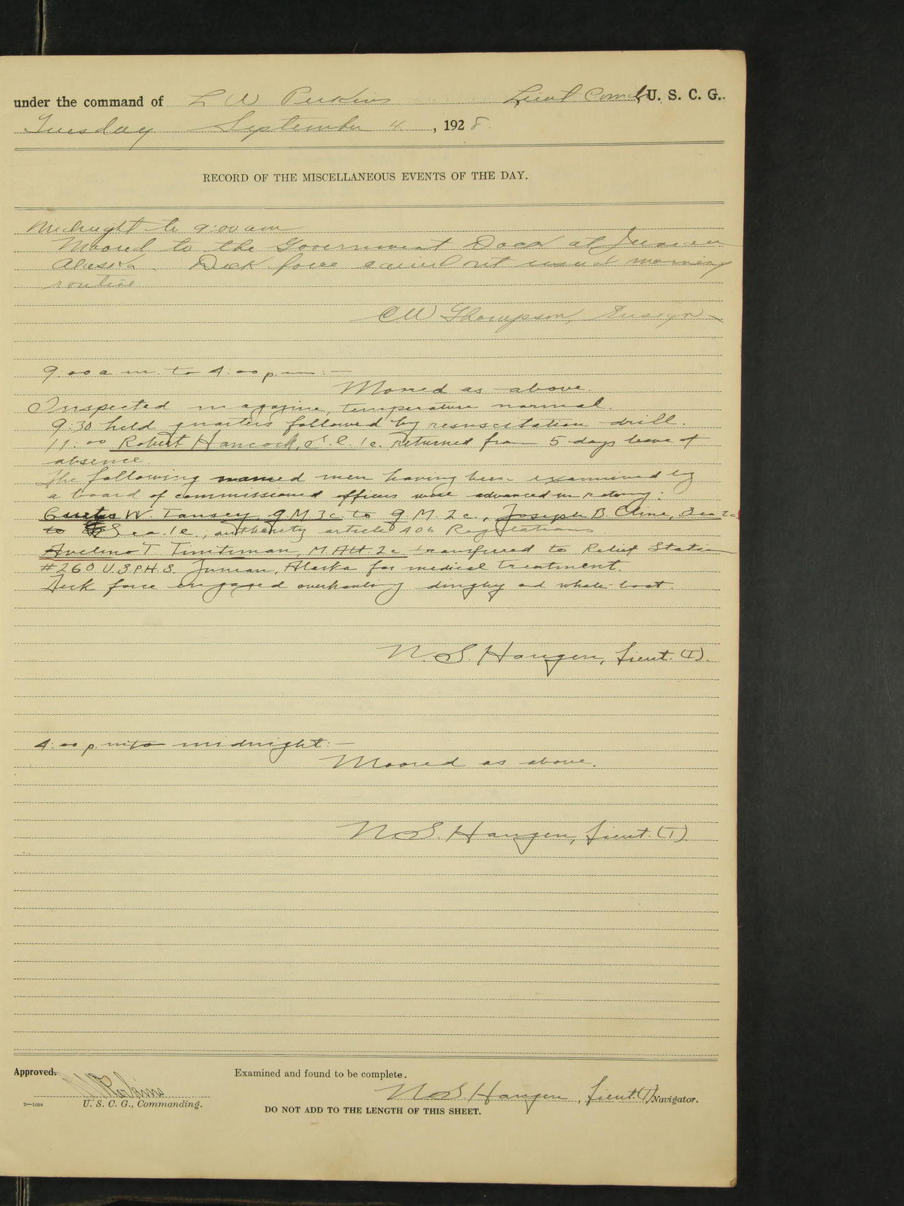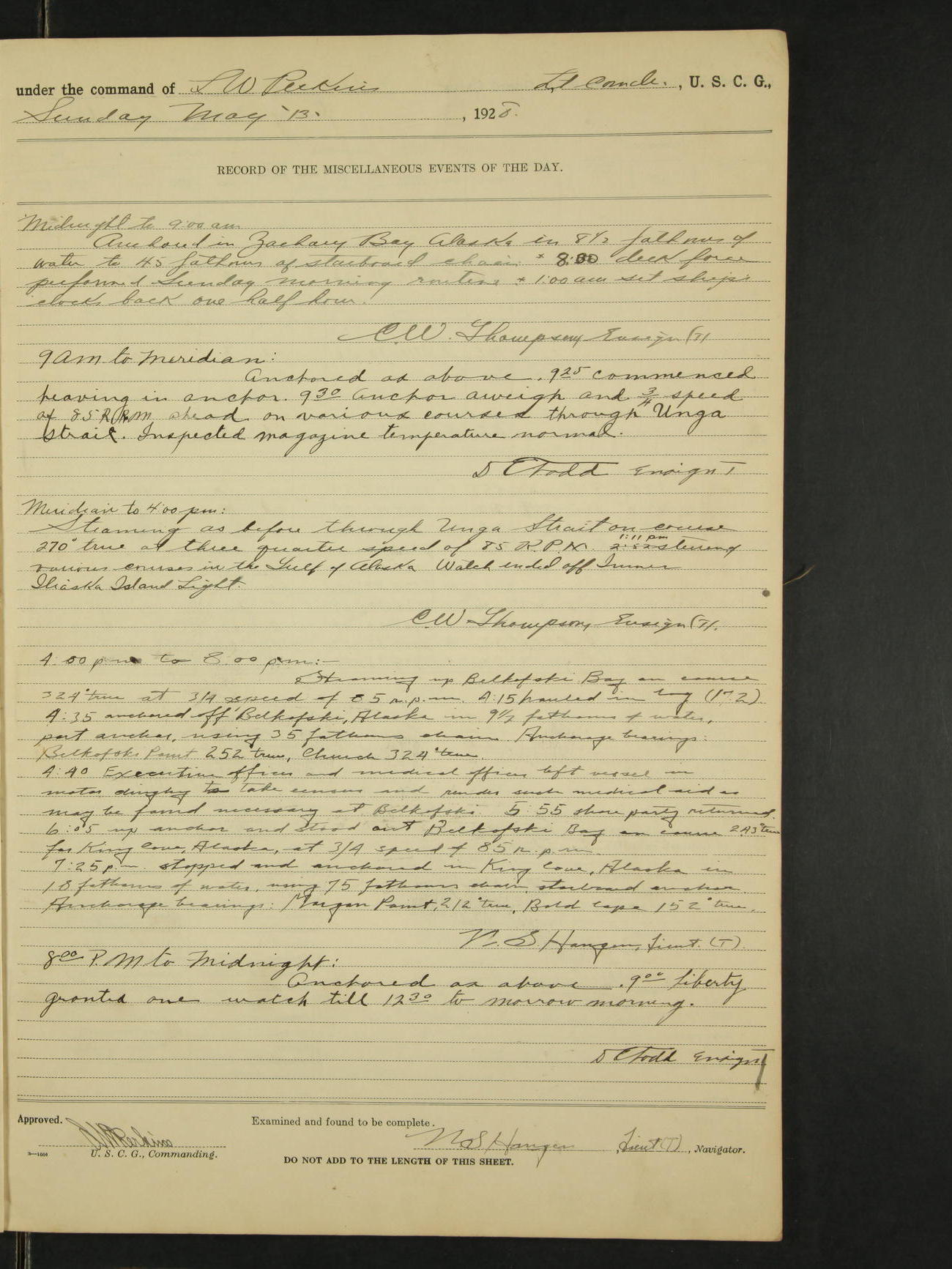 9:00am to 4:00pm Moored as above. Inspected magazine, temperature normal. 9:00am Charles E. McGoldrick Sea 2c placed on binnacle list by reason of own misconduct. 9:00am Leslie E. Cole F 2c removed from binnacle list and returned to duty. 9:30am held general quarters collision drill, fire drill, quarters and resuscitation drill. Deck force engaged in sanding down decks and washing paint work. * 4:00pm Bruce E Button RM 1c received out-patient treatment at USPHS Hospital at Cordova, Alaska. *1:00pm Permanent Hull Board convened. C.W. Thompson Ensign