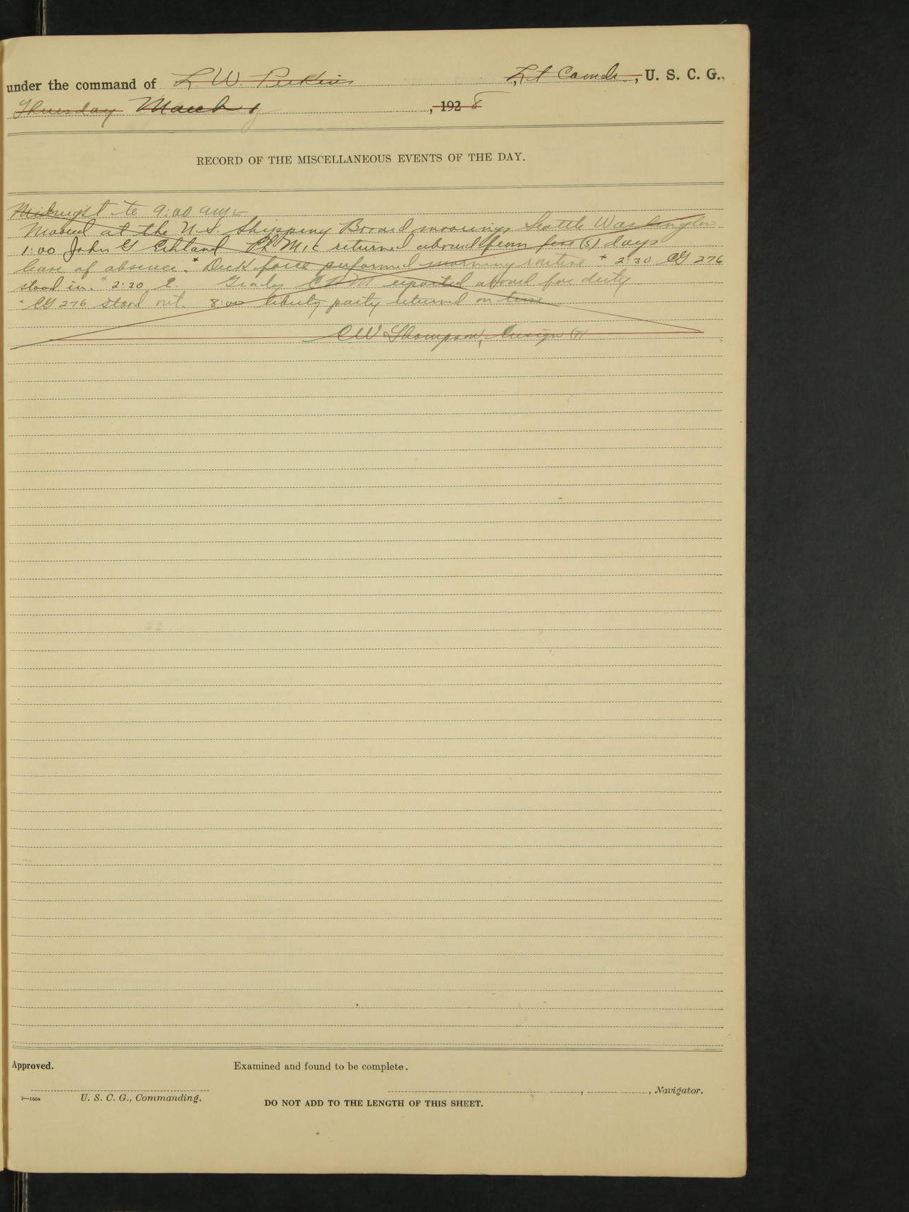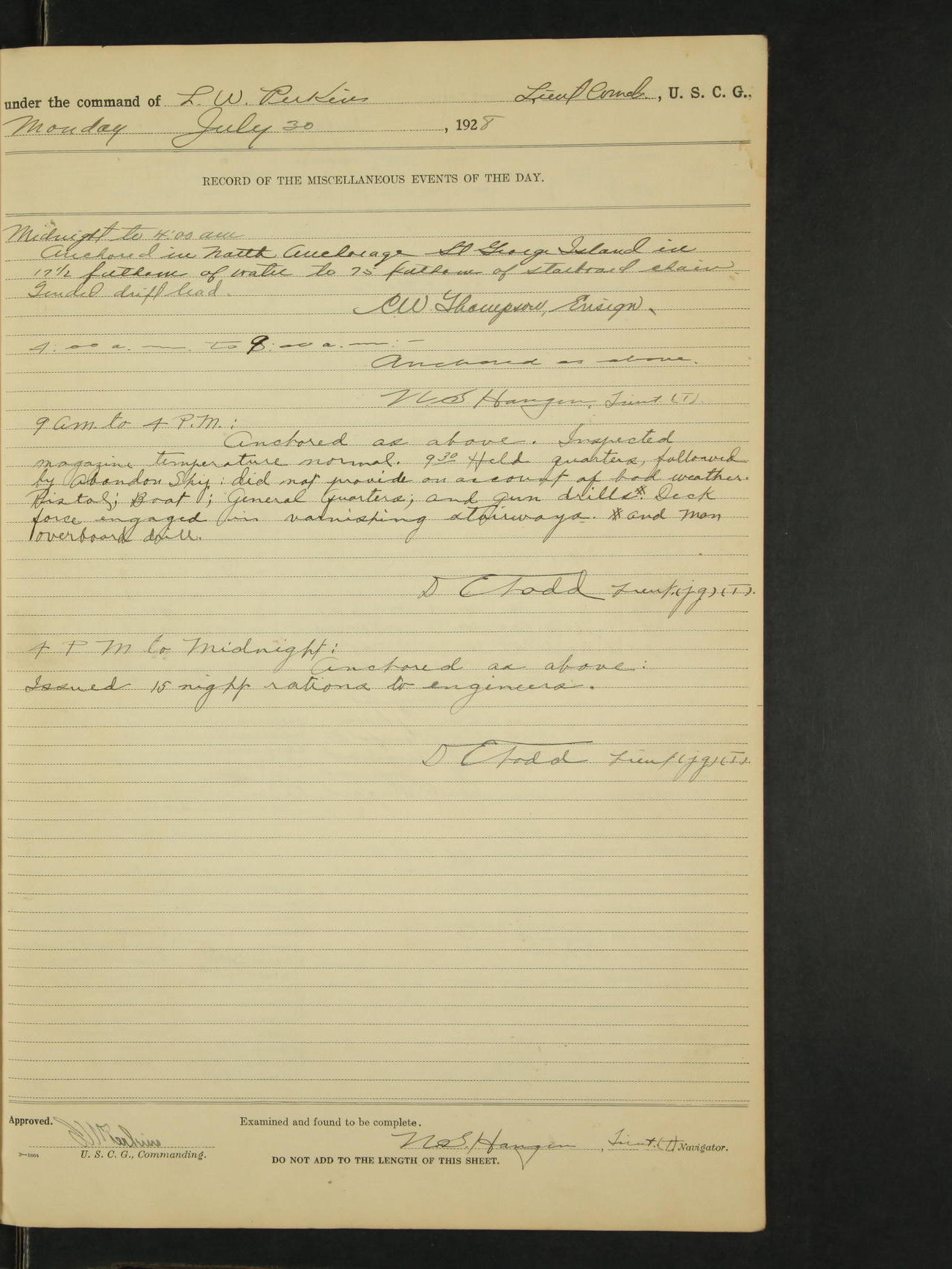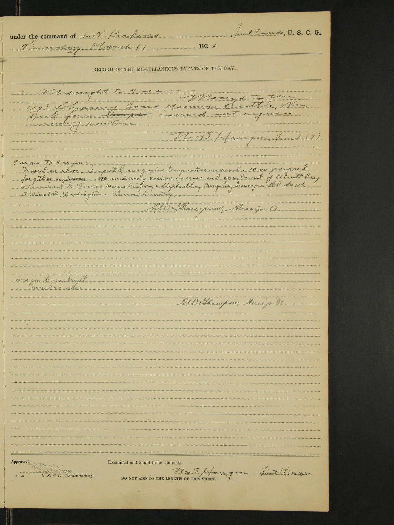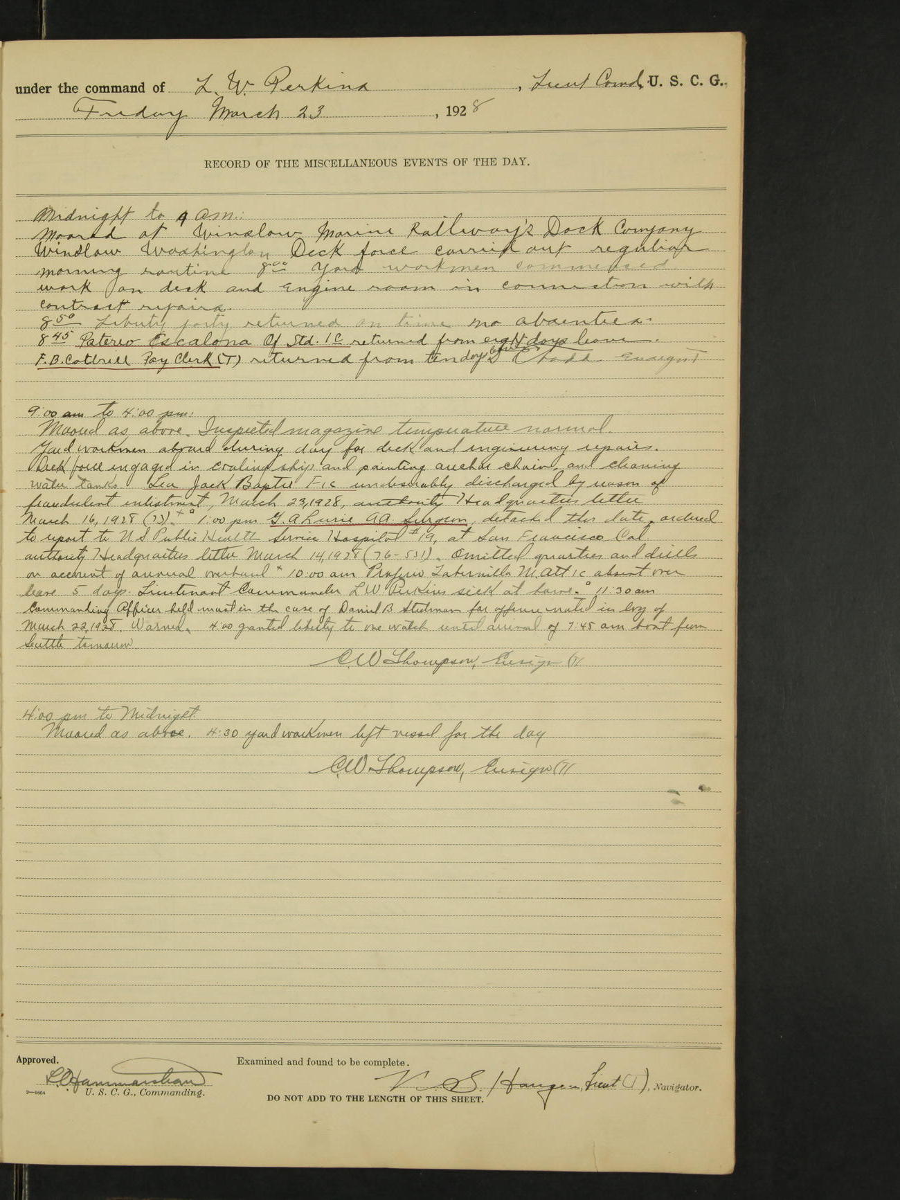 9:00am to 4:00pm Moored as above. Inspected magazine, temperature normal. 9:00am Charles E. McGoldrick Sea 2c placed on binnacle list by reason of own misconduct. 9:00am Leslie E. Cole F 2c removed from binnacle list and returned to duty. 9:30am held general quarters collision drill, fire drill, quarters and resuscitation drill. Deck force engaged in sanding down decks and washing paint work. * 4:00pm Bruce E Button RM 1c received out-patient treatment at USPHS Hospital at Cordova, Alaska. *1:00pm Permanent Hull Board convened. C.W. Thompson Ensign