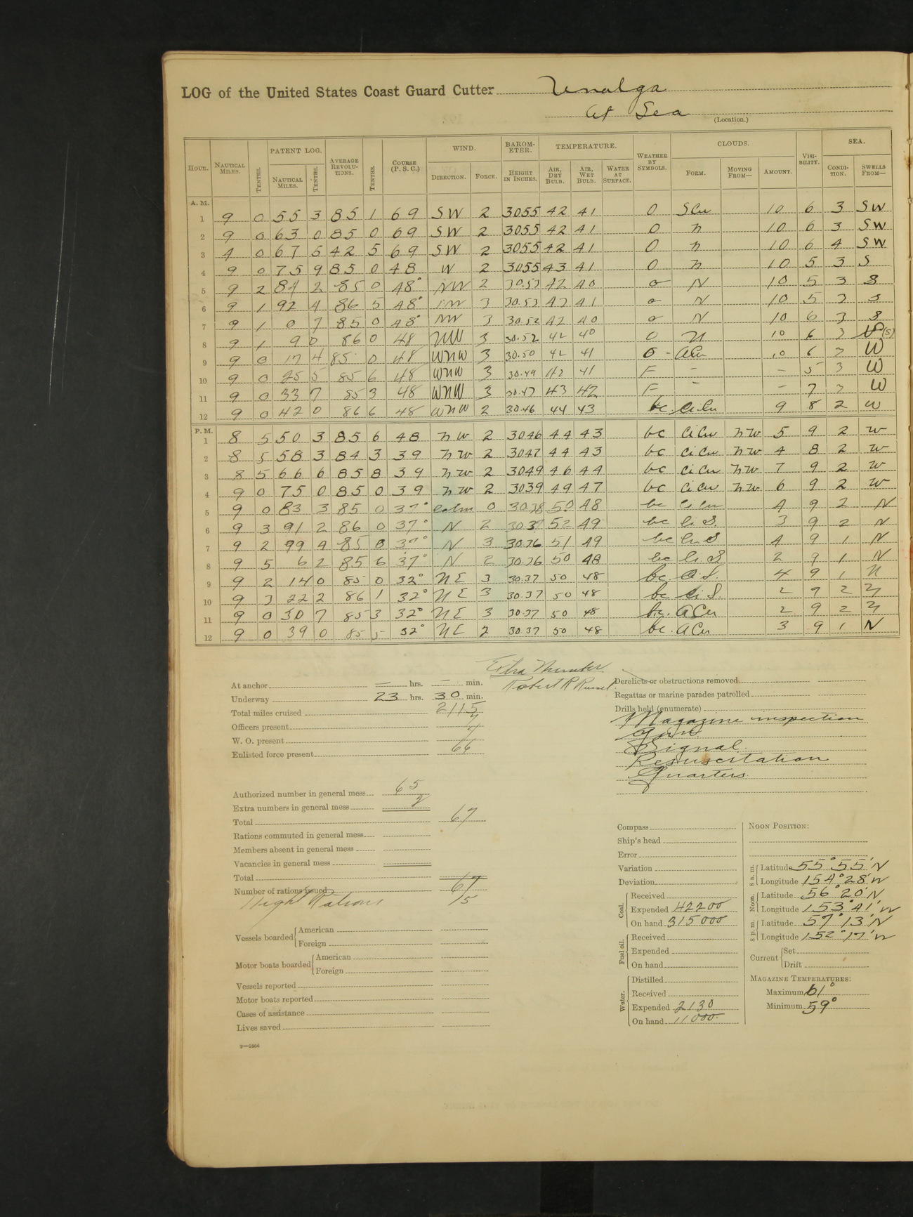 8:00pm to midnight: Steaming as before on course 313° true thru the Gulf of Alaska at slow speed of 50 rpm towing SS Starr. At 11:07 increased to half speed of 70 rpm. 11:17 changed course to 330° true (57.0). 11:59 changed course to 298° true. Issued 15 night rations to engineers force. N.S. Haugen, Lieut. (T).