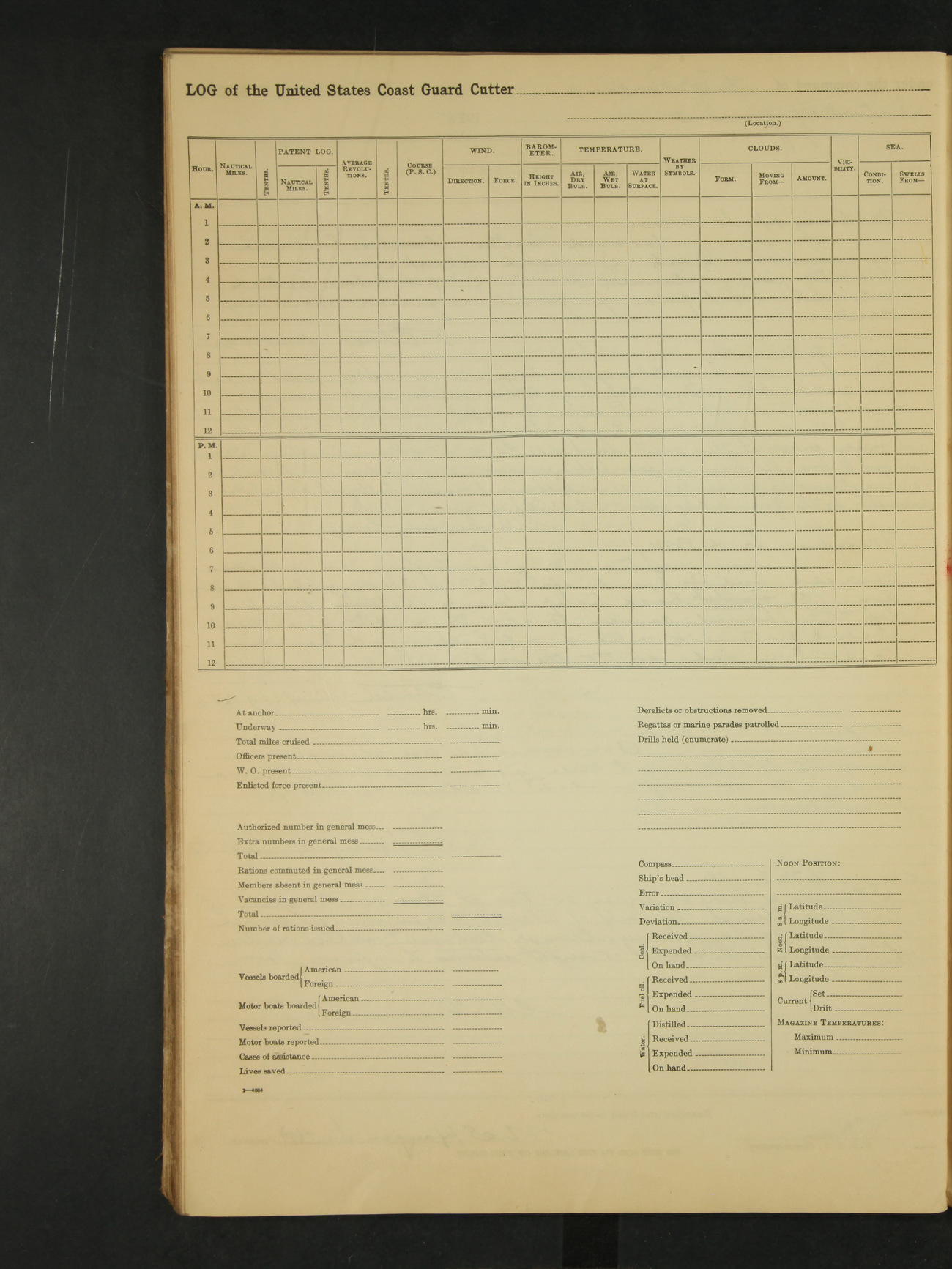 9:00am to 4:00pm. Moored as above. Inspected magazine, temperature normal. 9:30 held fire drill. 9:34 held collision drill. 2:00 Commanding officer Lieut Commander R.C. Weightman, left the ship 10 days leave of absence granted by Northern Division's telegram January 4, 1926 (9904-1000). Deck force employed chipping and painting about the main deck. Received from Headquarters 4 copies of the annual report of the Coast Guard, 1926. William Bowman, Ensign (T)