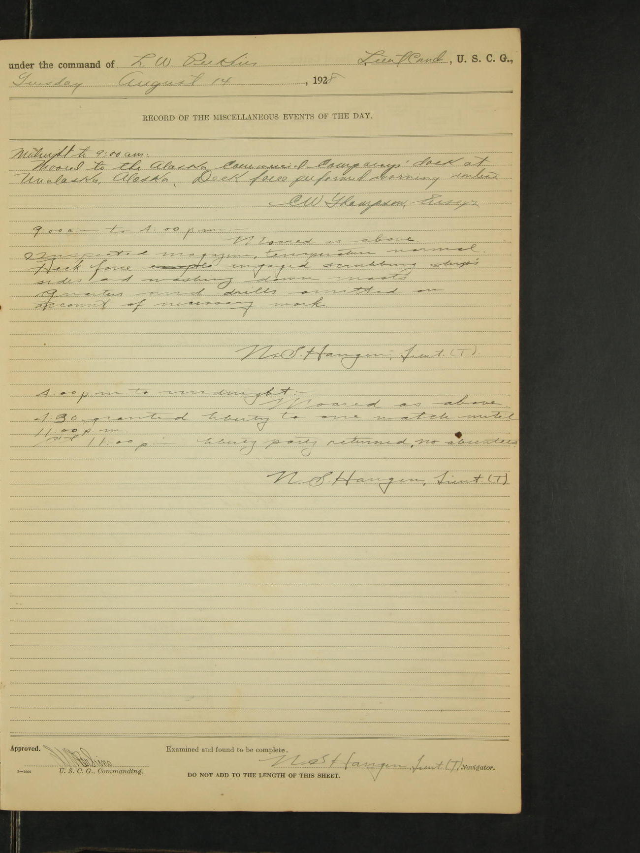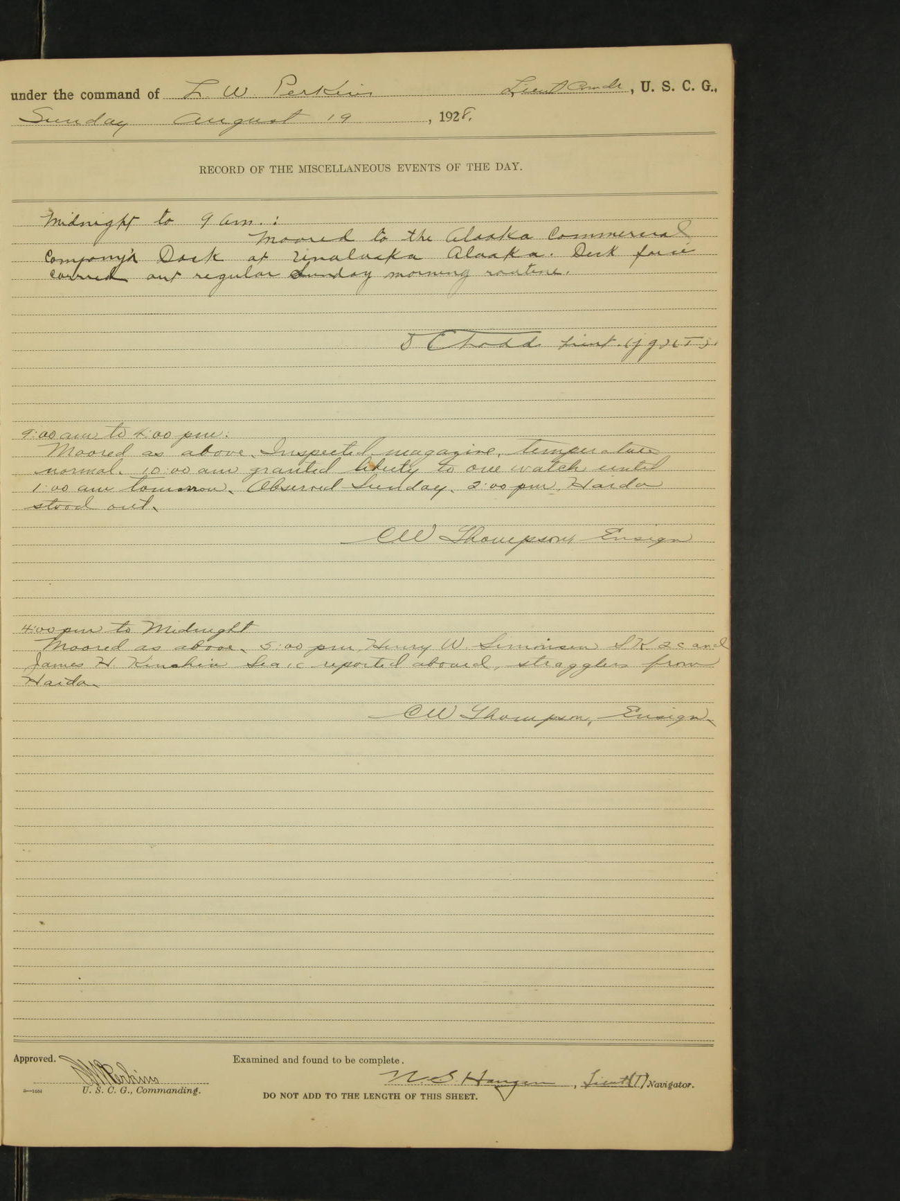 Midnight to 9:00am:- Moored to the Alaska Steamship Company's Dock at Juneau Alaska. Carried out the morning routine. 8:00 Liberty party returned. W.H. Jacobson, Ensign (T)