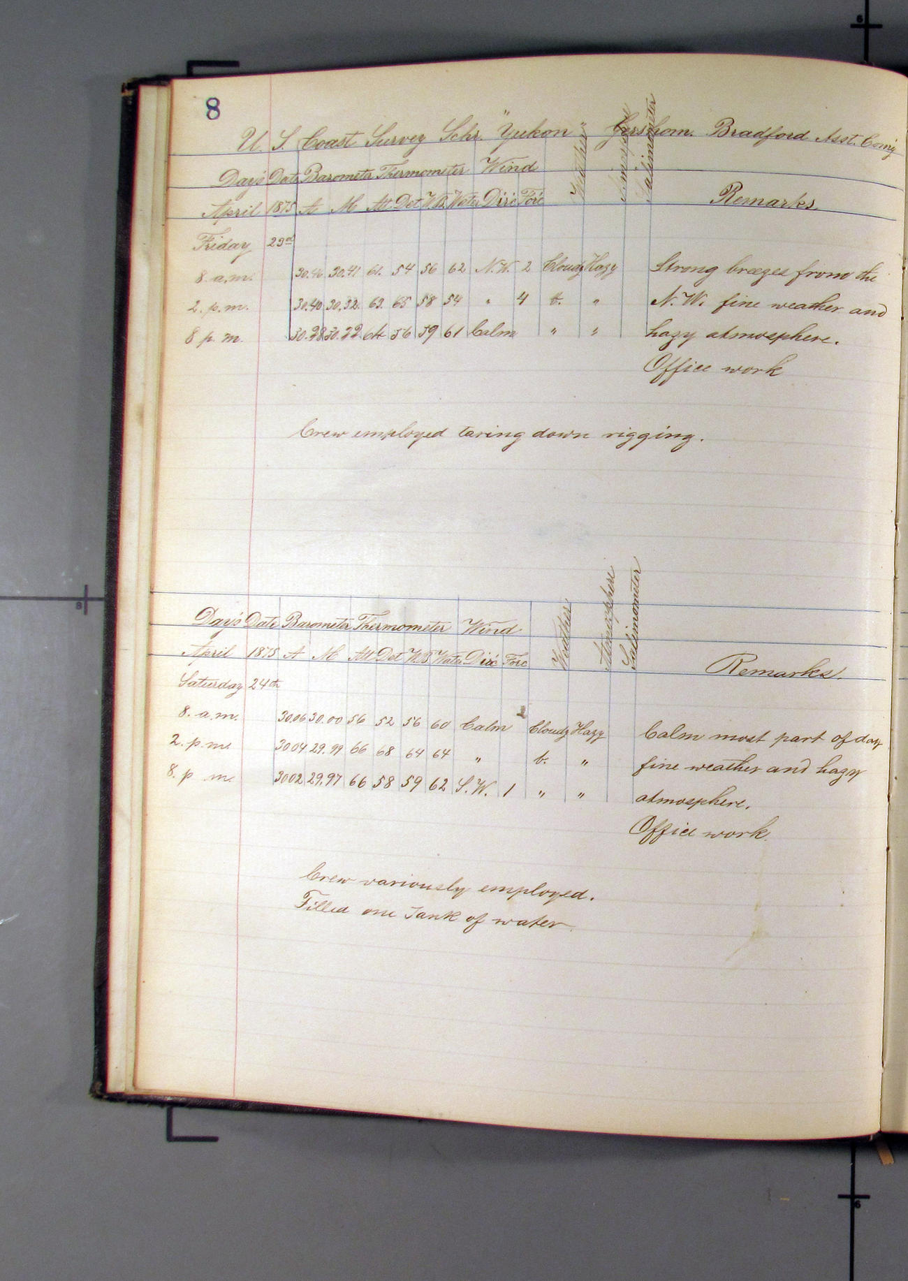 At 6.00am set gaff topsails. At 8.00am set main topmast staysail.