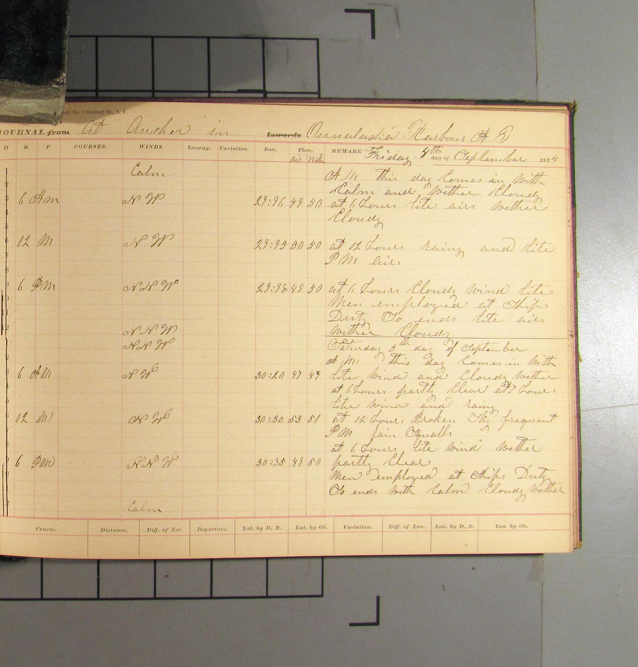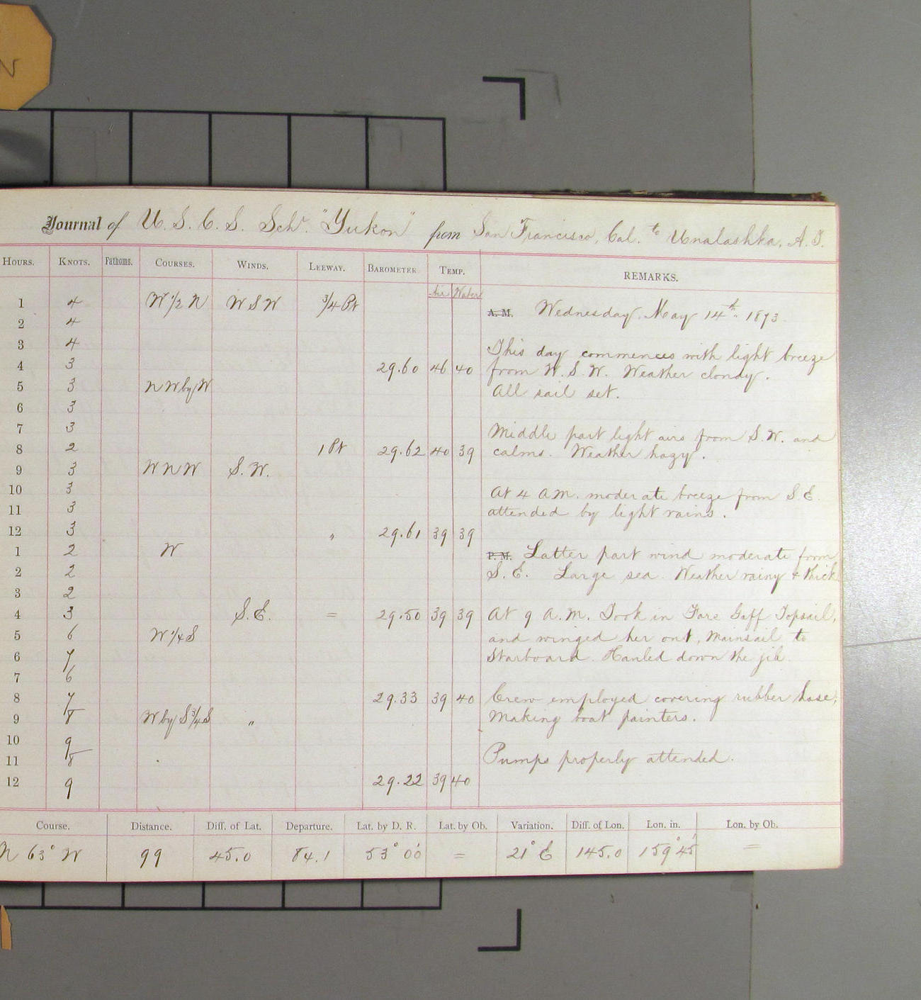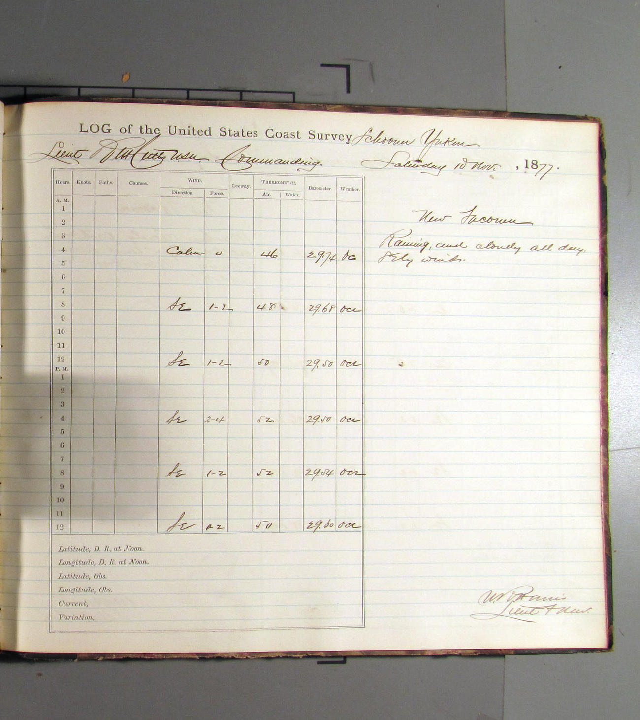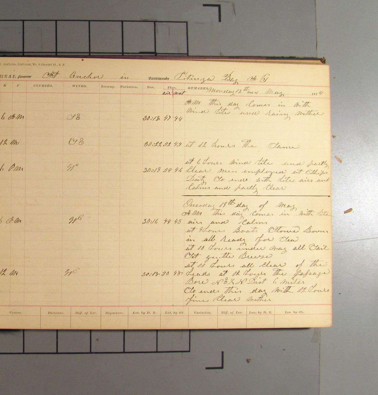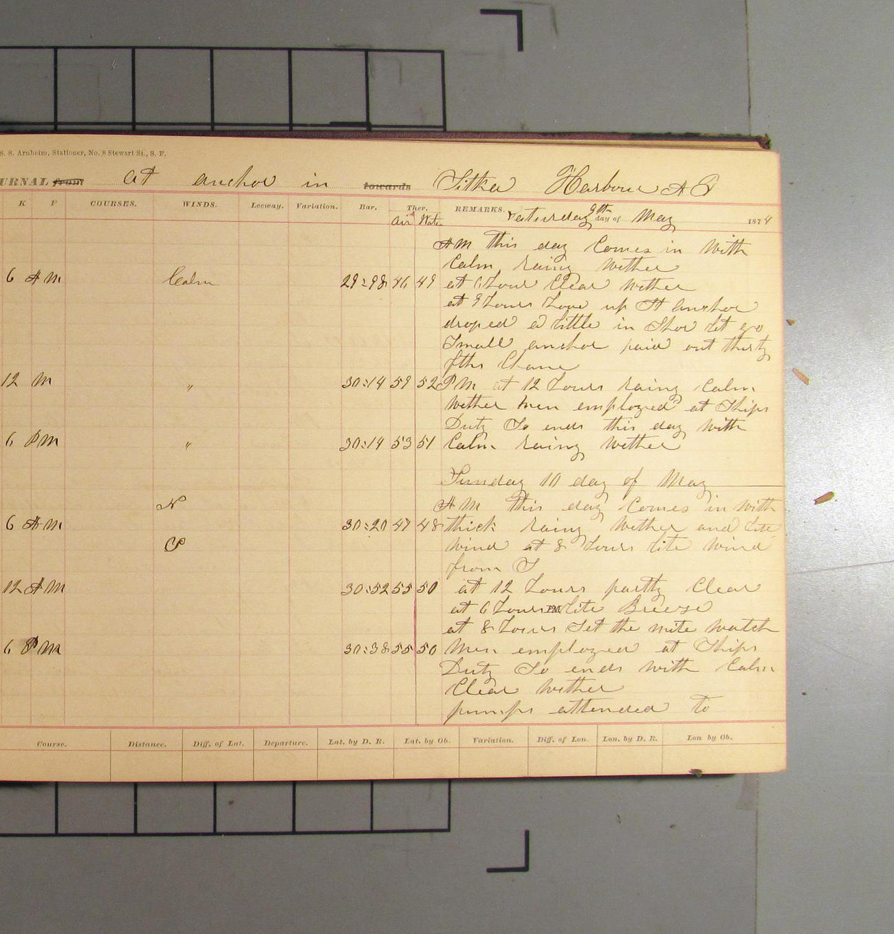 This day commences with light variable airs attended by light rain. Latter part wind fresh NW. Weather clear.
