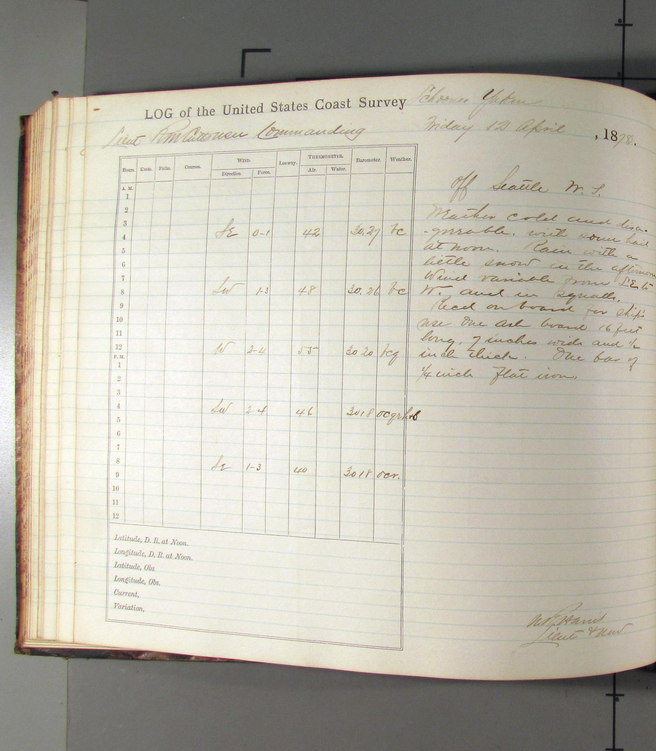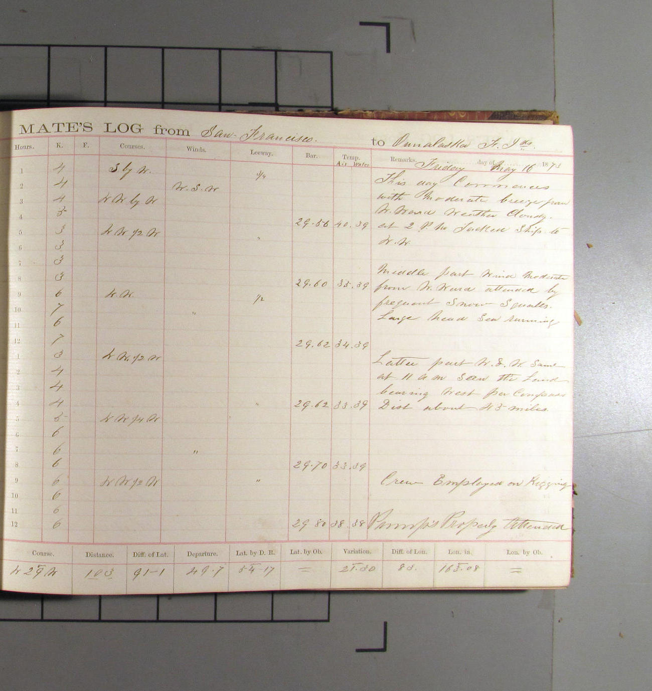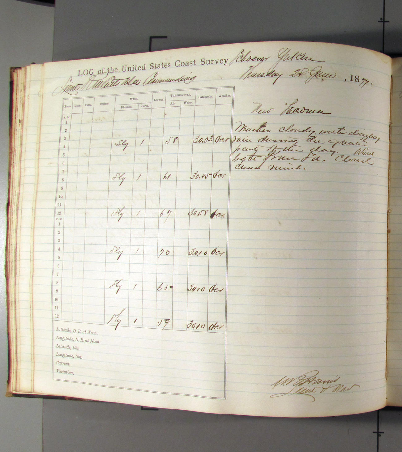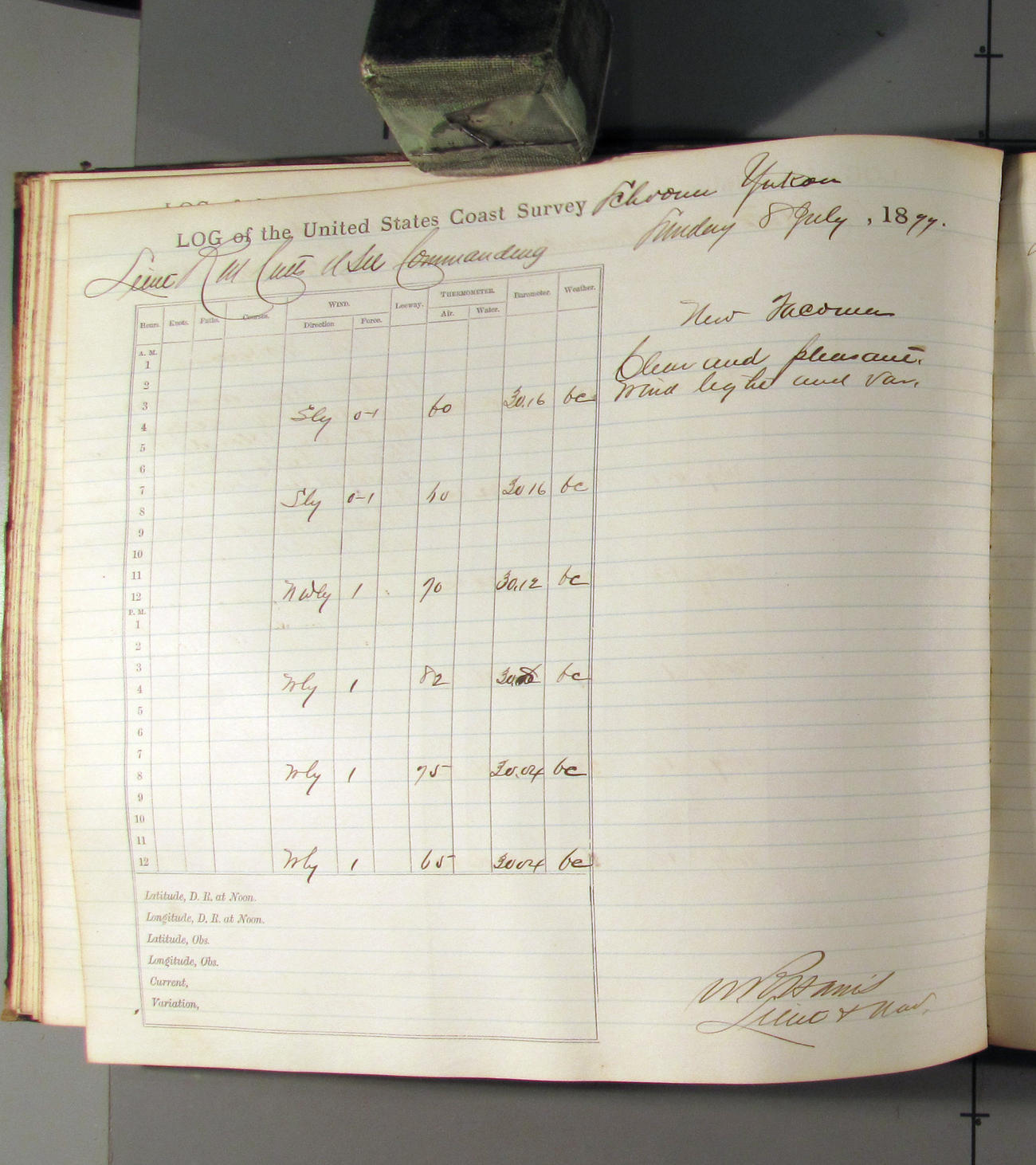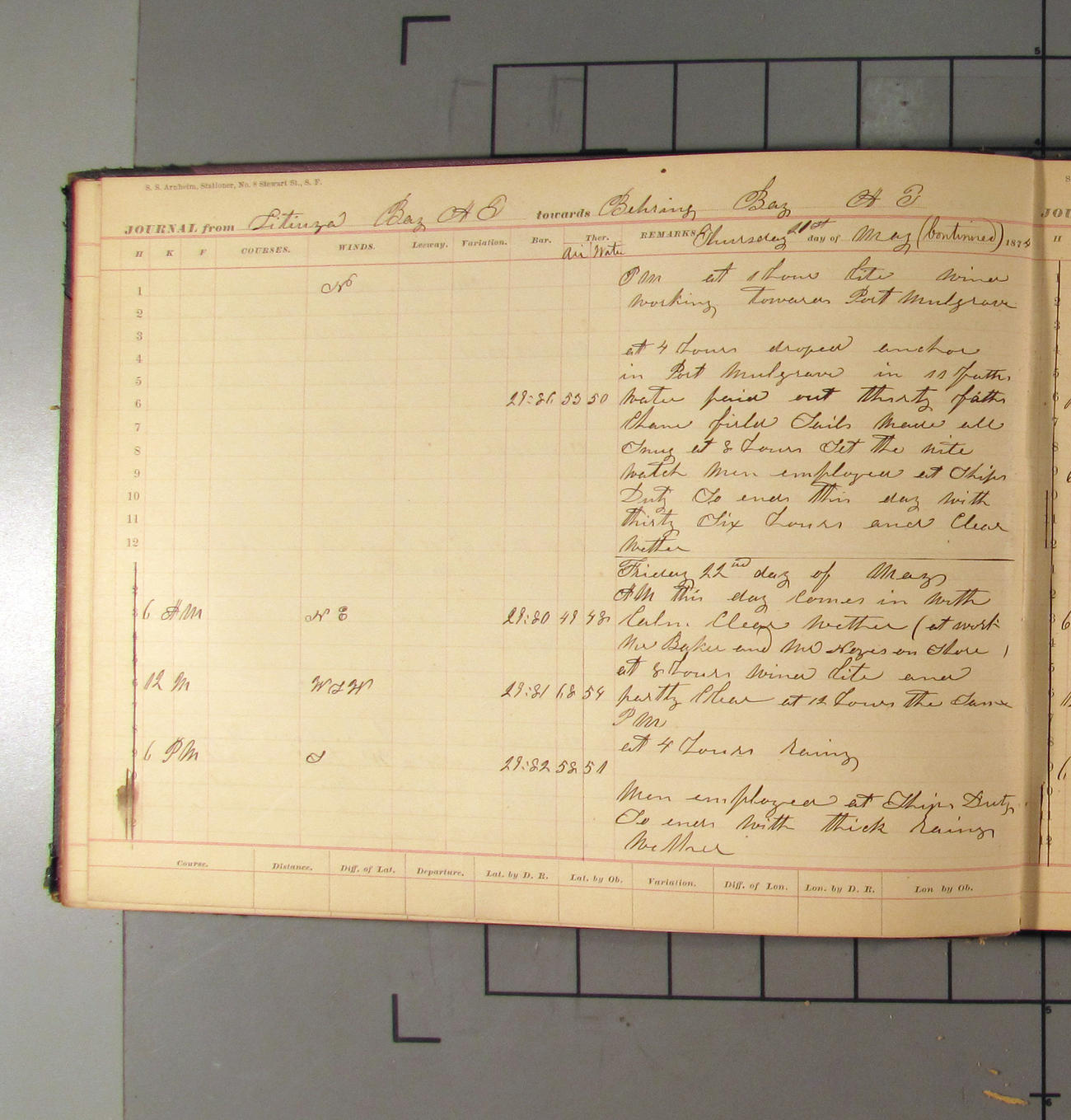 This day commences with light variable airs attended by light rain. Latter part wind fresh NW. Weather clear.