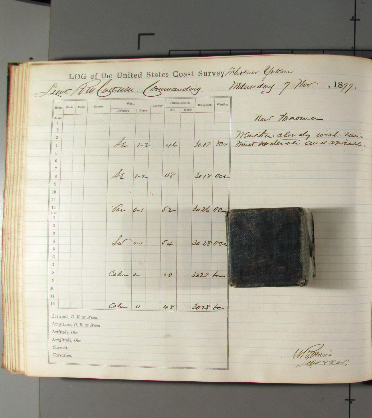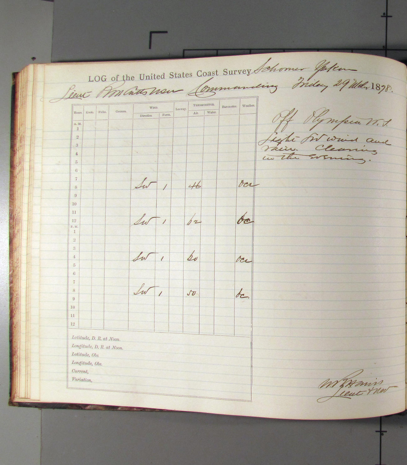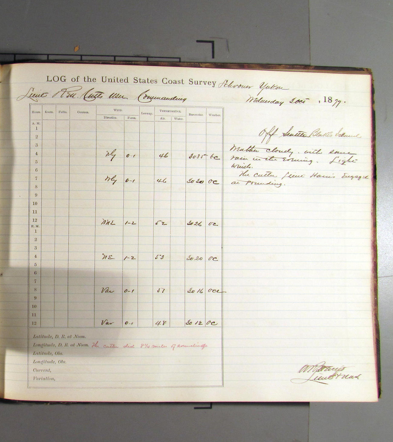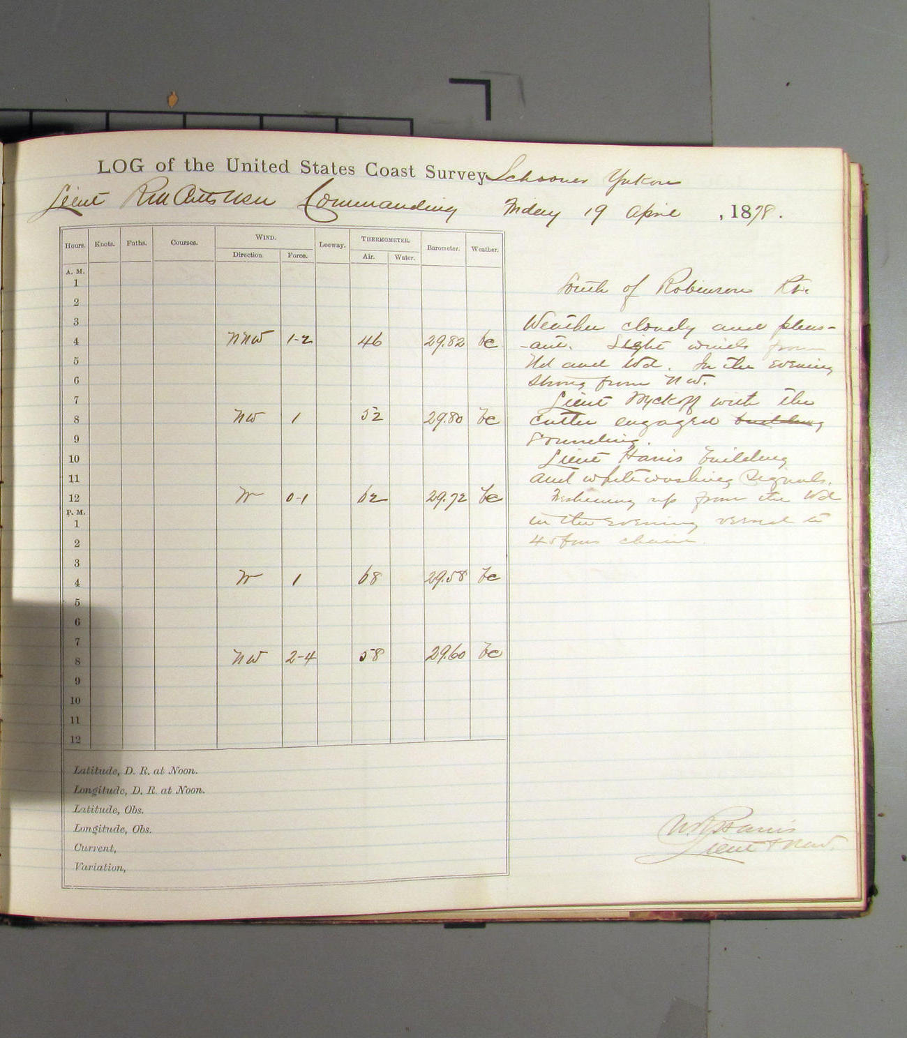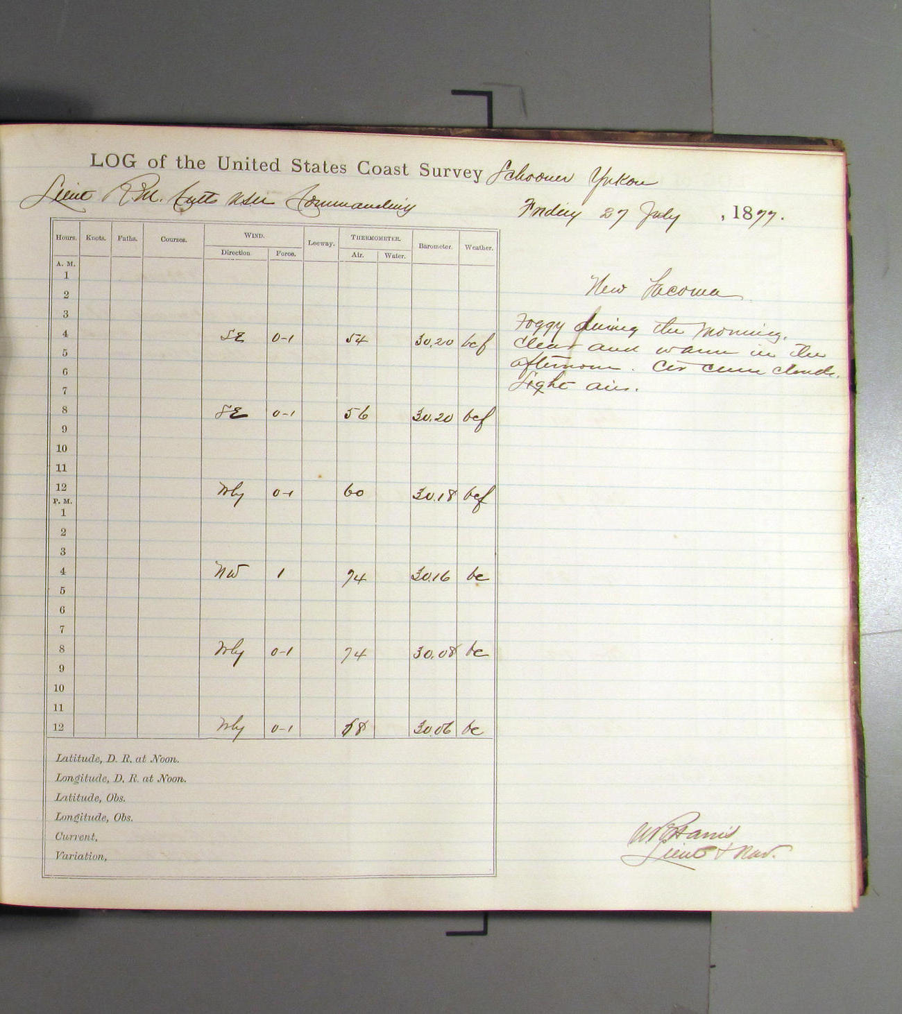 This day commences with light variable airs attended by light rain. Latter part wind fresh NW. Weather clear.