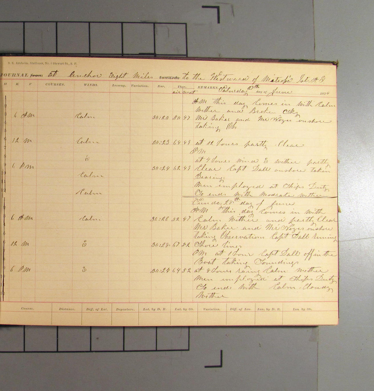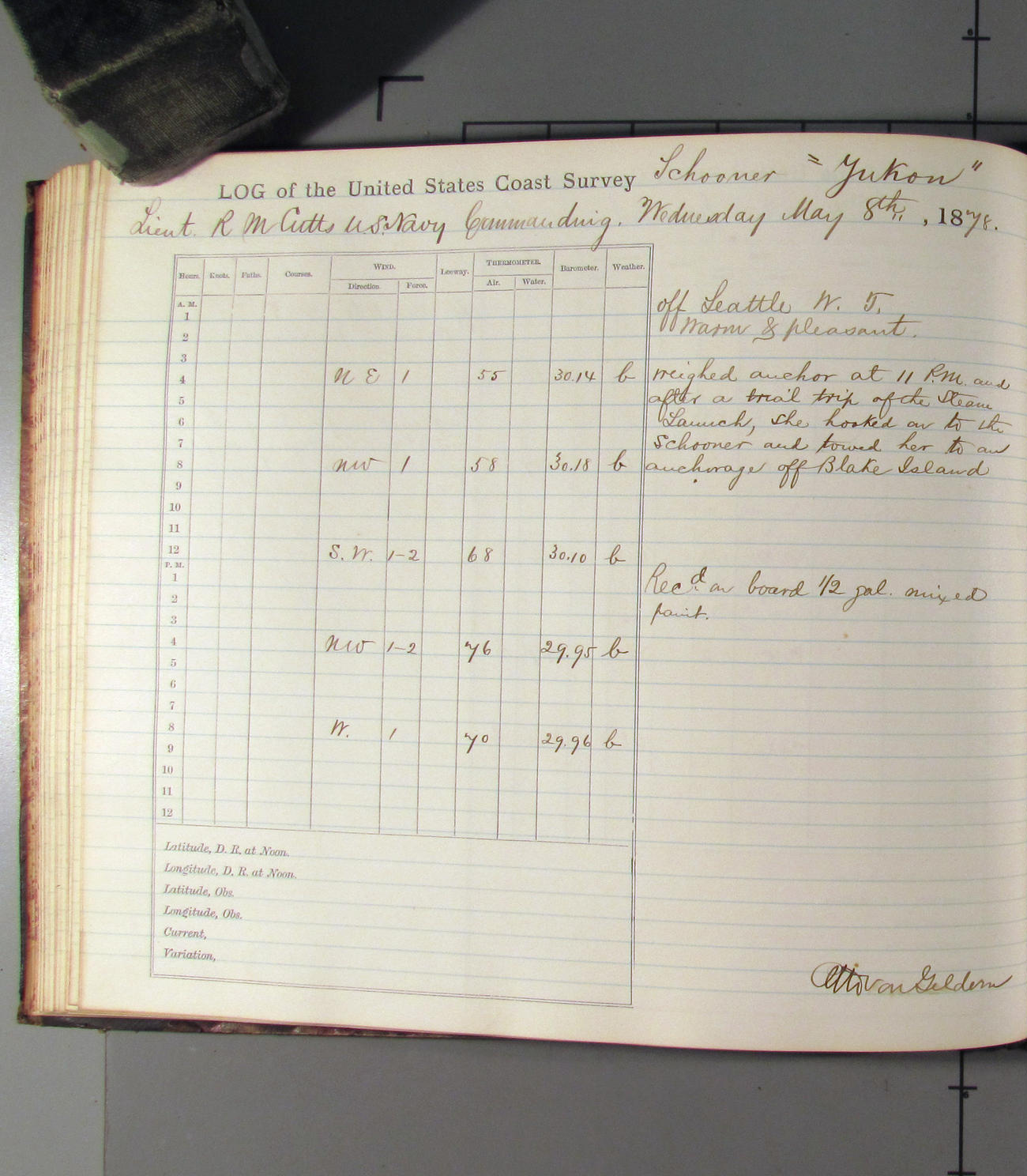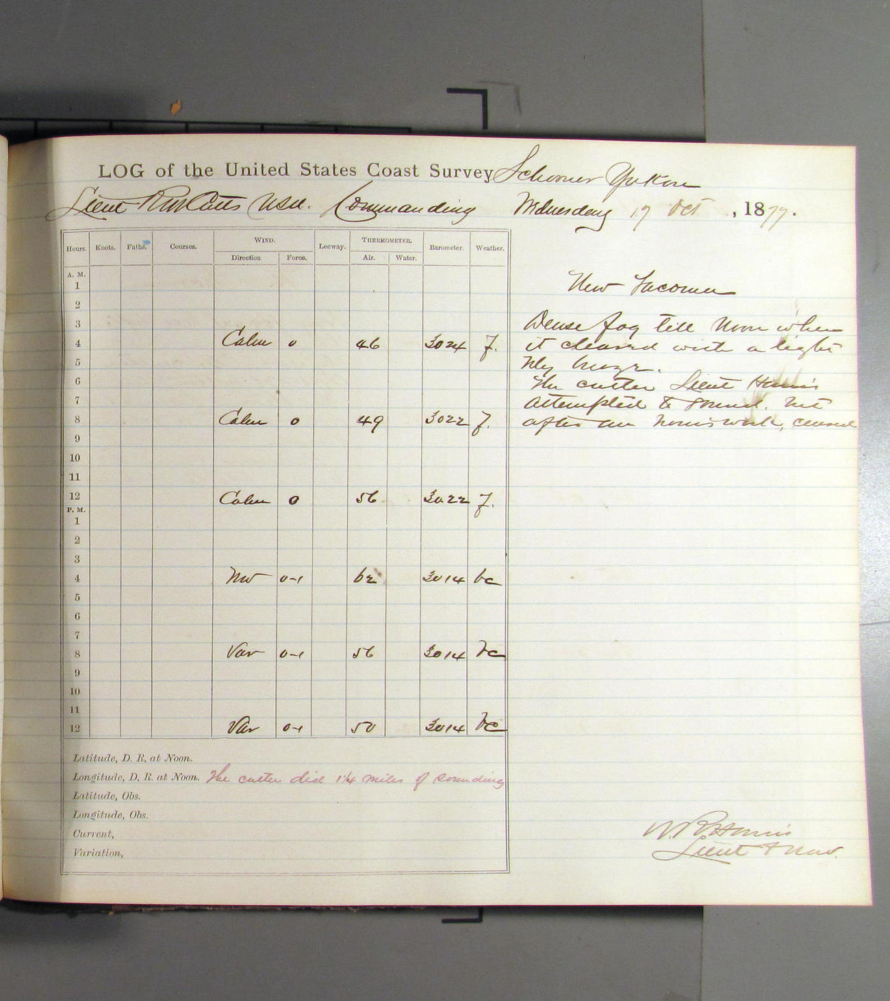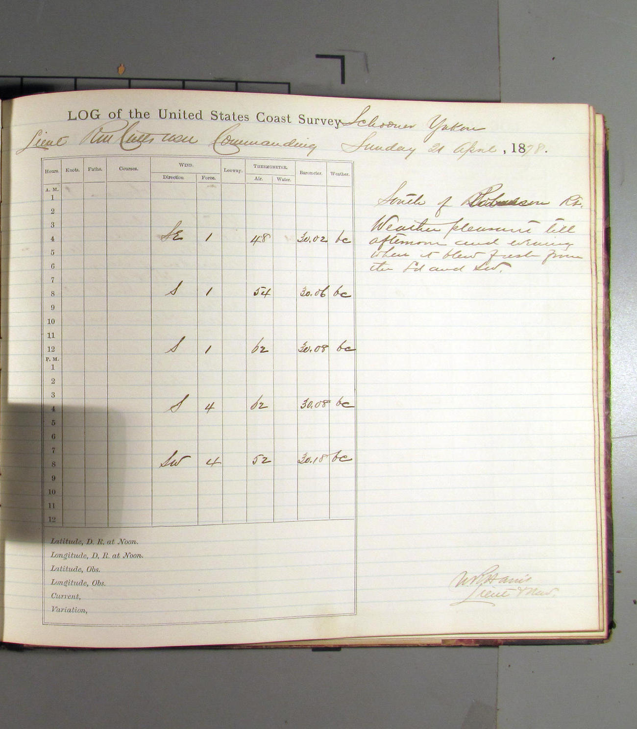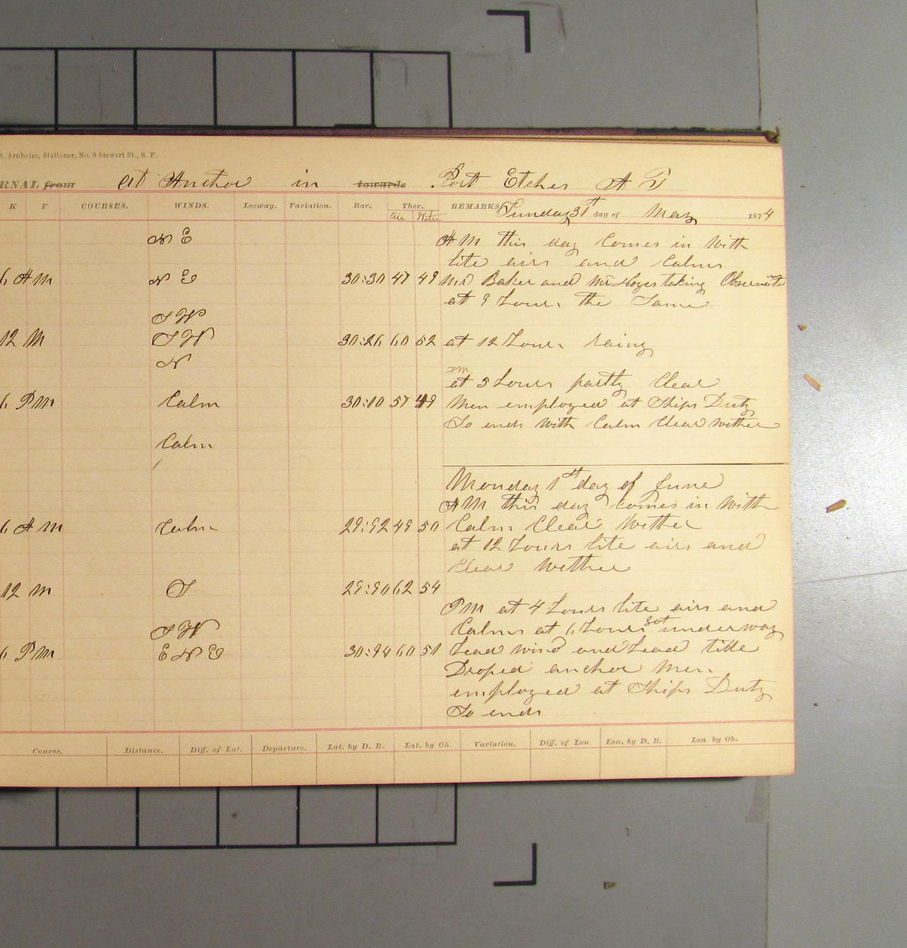 This day commences with light variable airs attended by light rain. Latter part wind fresh NW. Weather clear.