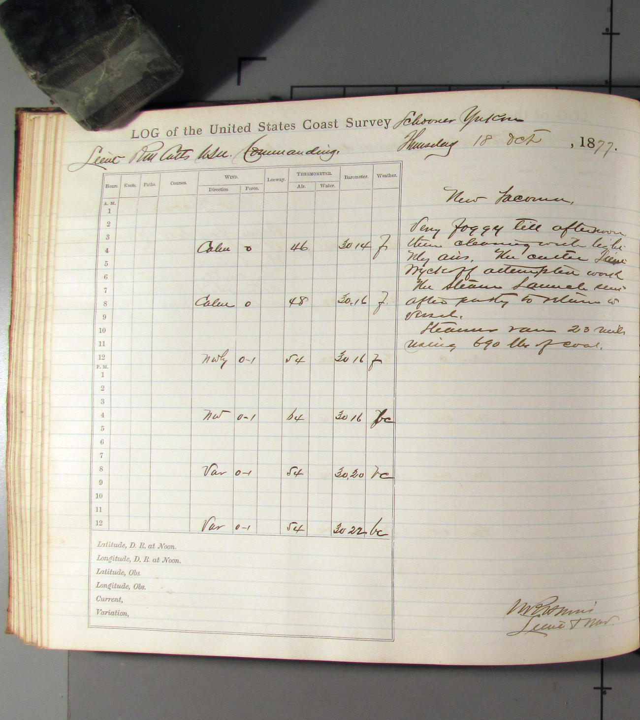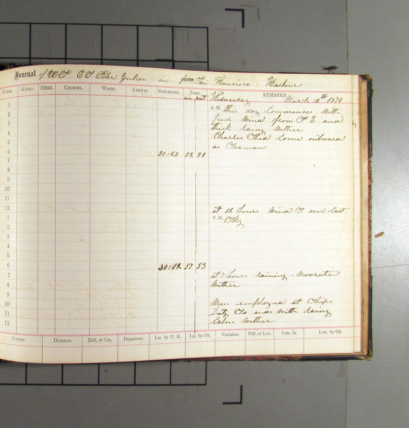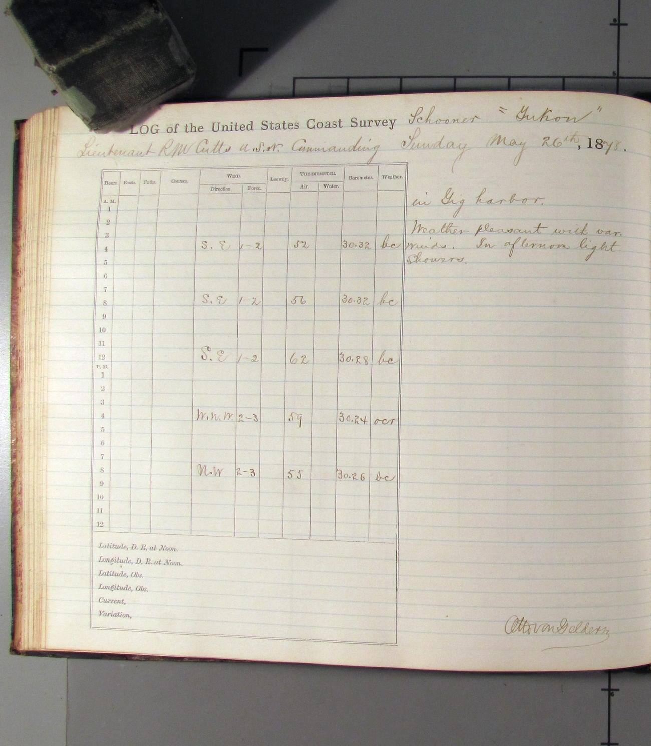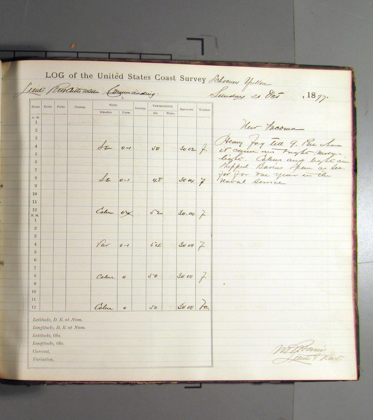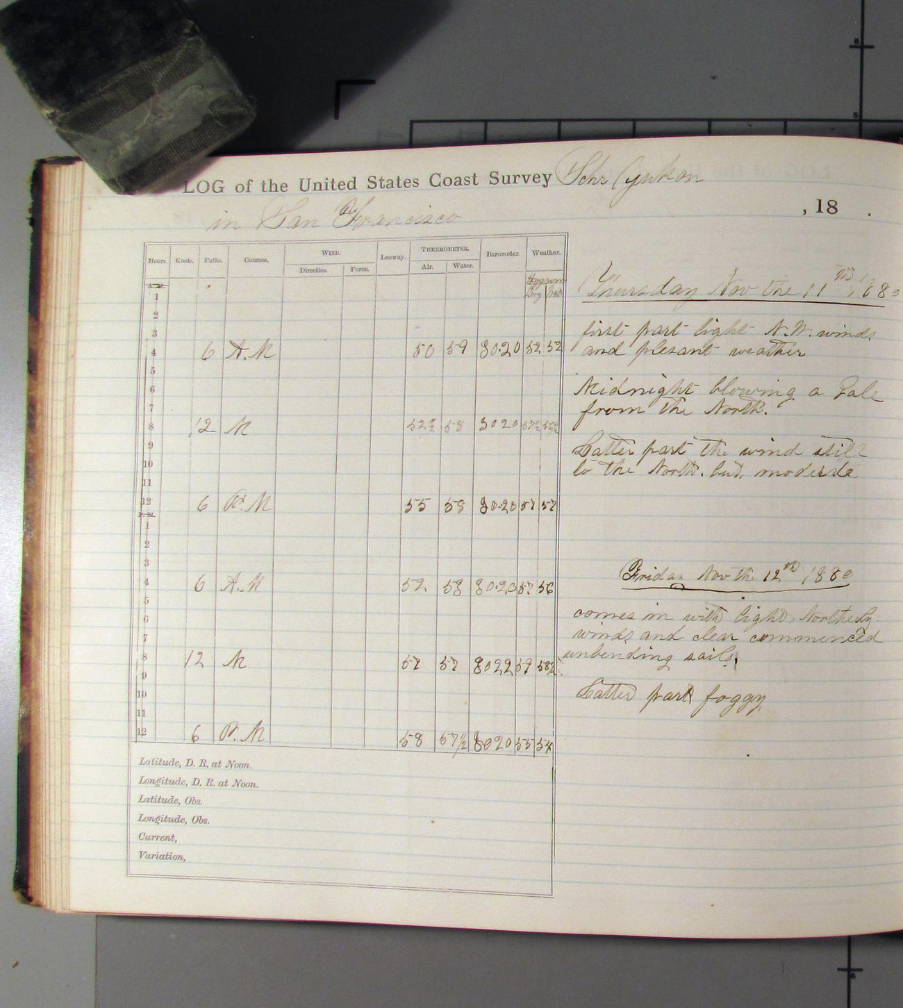 This day commences with light variable airs attended by light rain. Latter part wind fresh NW. Weather clear.