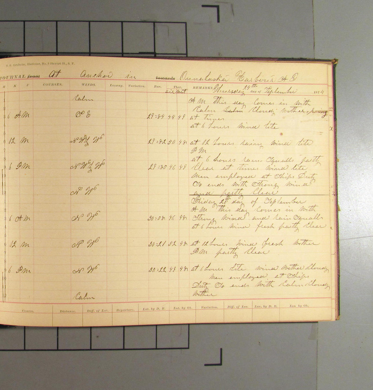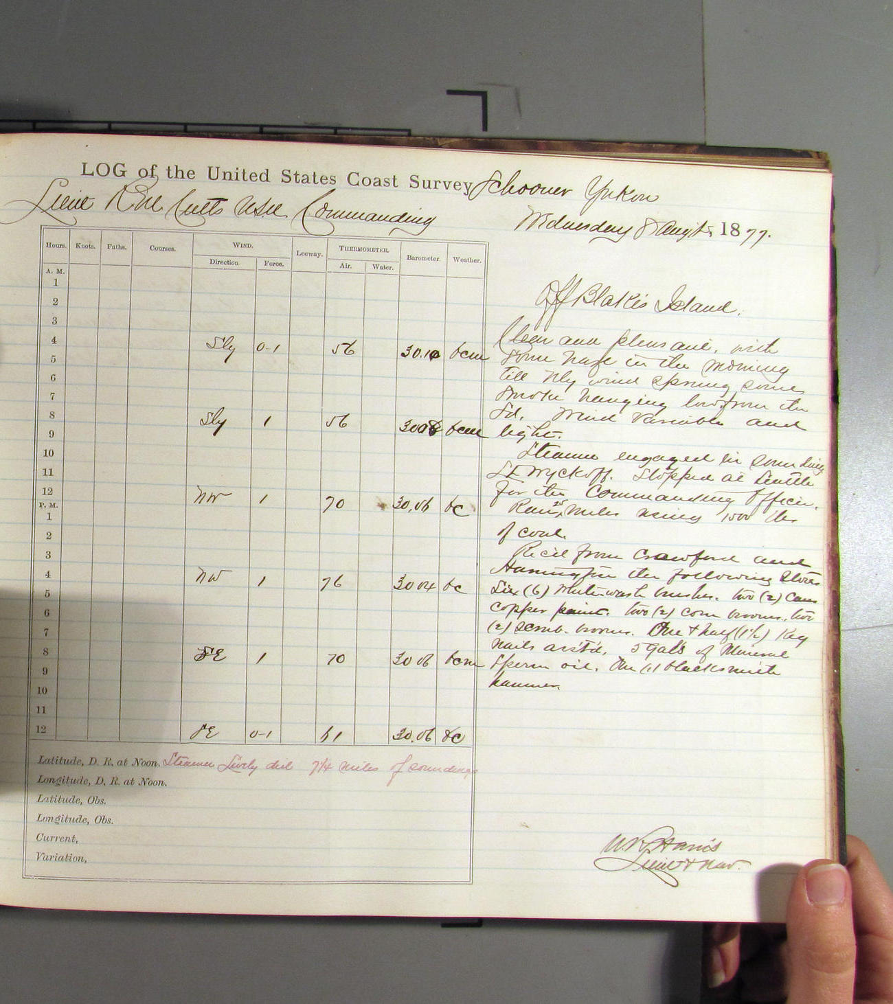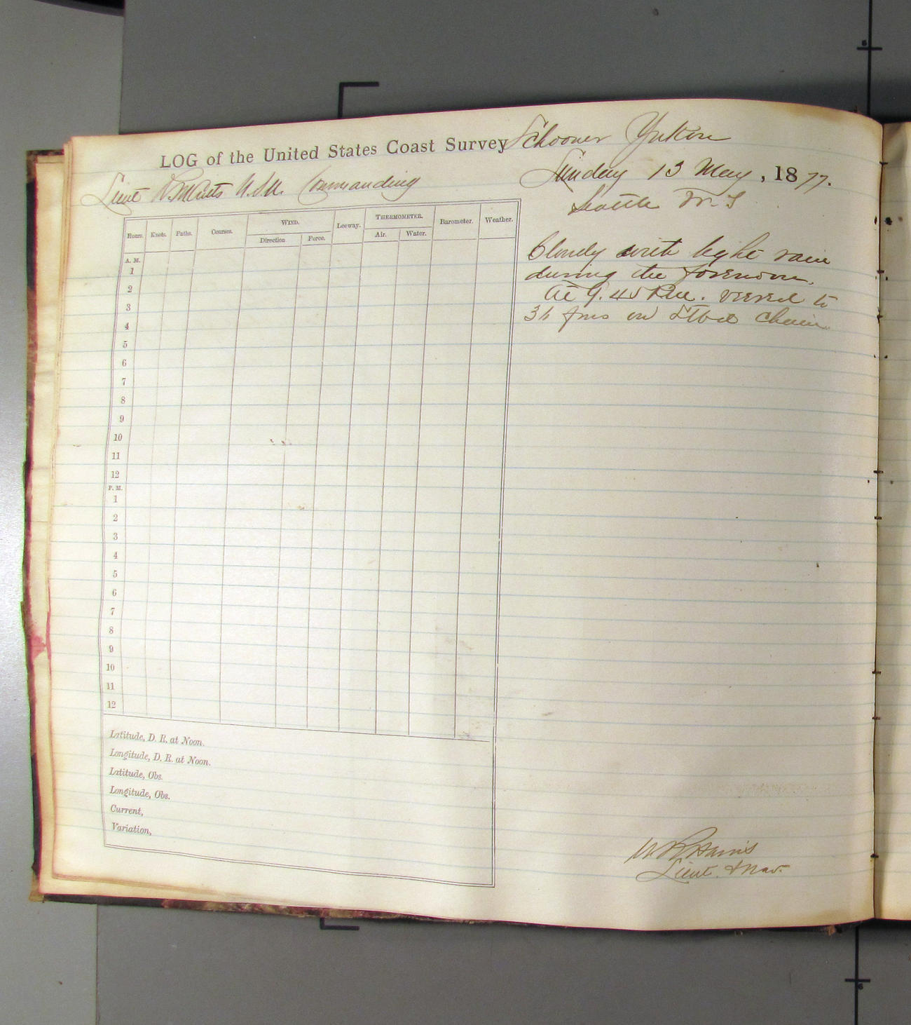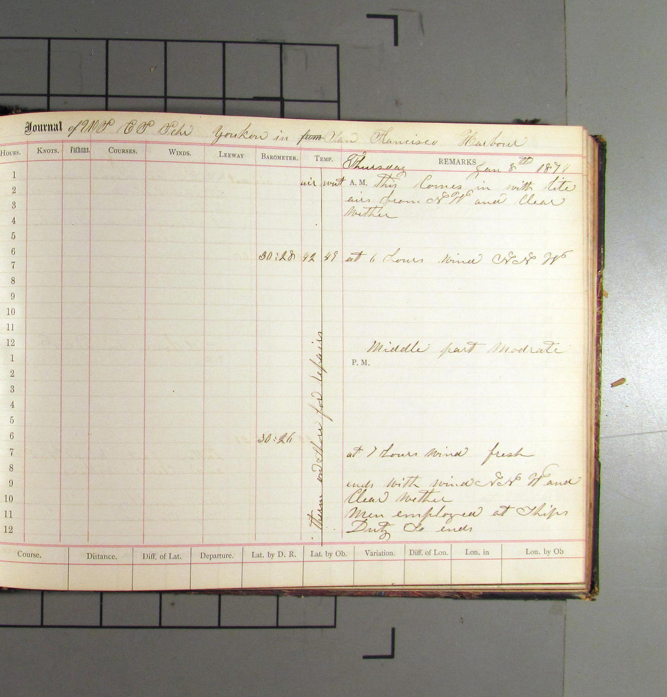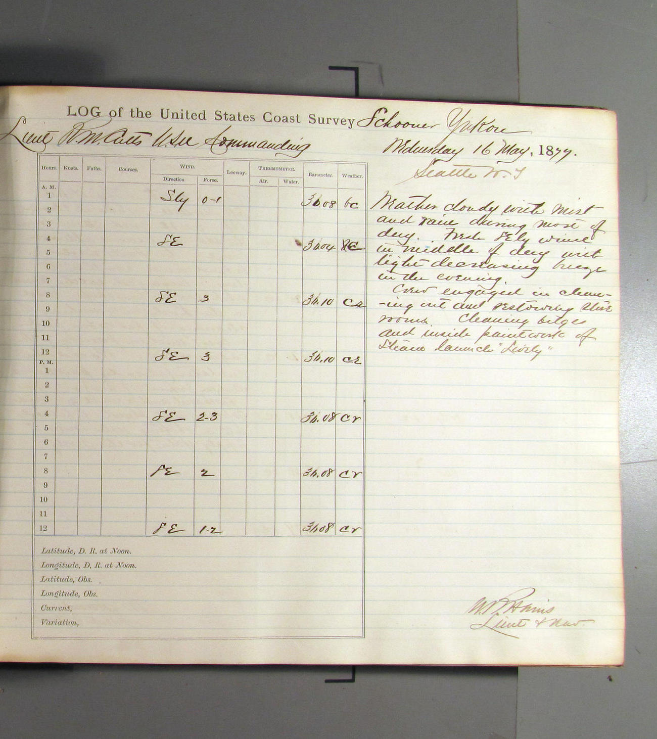 This day commences with light variable airs attended by light rain. Latter part wind fresh NW. Weather clear.