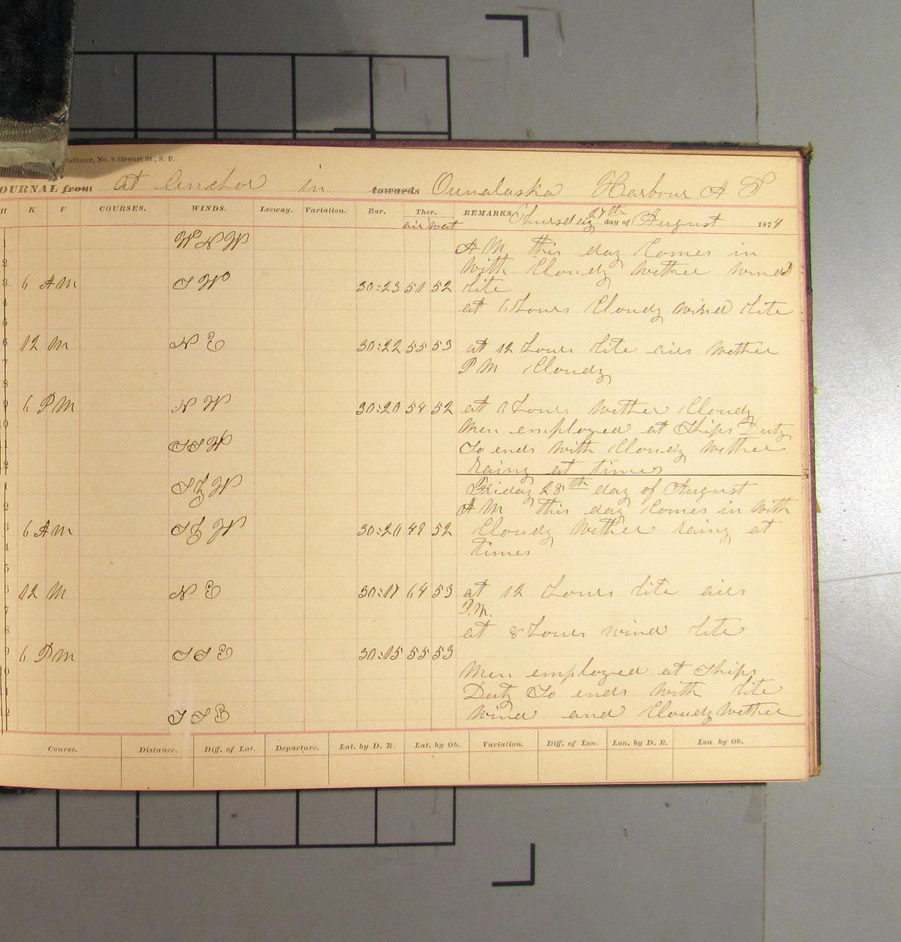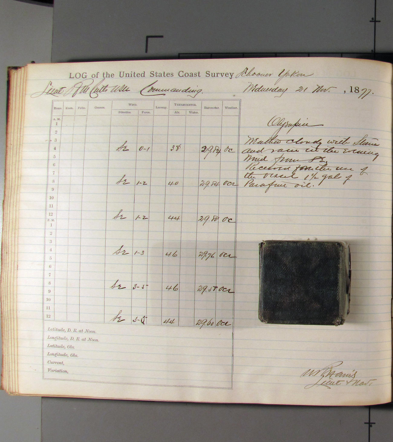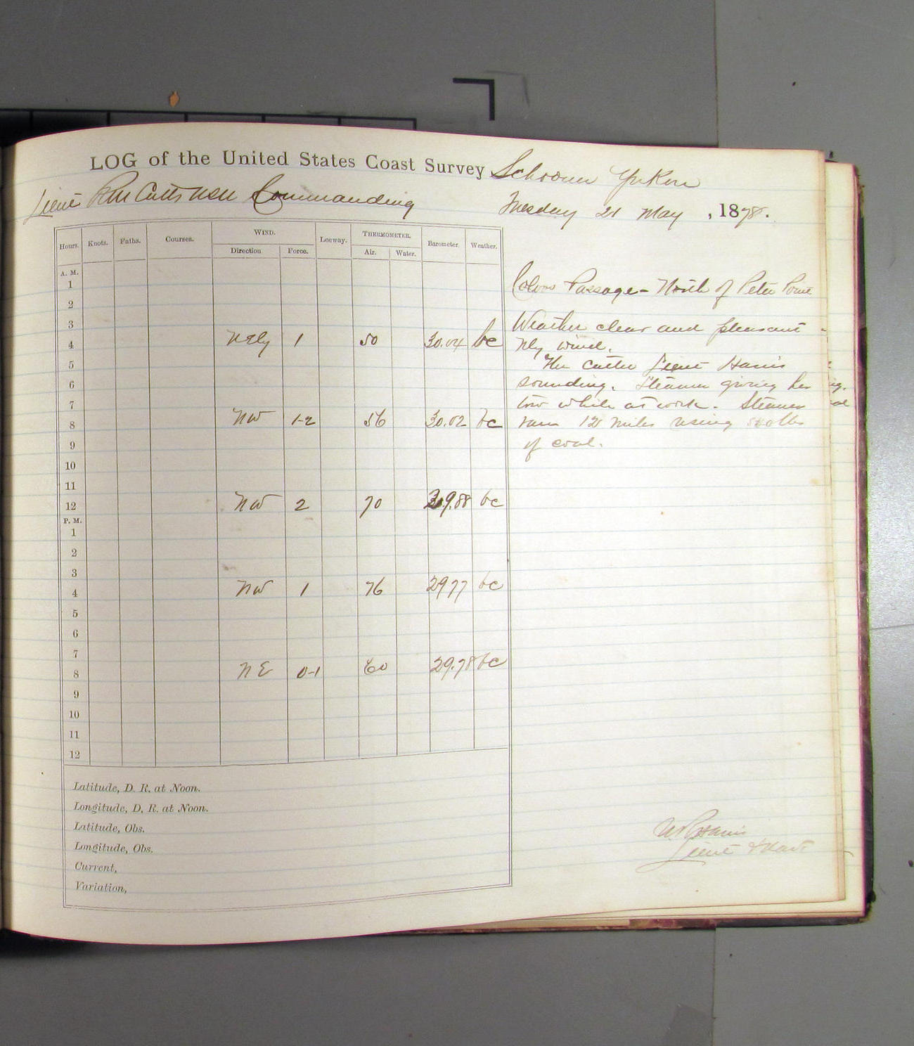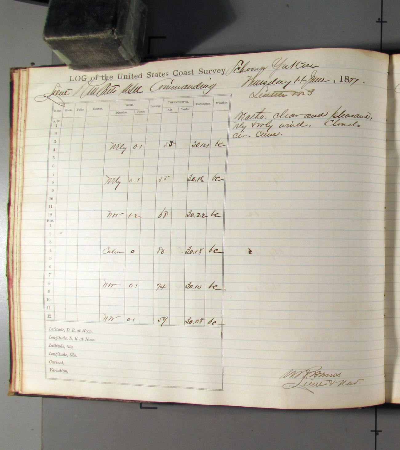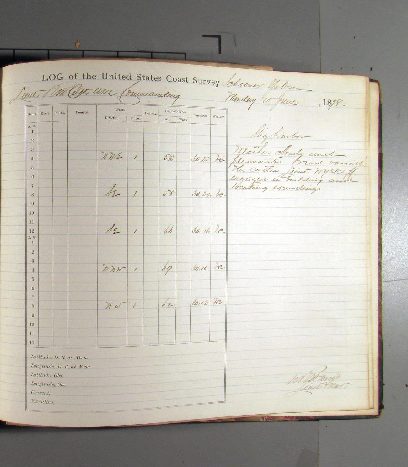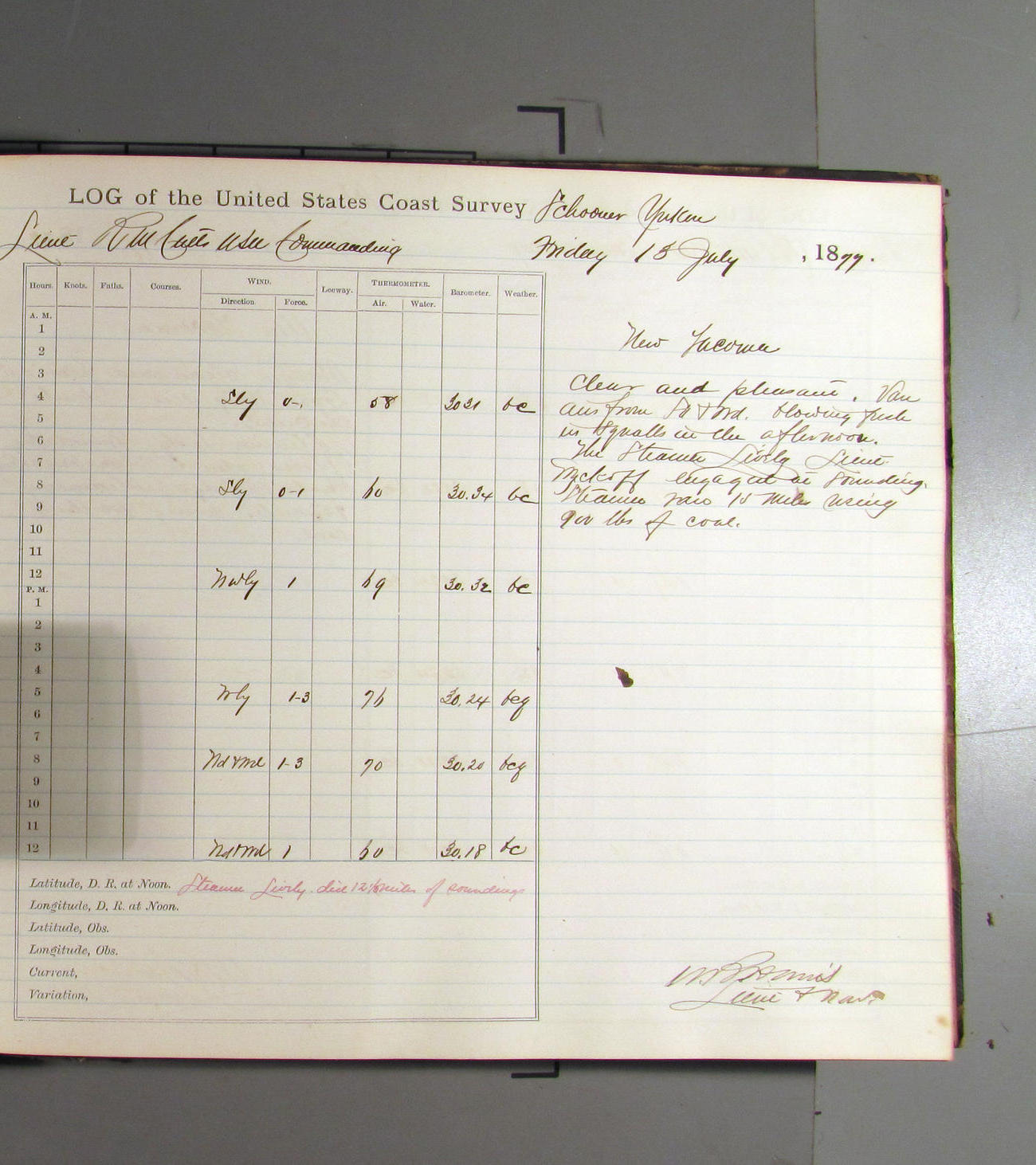 This day commences with light variable airs attended by light rain. Latter part wind fresh NW. Weather clear.