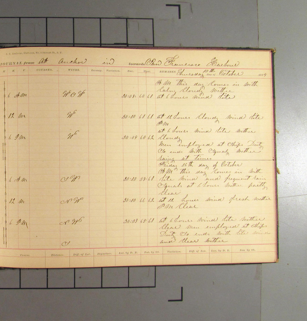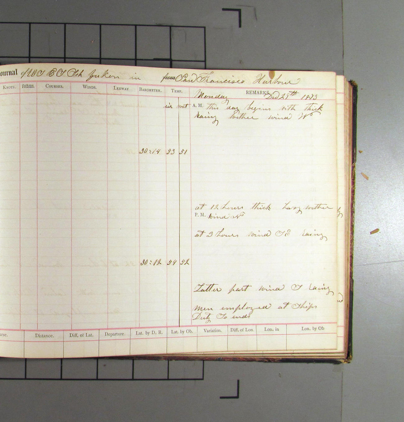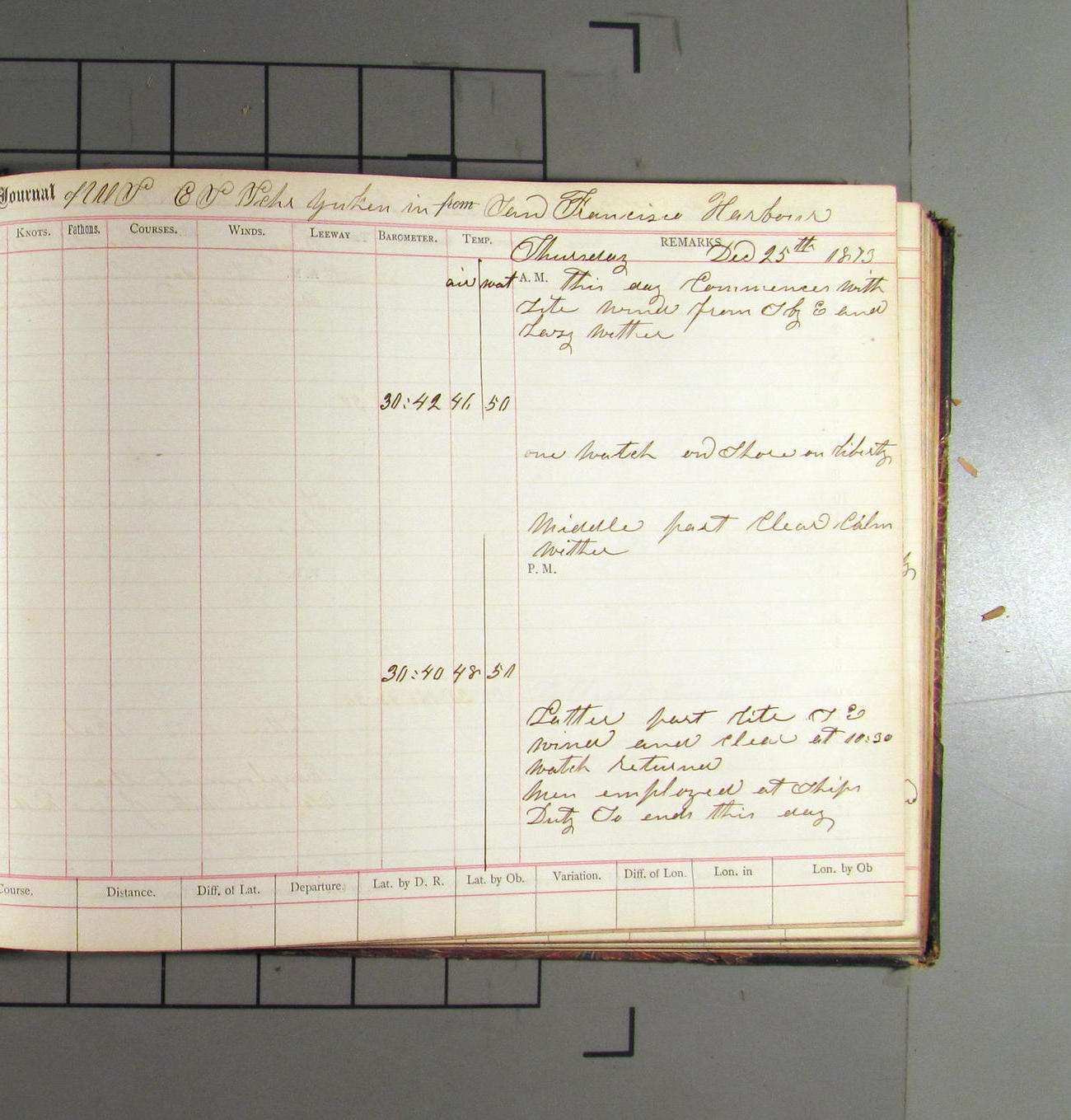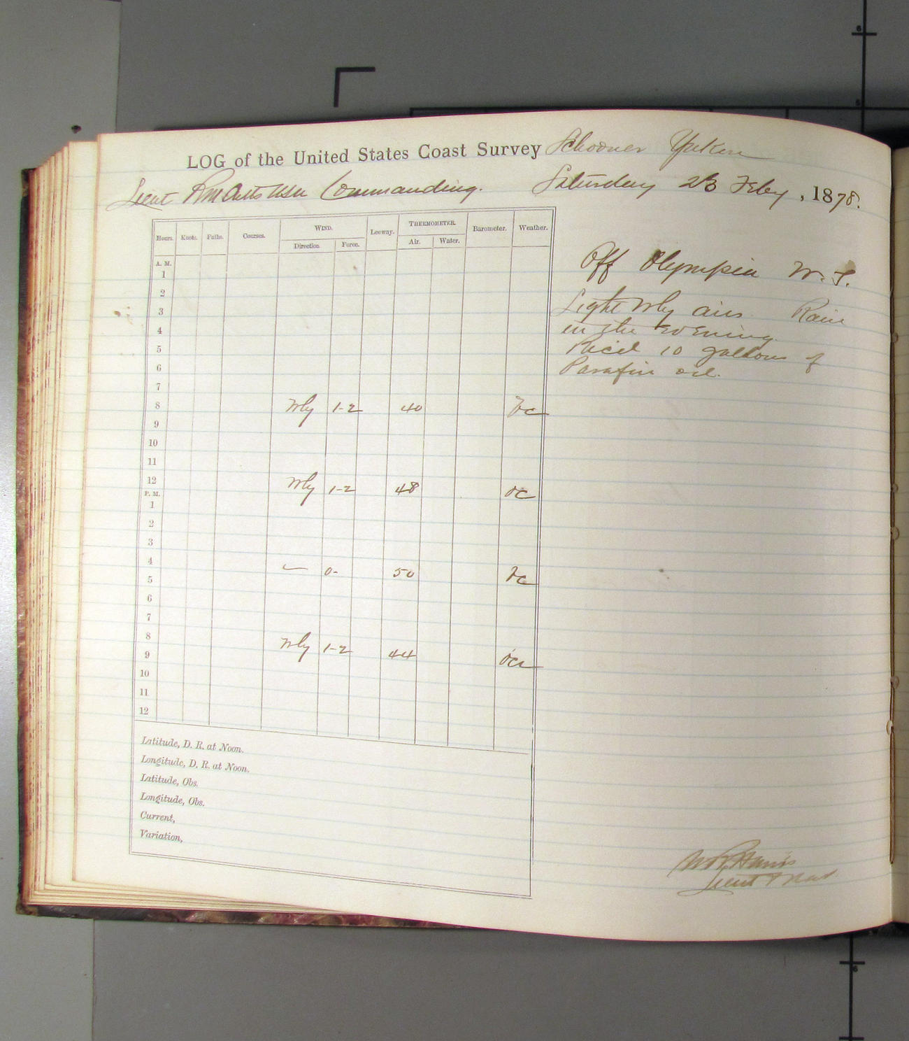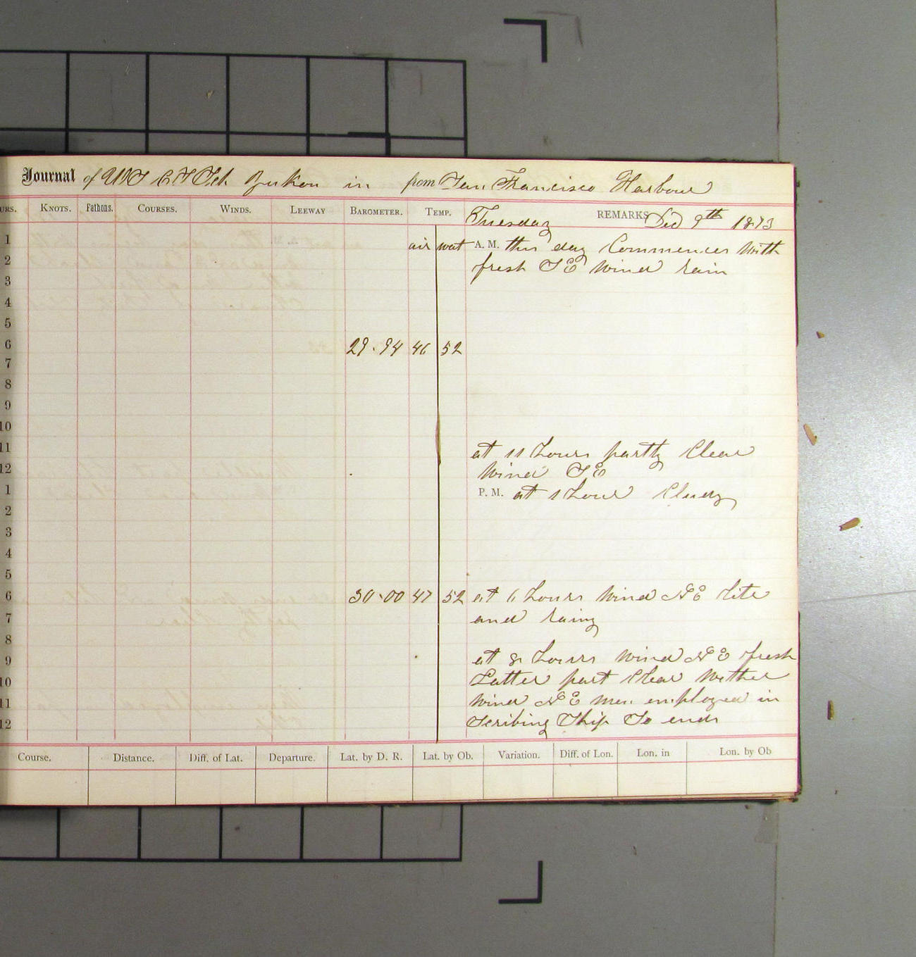 This day commences with light variable airs attended by light rain. Latter part wind fresh NW. Weather clear.