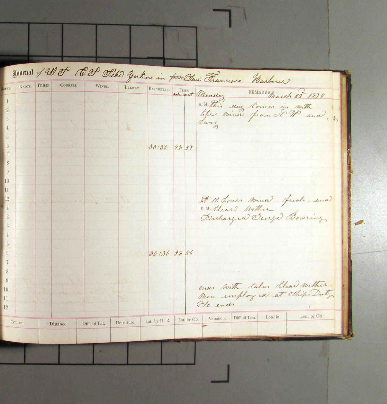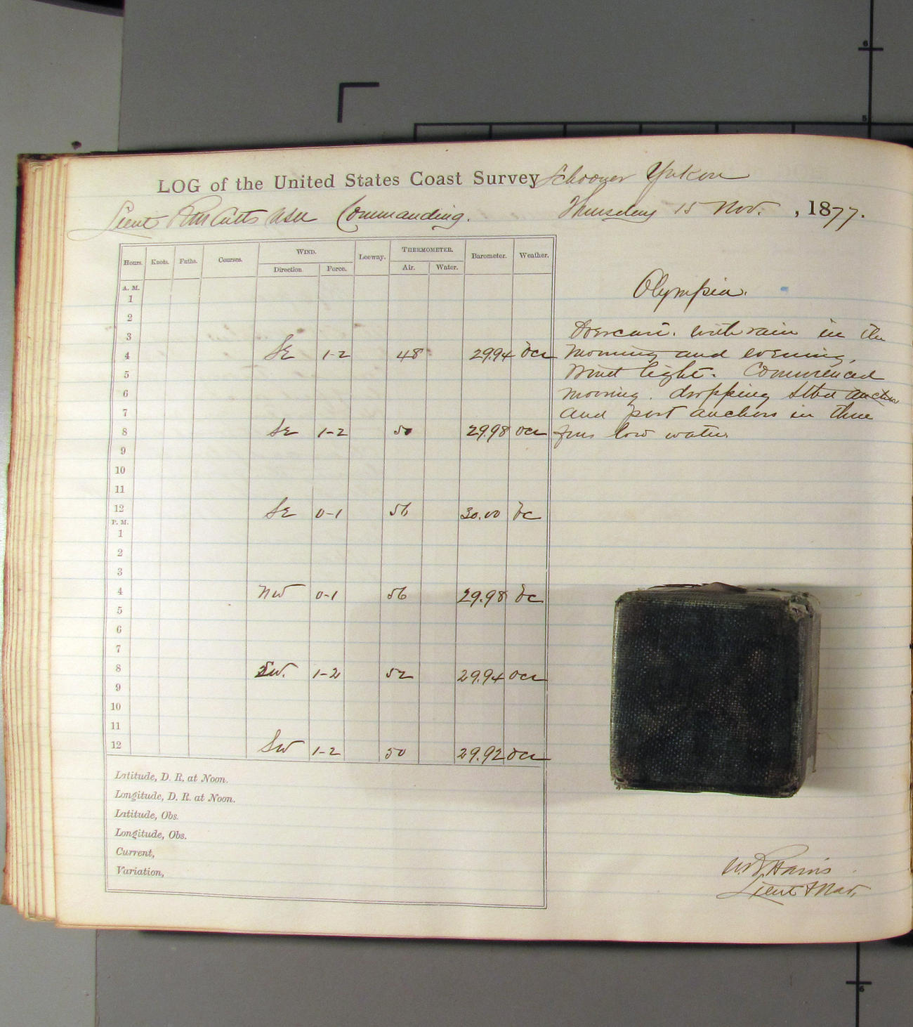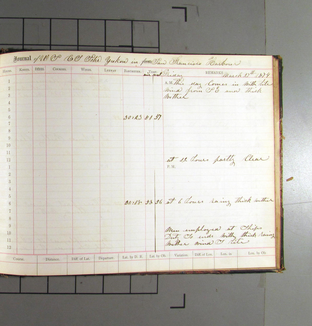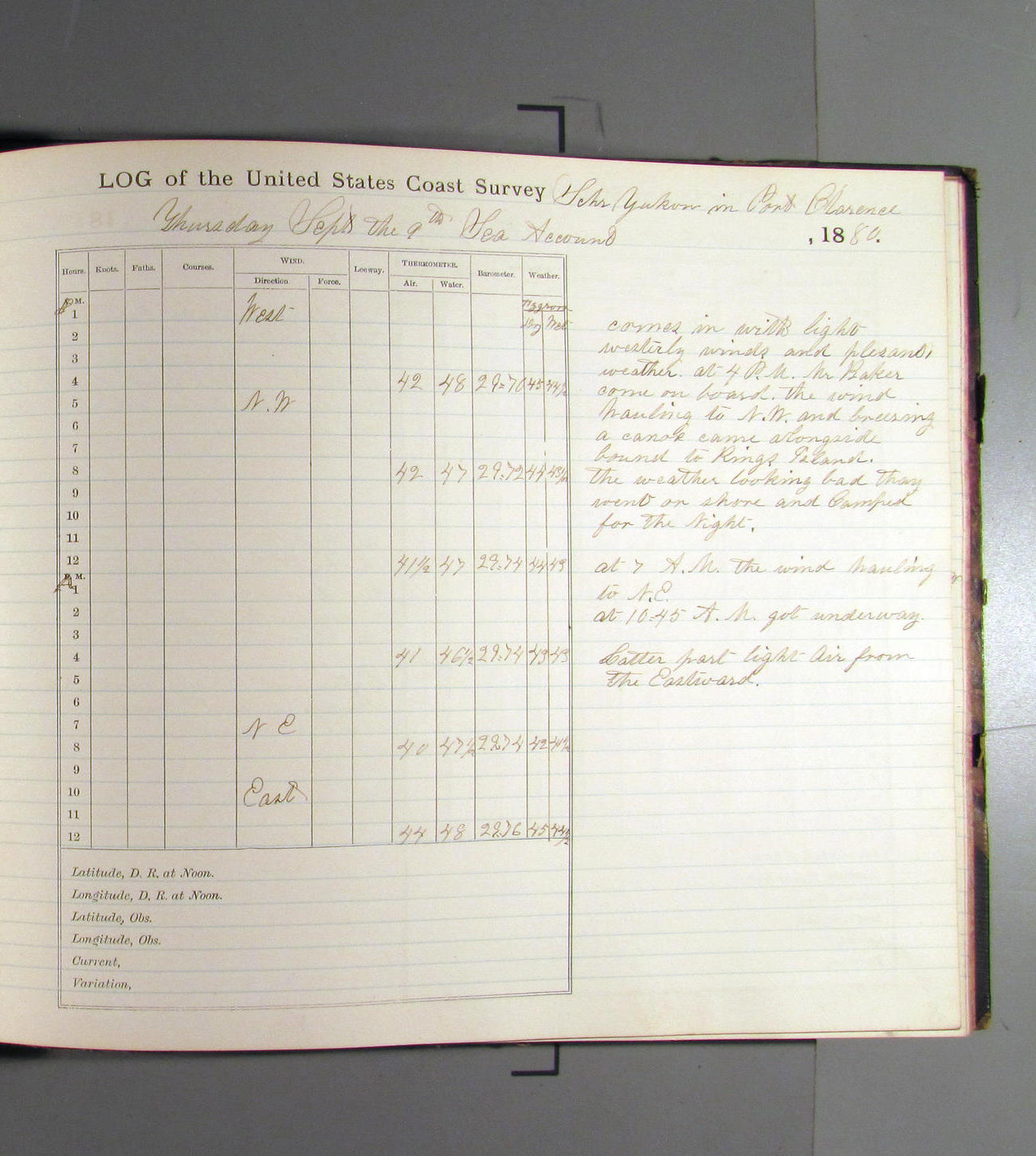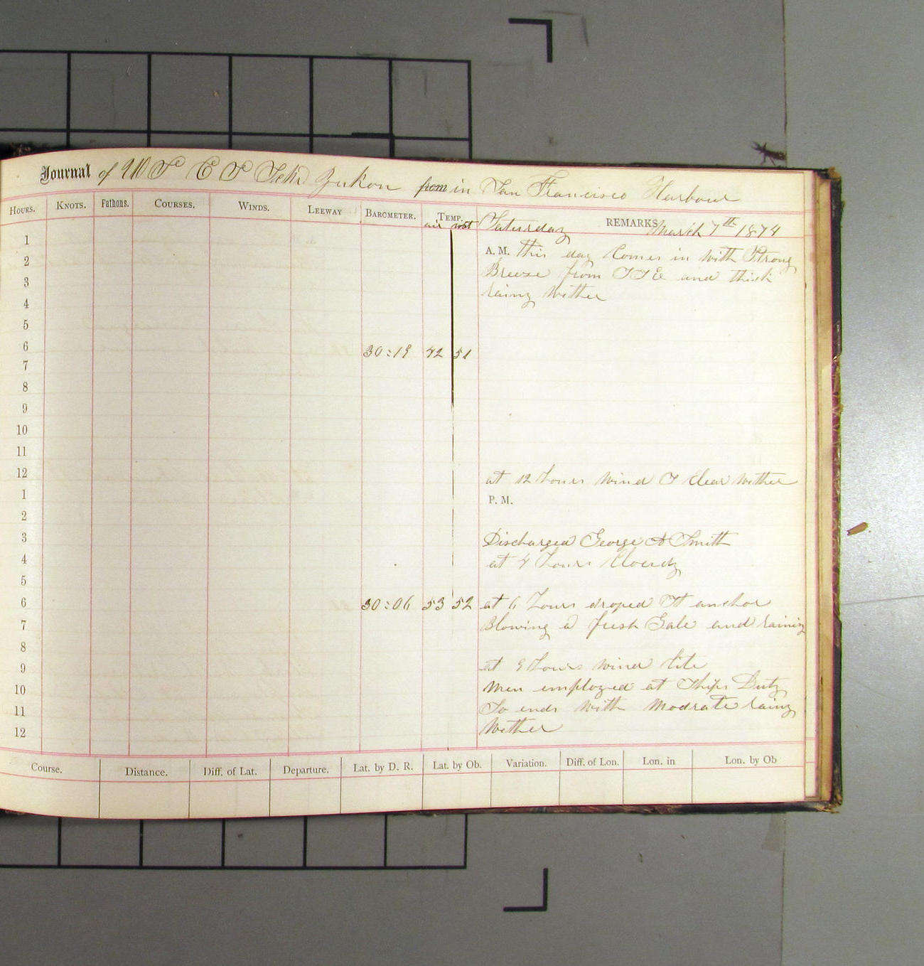 This day commences with light variable airs attended by light rain. Latter part wind fresh NW. Weather clear.