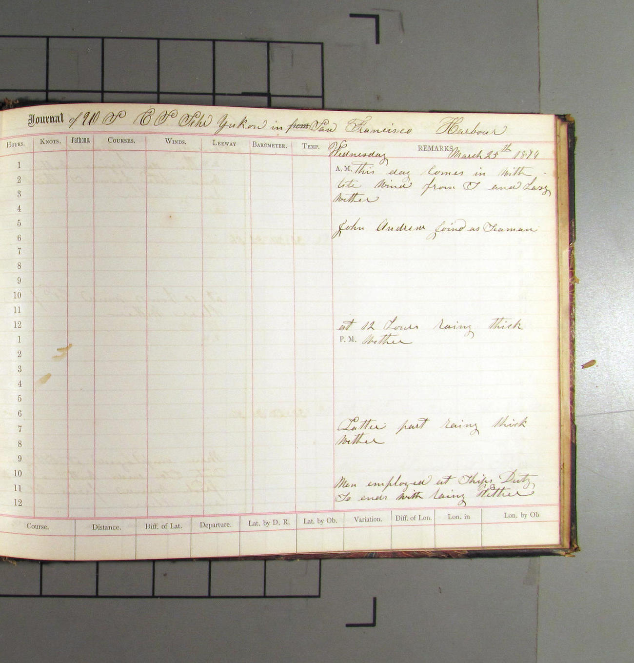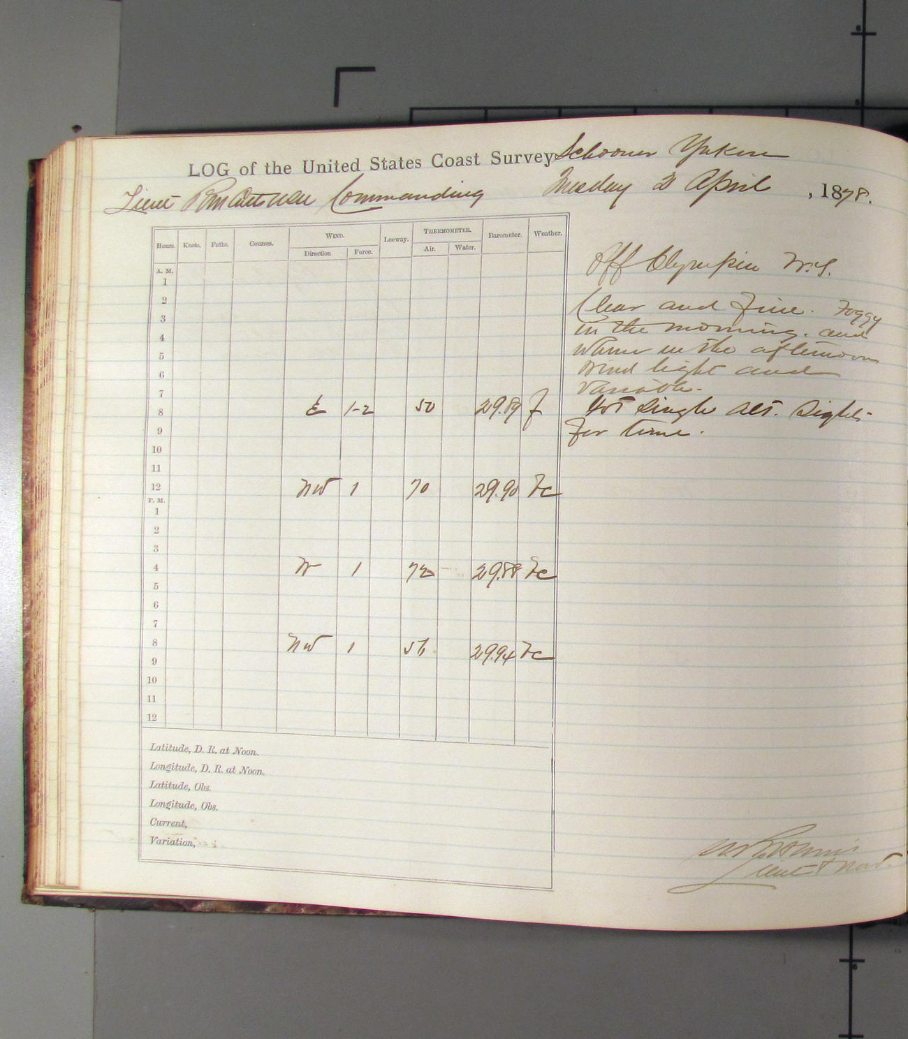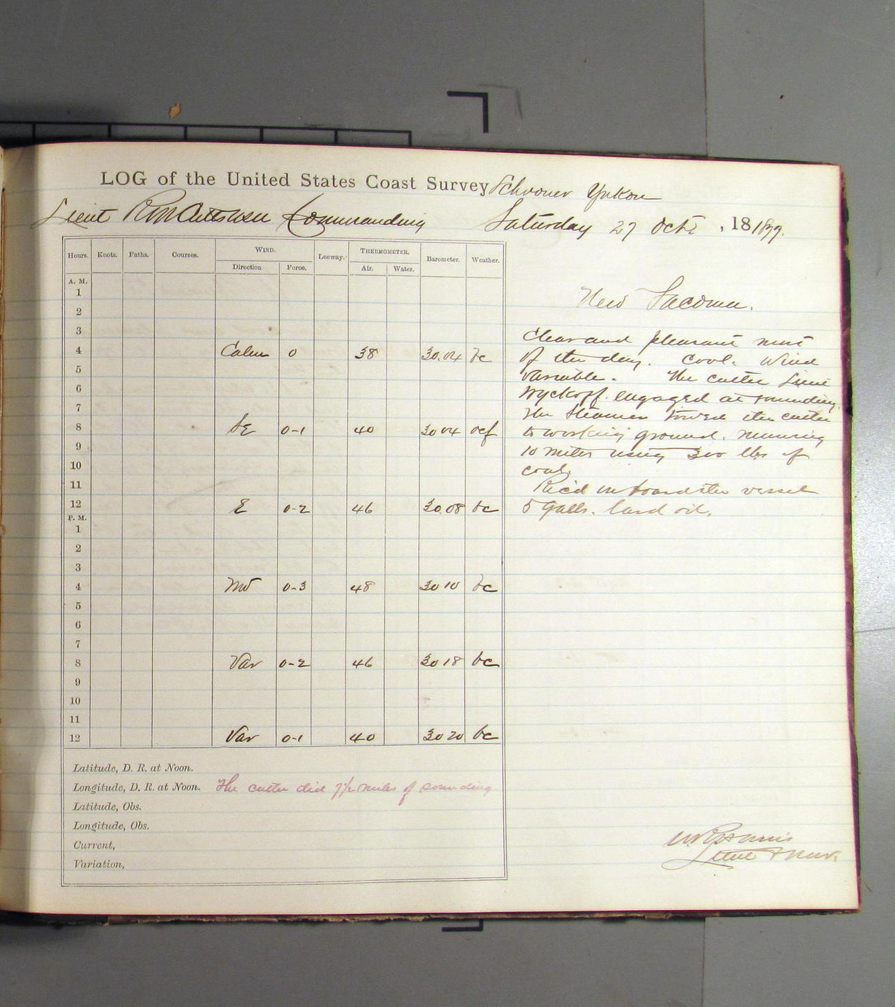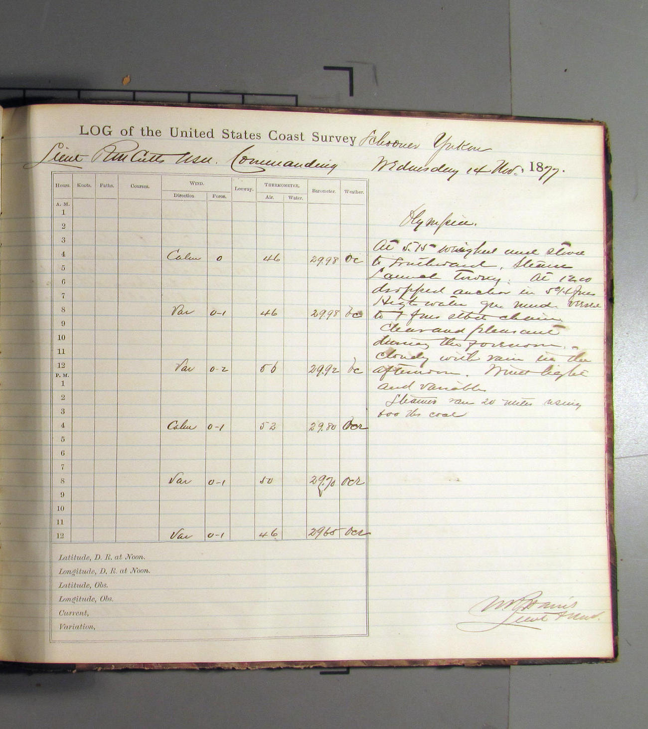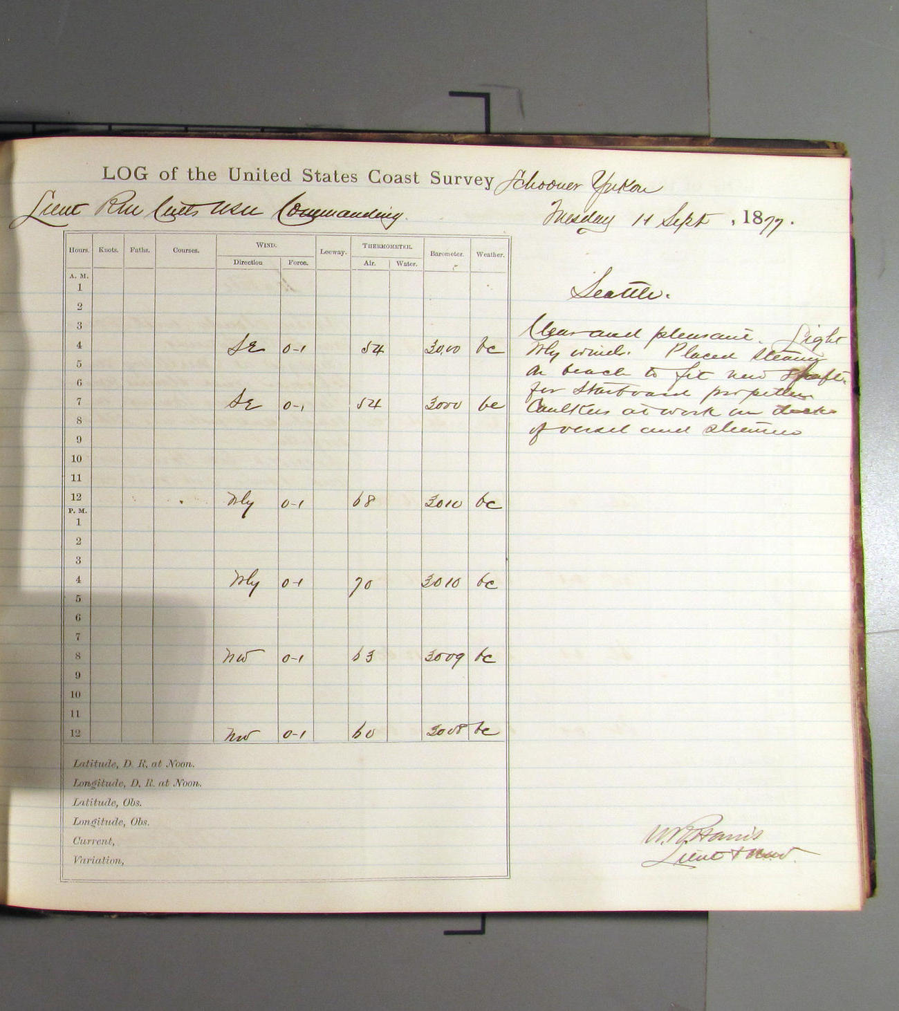 This day commences with light variable airs attended by light rain. Latter part wind fresh NW. Weather clear.