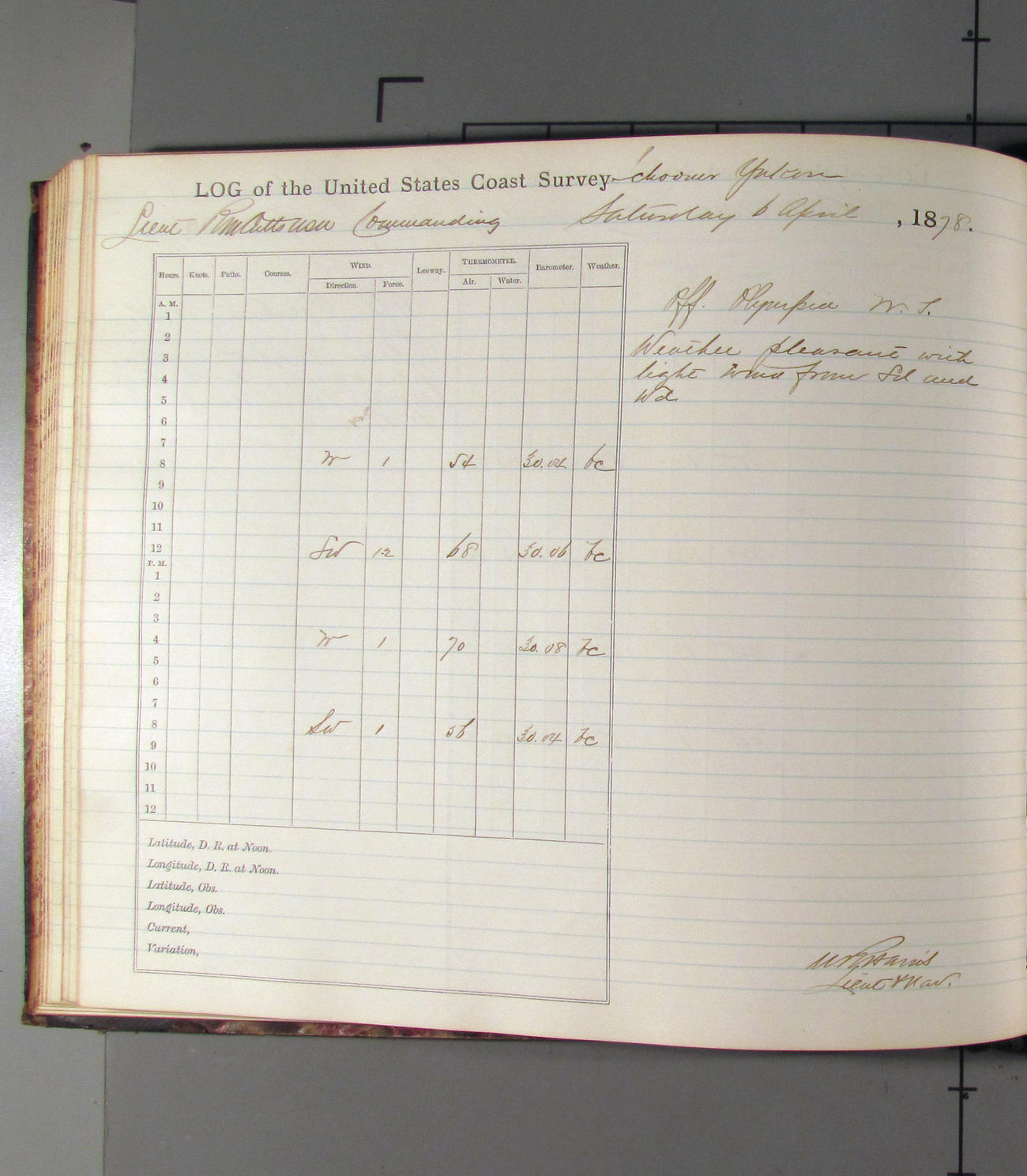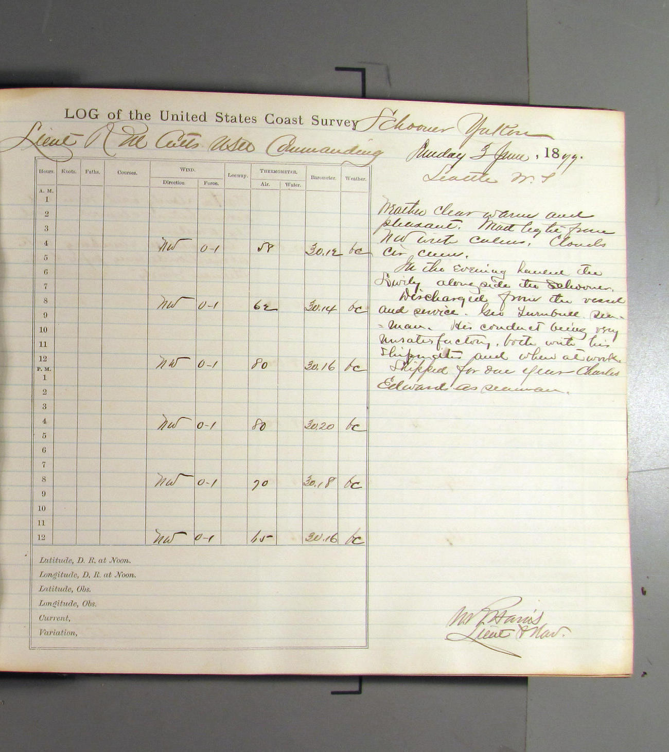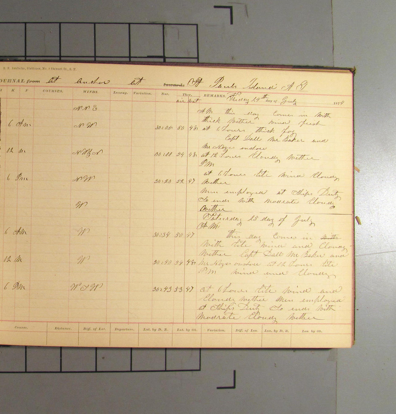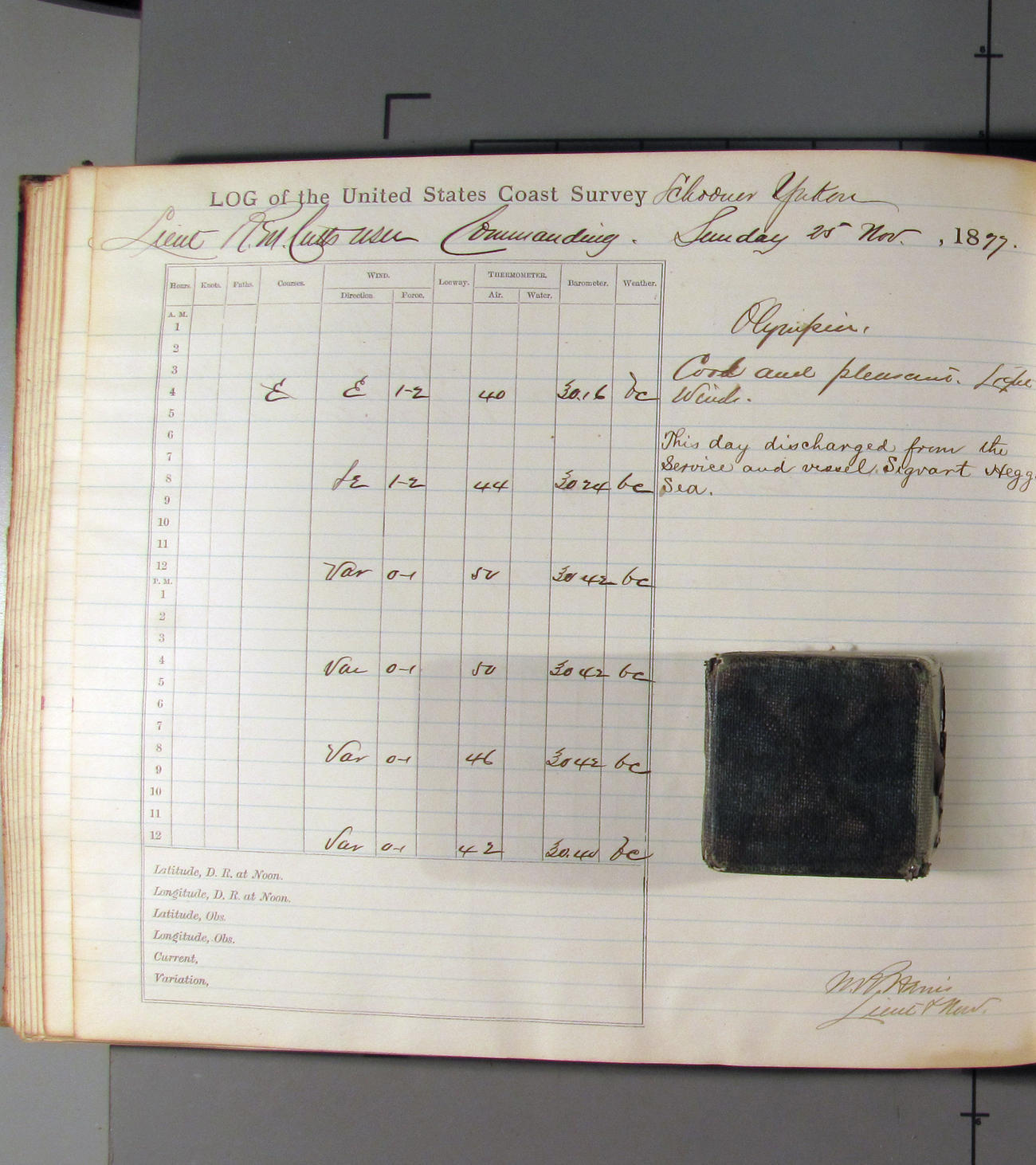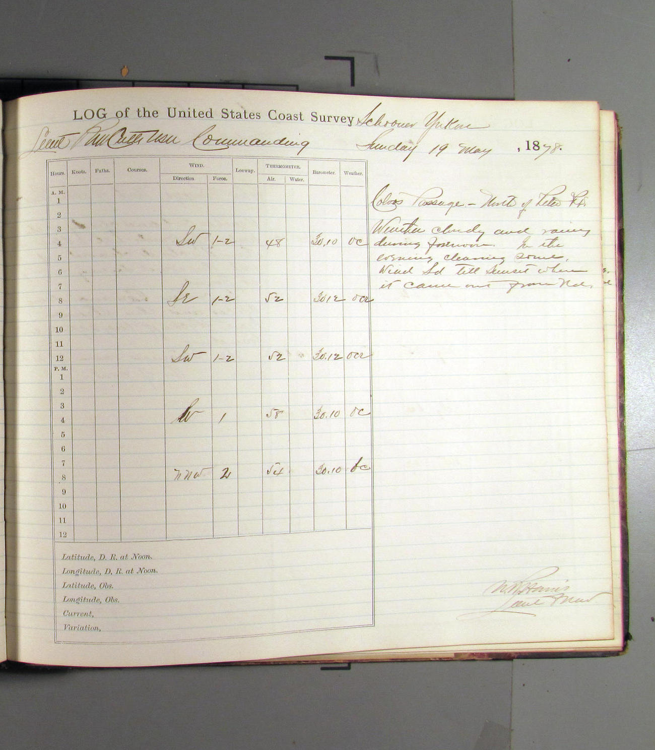 This day commences with light variable airs attended by light rain. Latter part wind fresh NW. Weather clear.